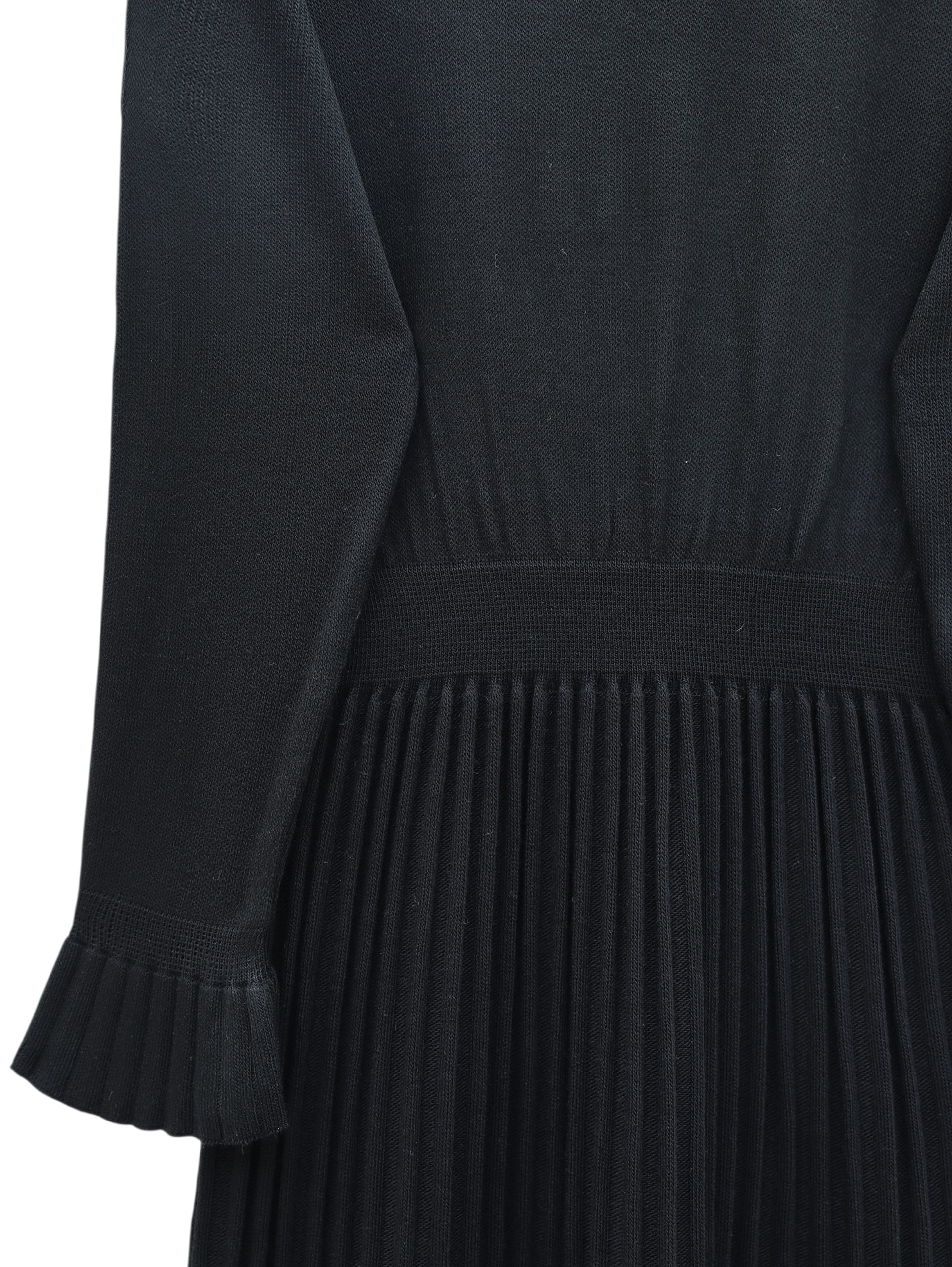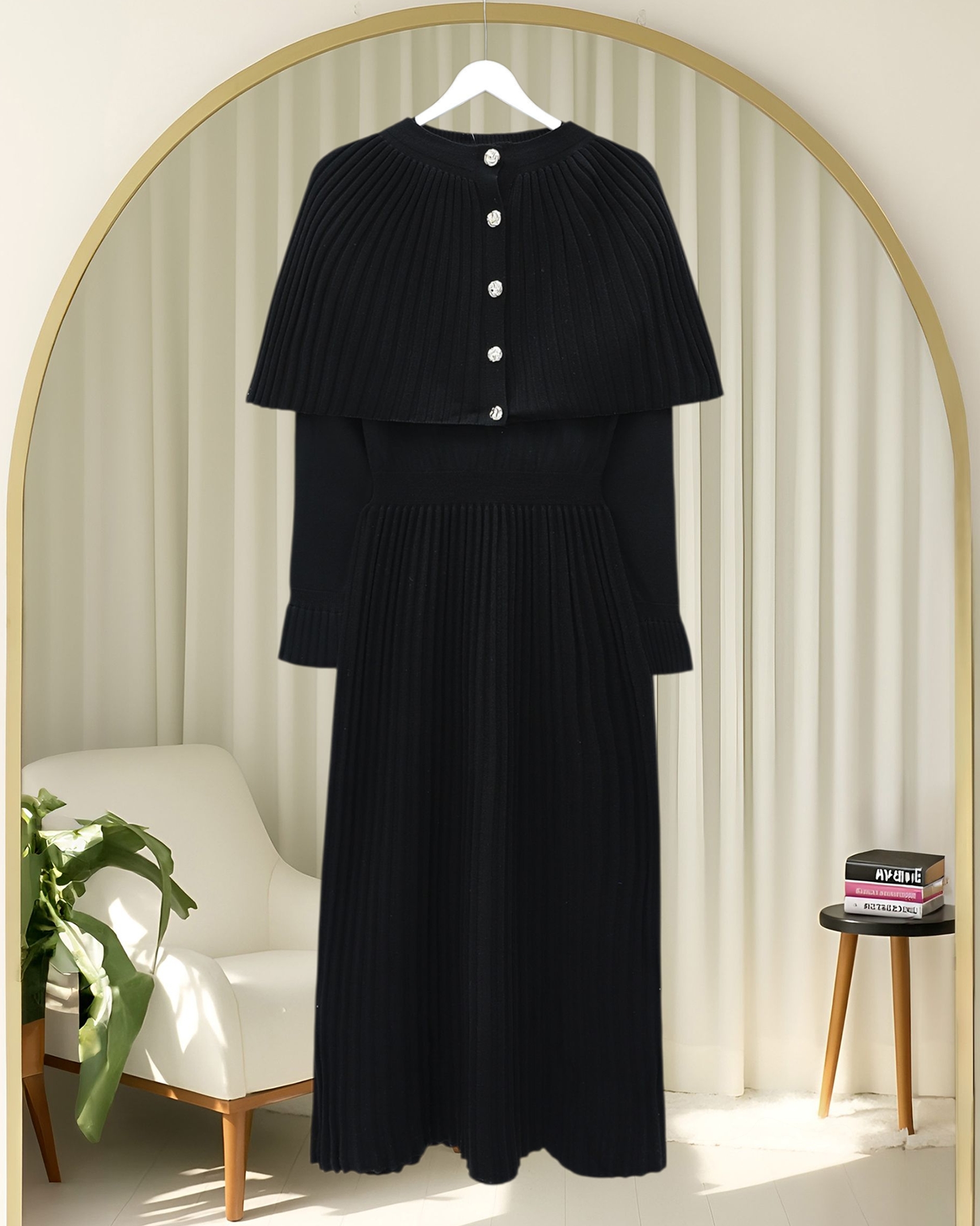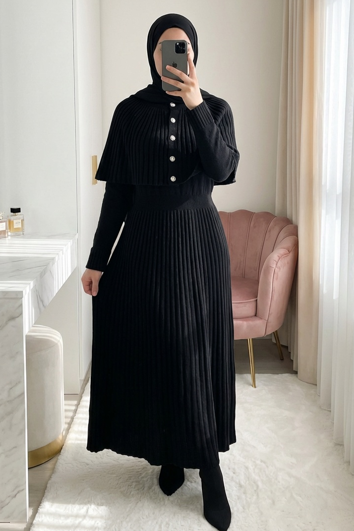 Long Knit Dress with Ribbed Skirt and Elastic Waistband and Cape Detail -Black