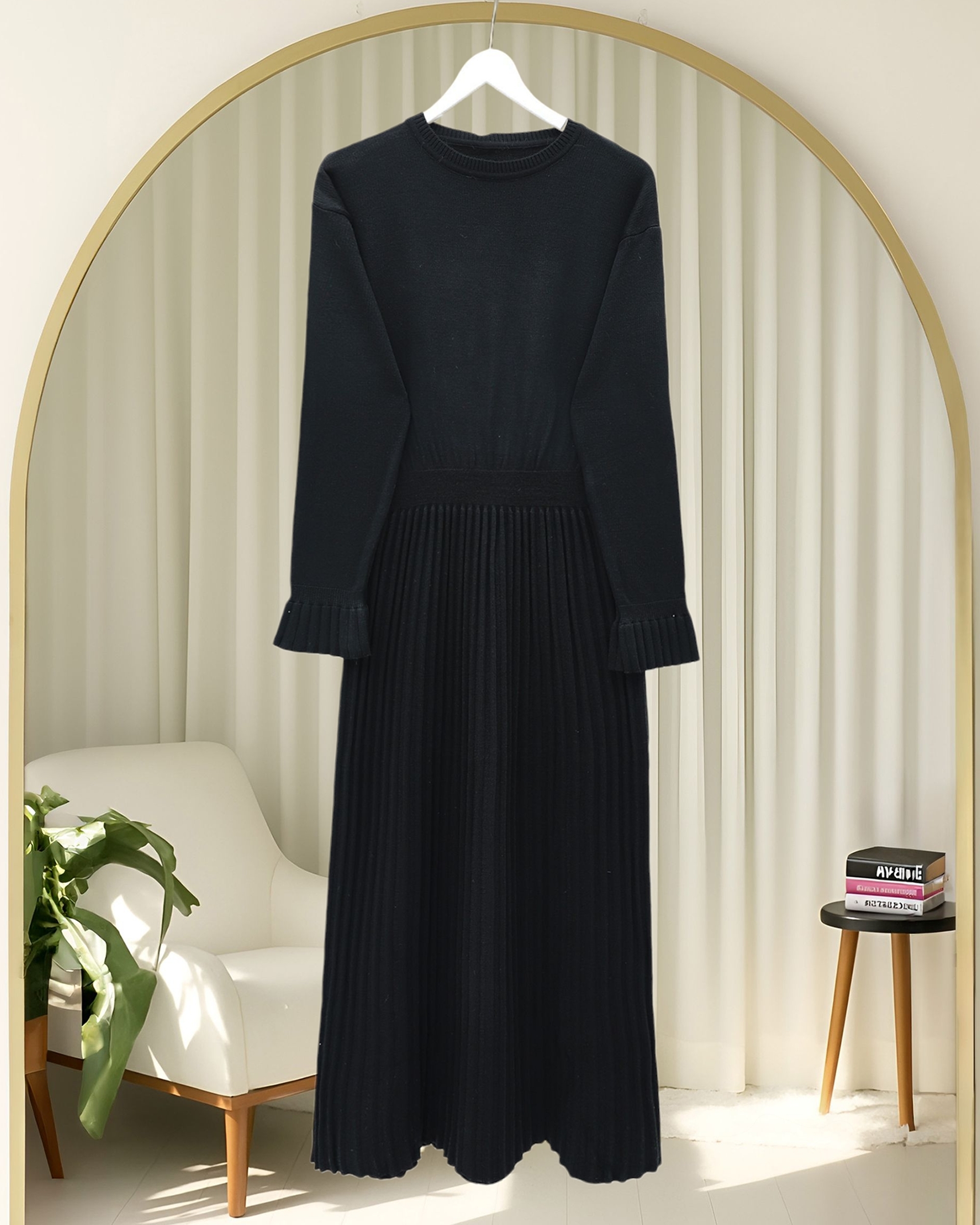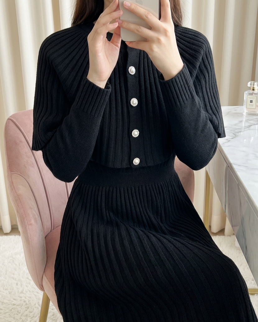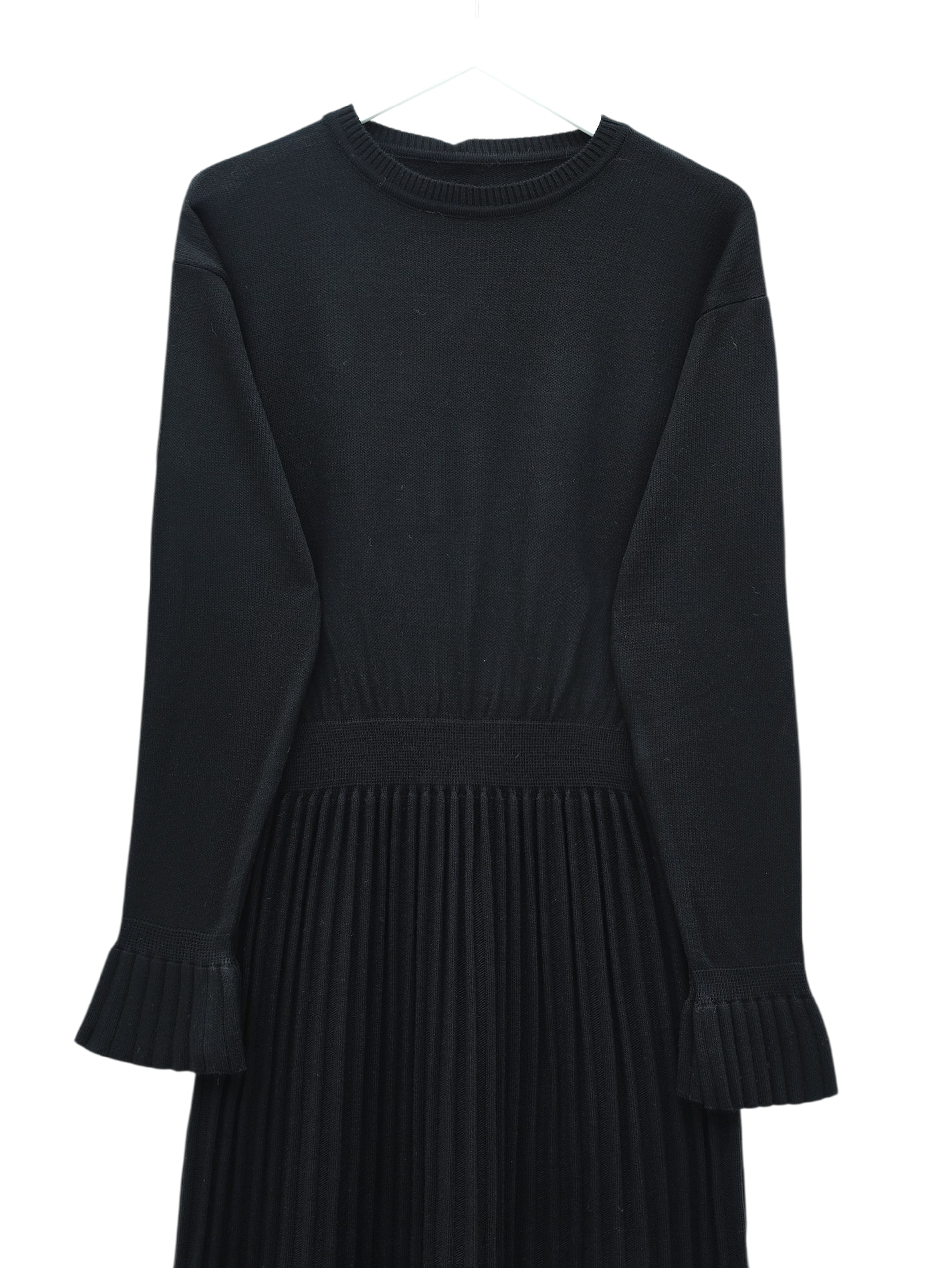Long Knit Dress with Ribbed Skirt and Elastic Waistband and Cape Detail -Black