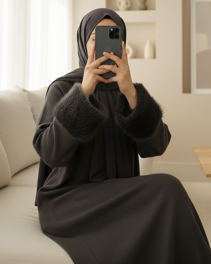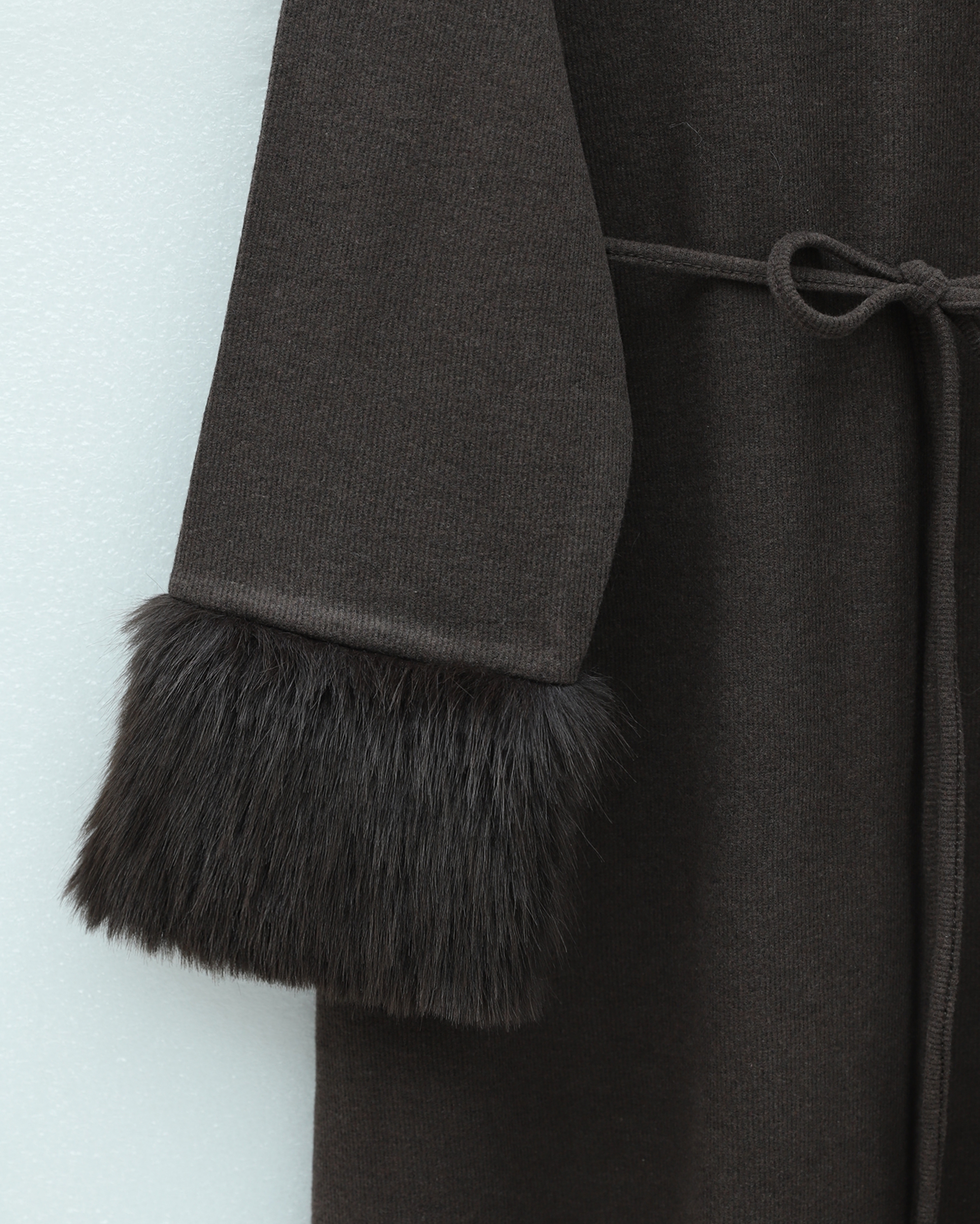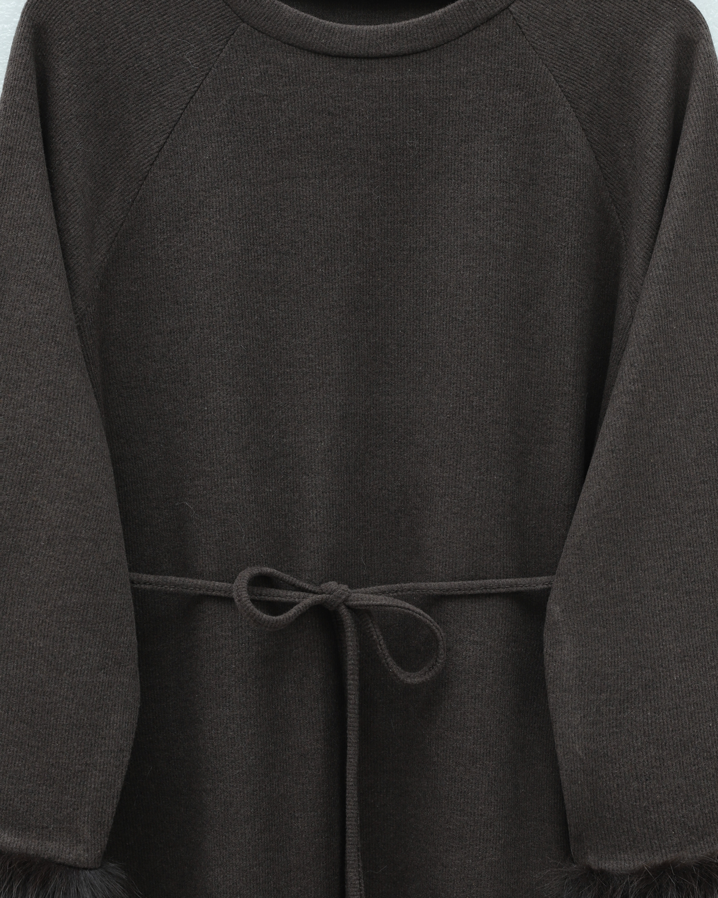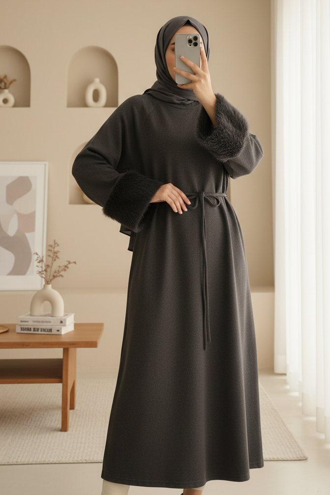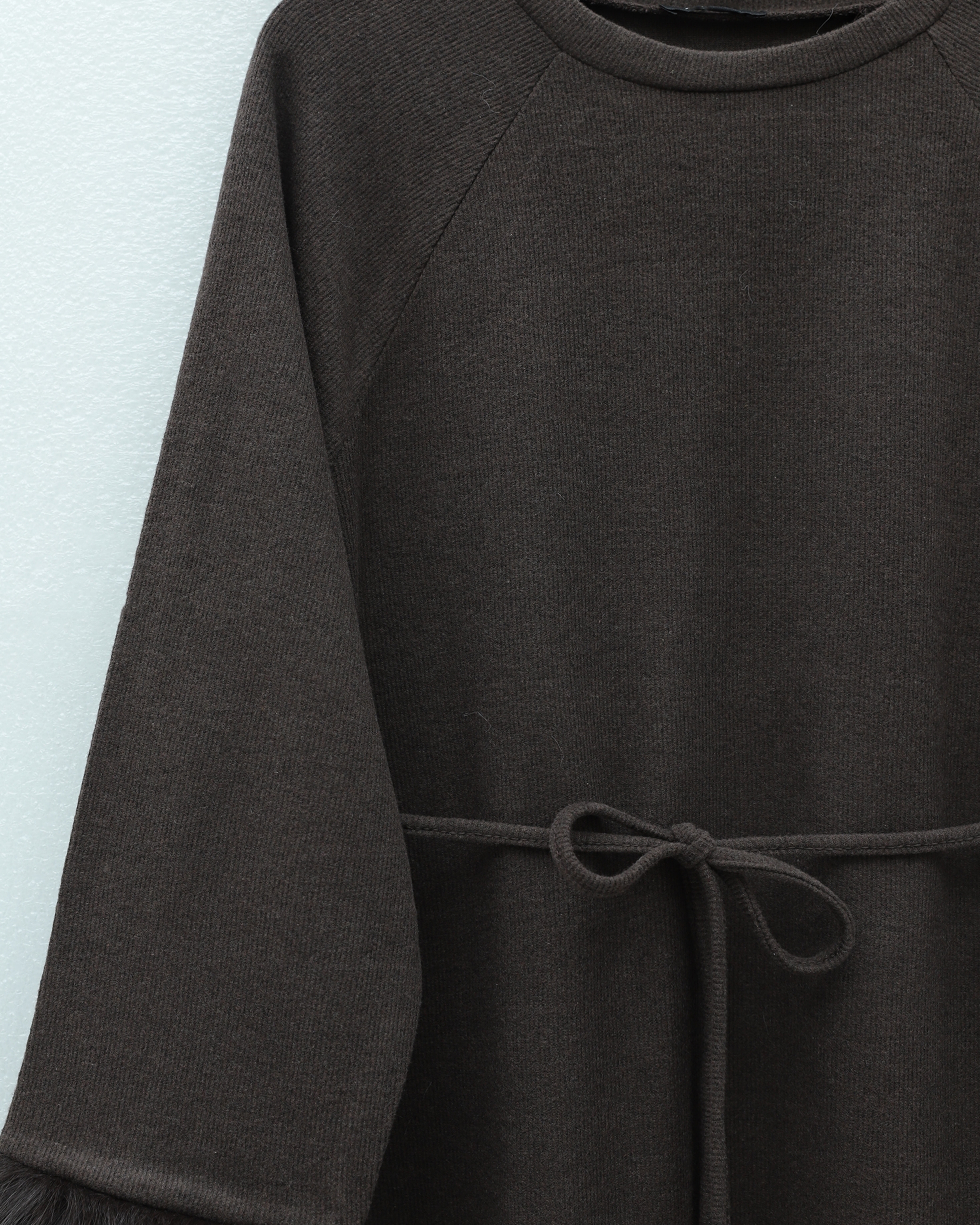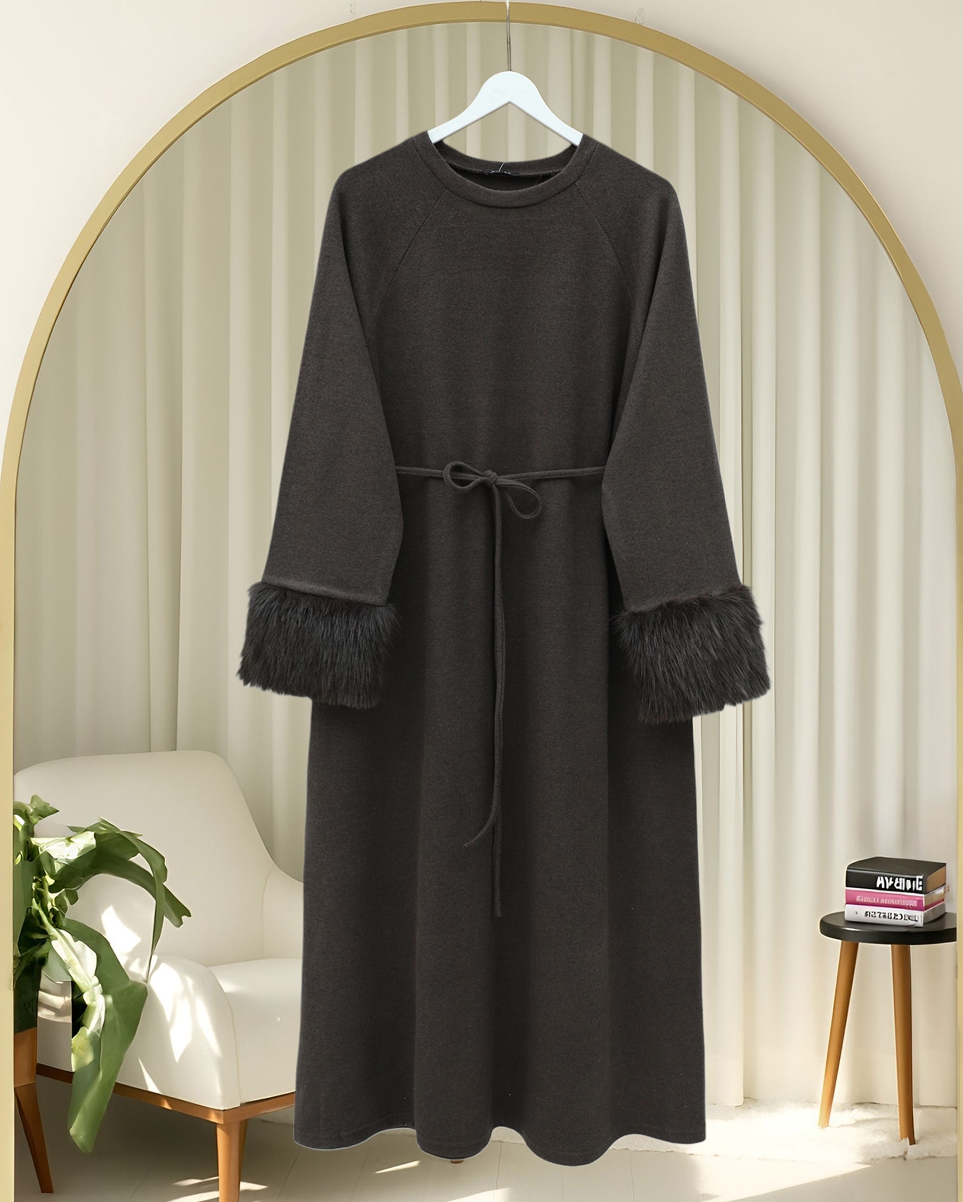 Long Selanik Dress with Tulle Sleeves and Tied Waist -Brown