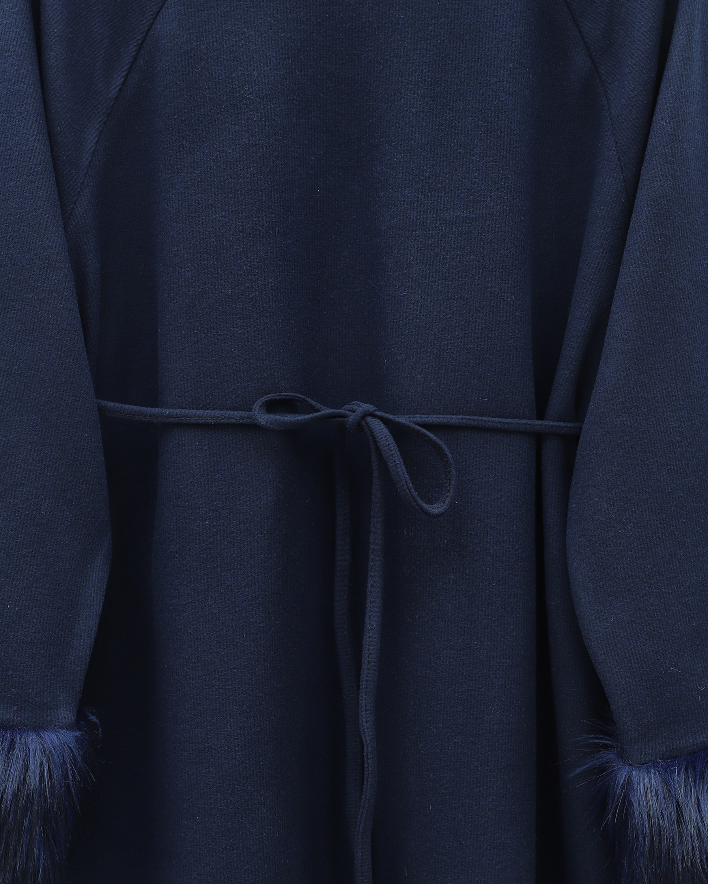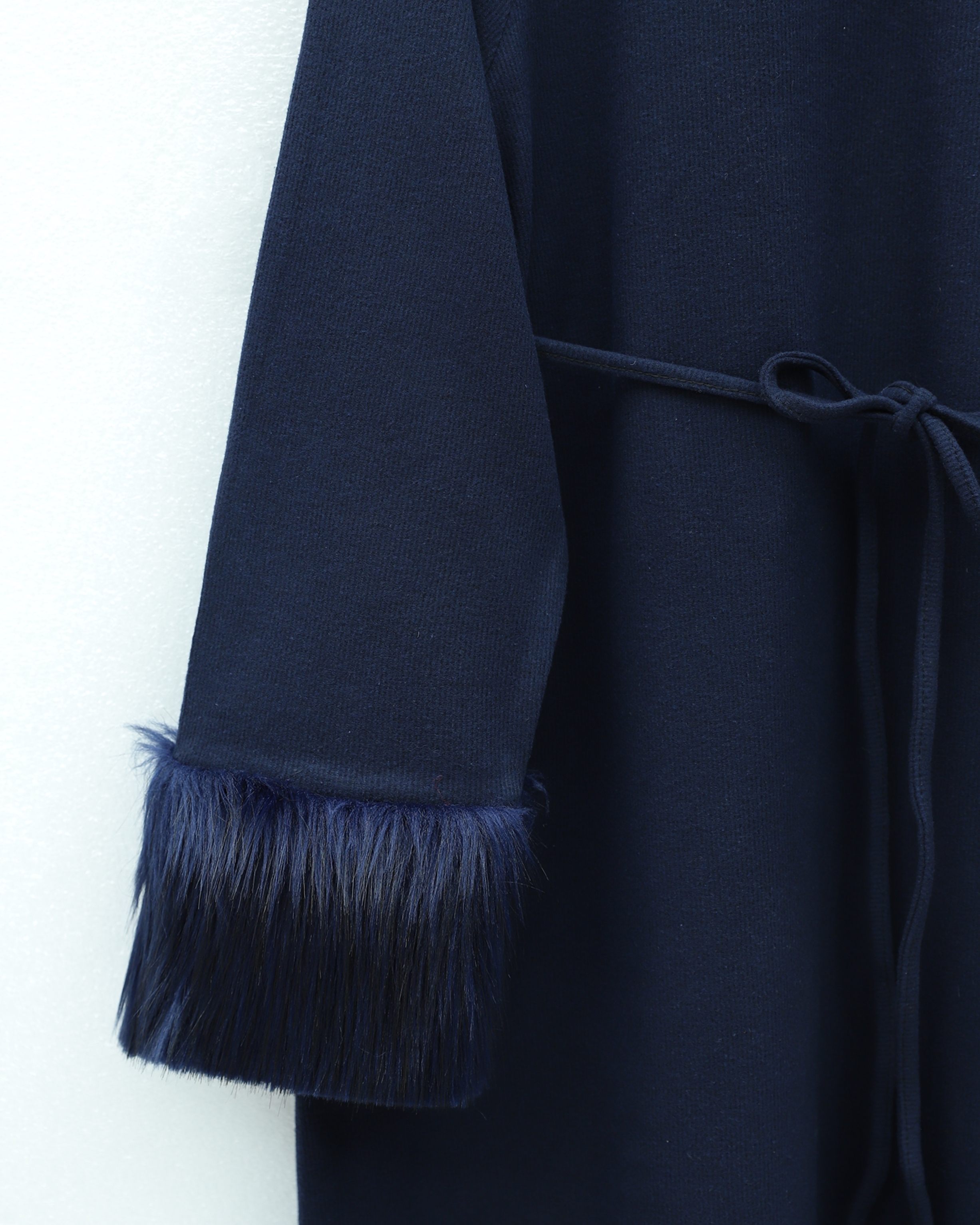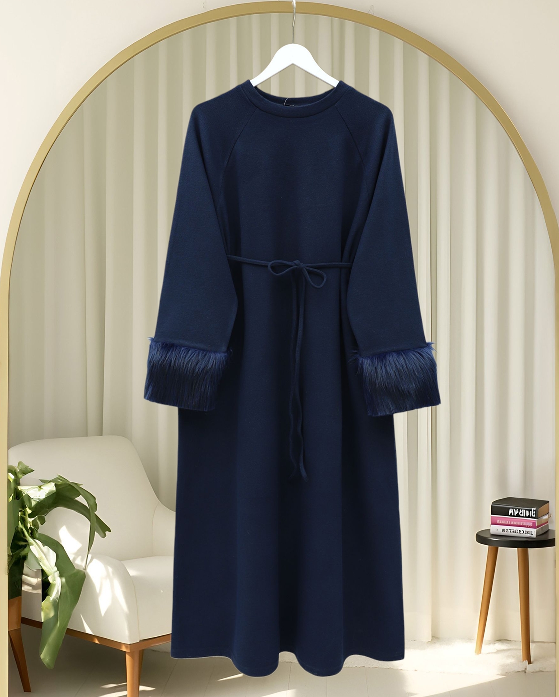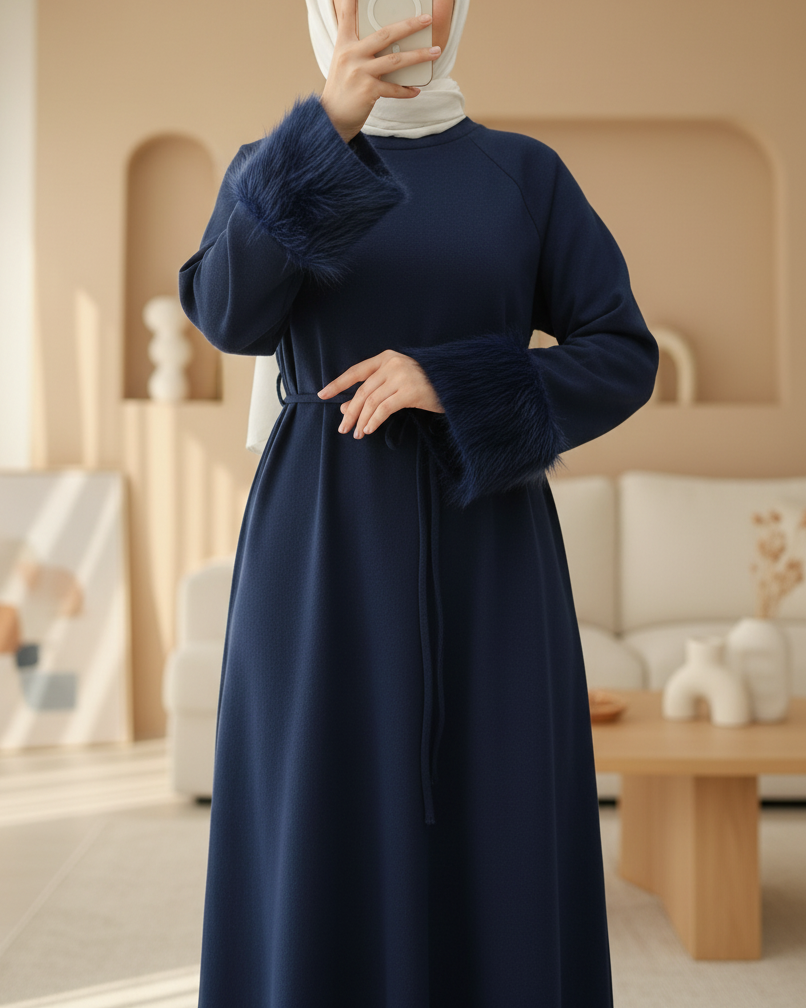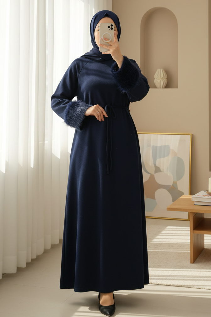 Long Selanik Dress with Tulle Sleeves and Tied Waist -Navy blue