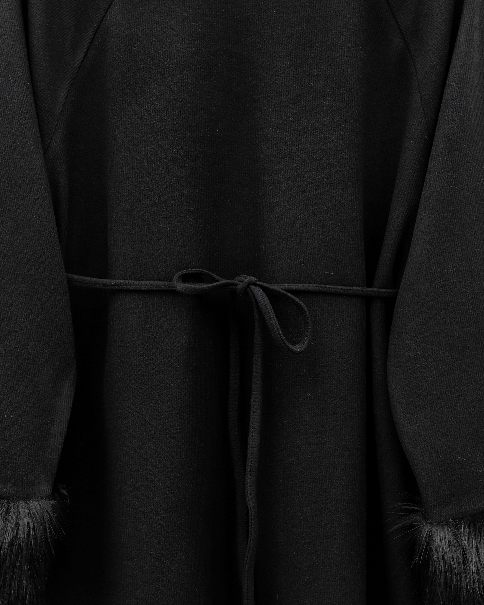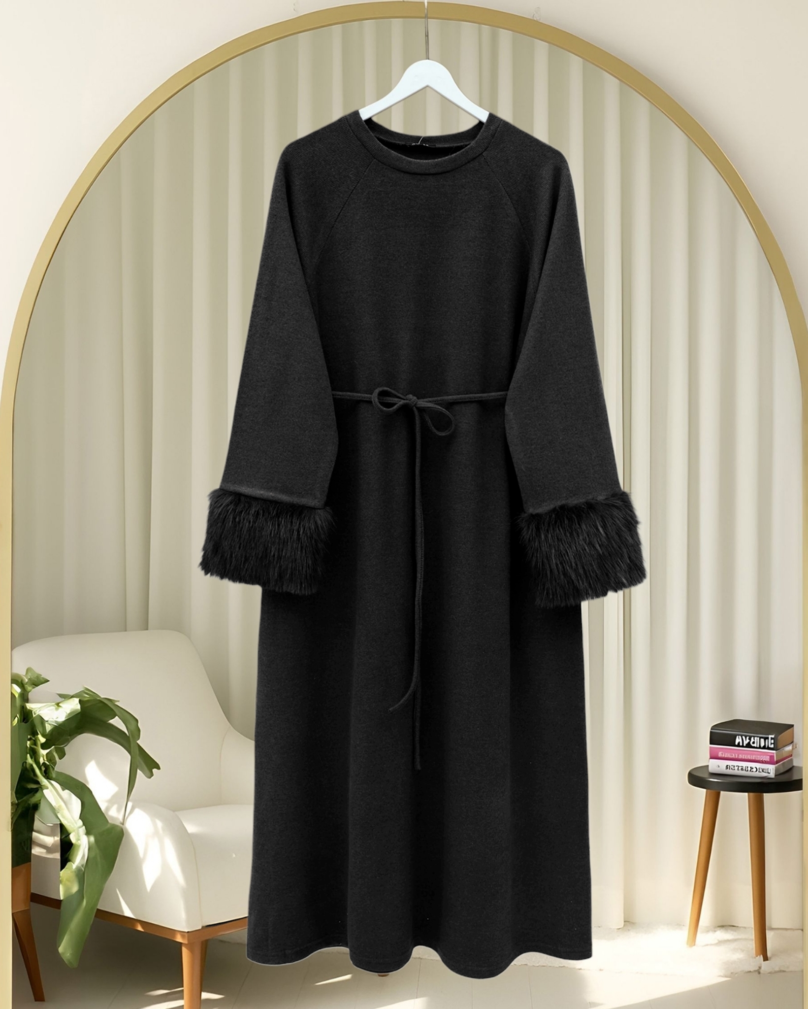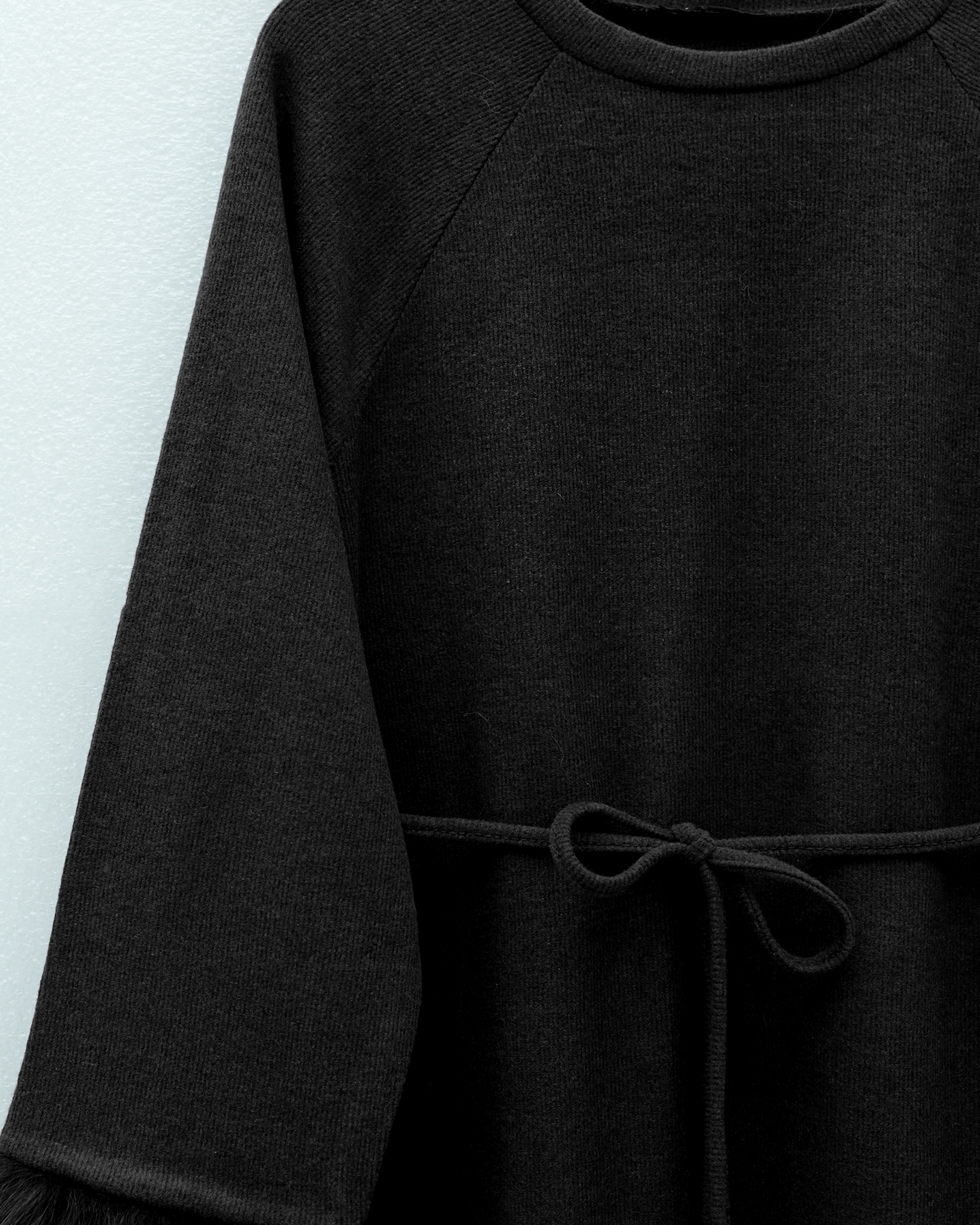 Long Selanik Dress with Tulle Sleeves and Tied Waist -Black