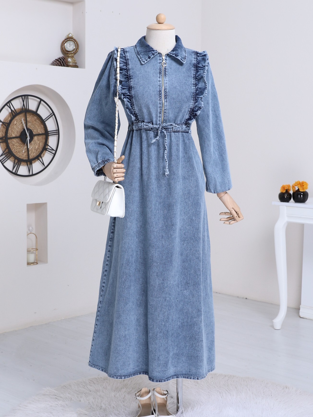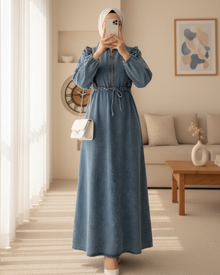 The ruffle-detail, belted denim dress offers an elegant and comfortable style. The ruffles and cinched waist add a feminine touch to the dress. Perfect for both everyday wear and special occasions, this dress is an ideal choice for those seeking a combination of style and comfort. Available in different sizes to fit all body types.