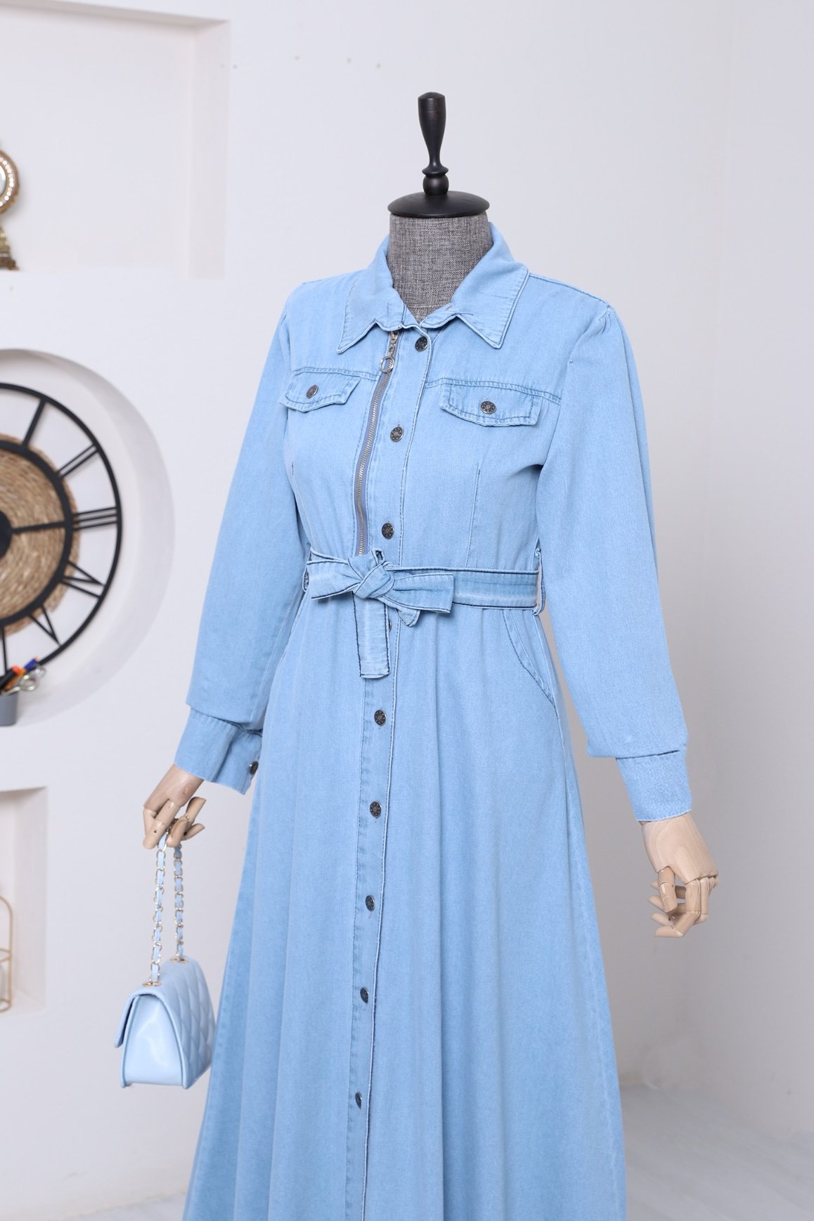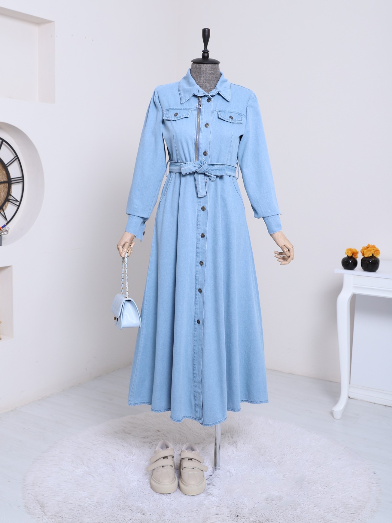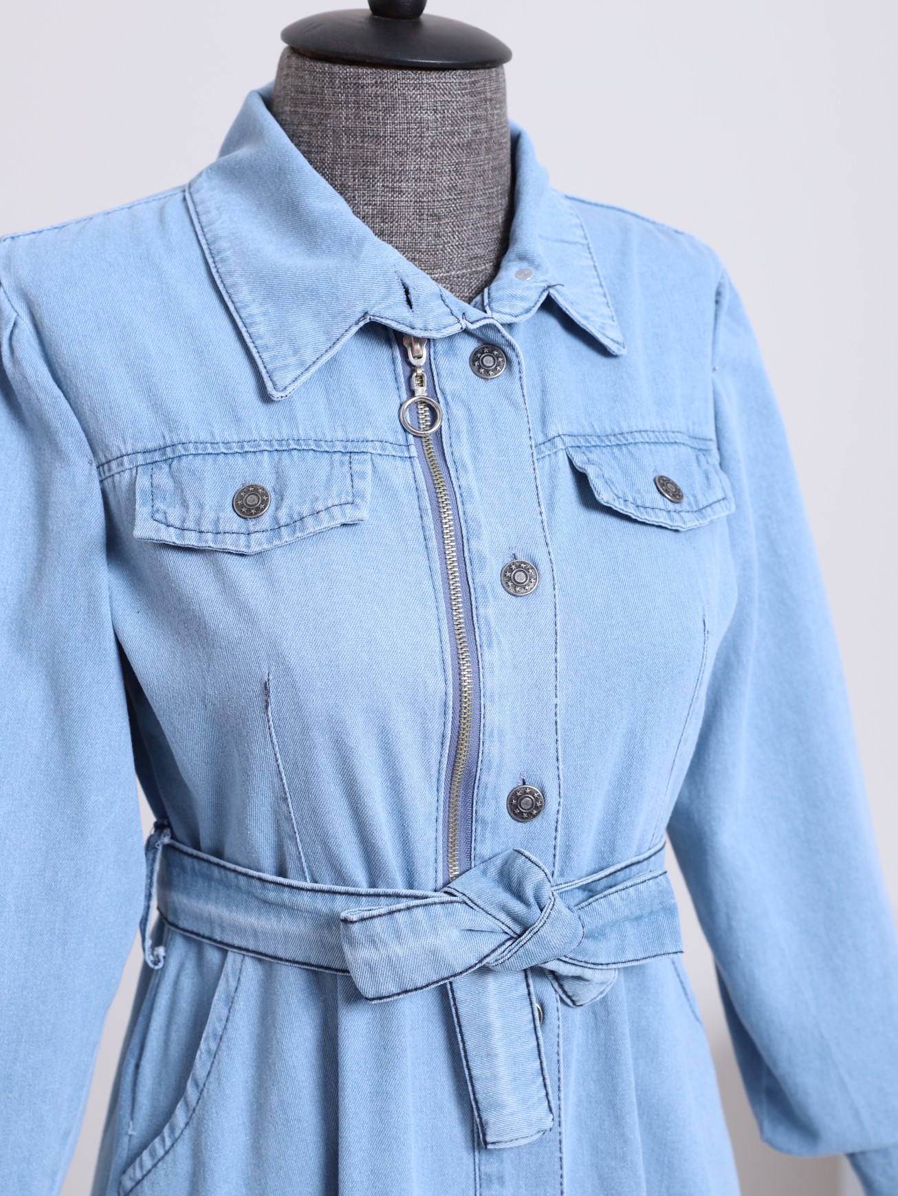 Zipper Detailed Belted Denim Dress -Ice Blue