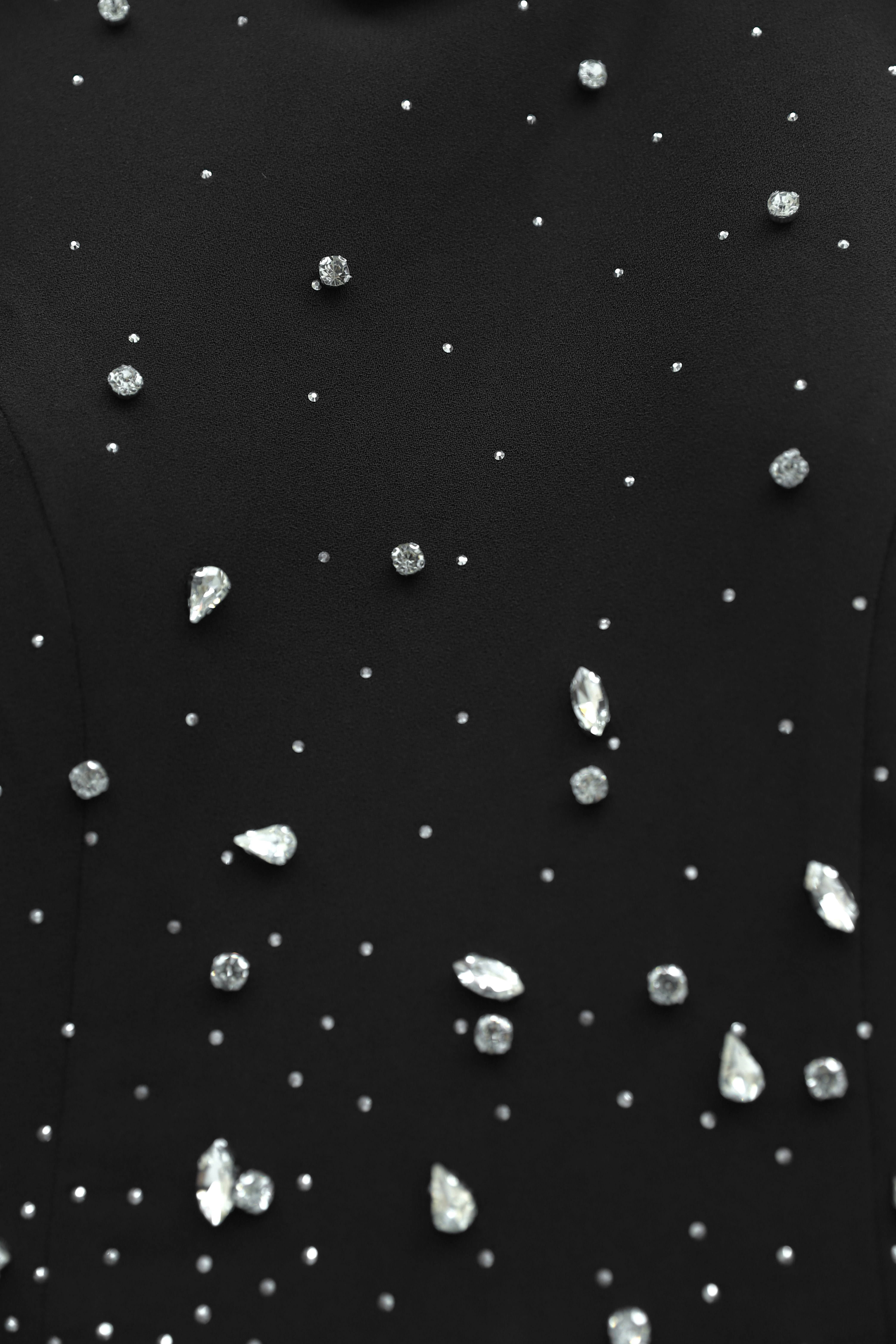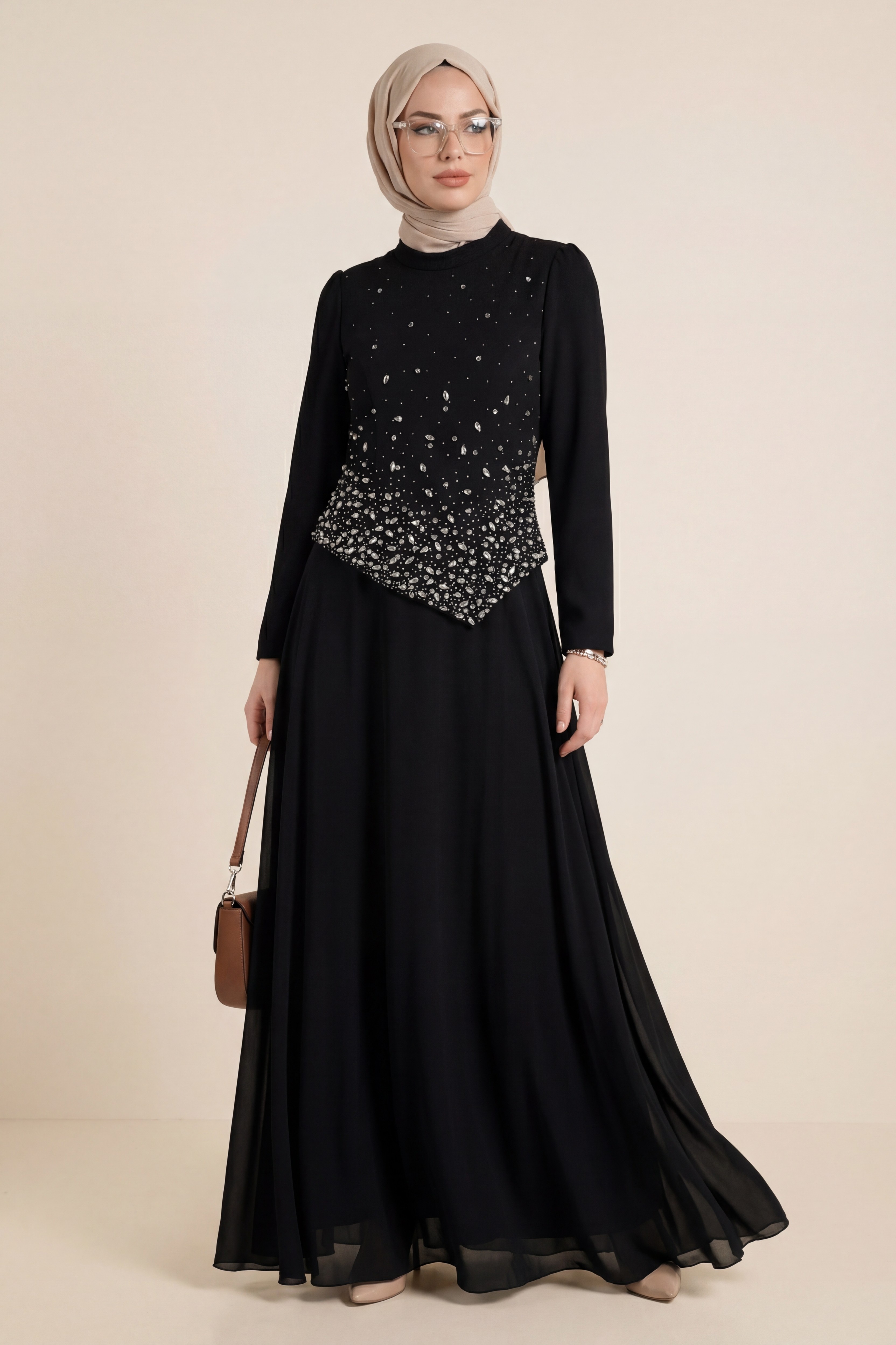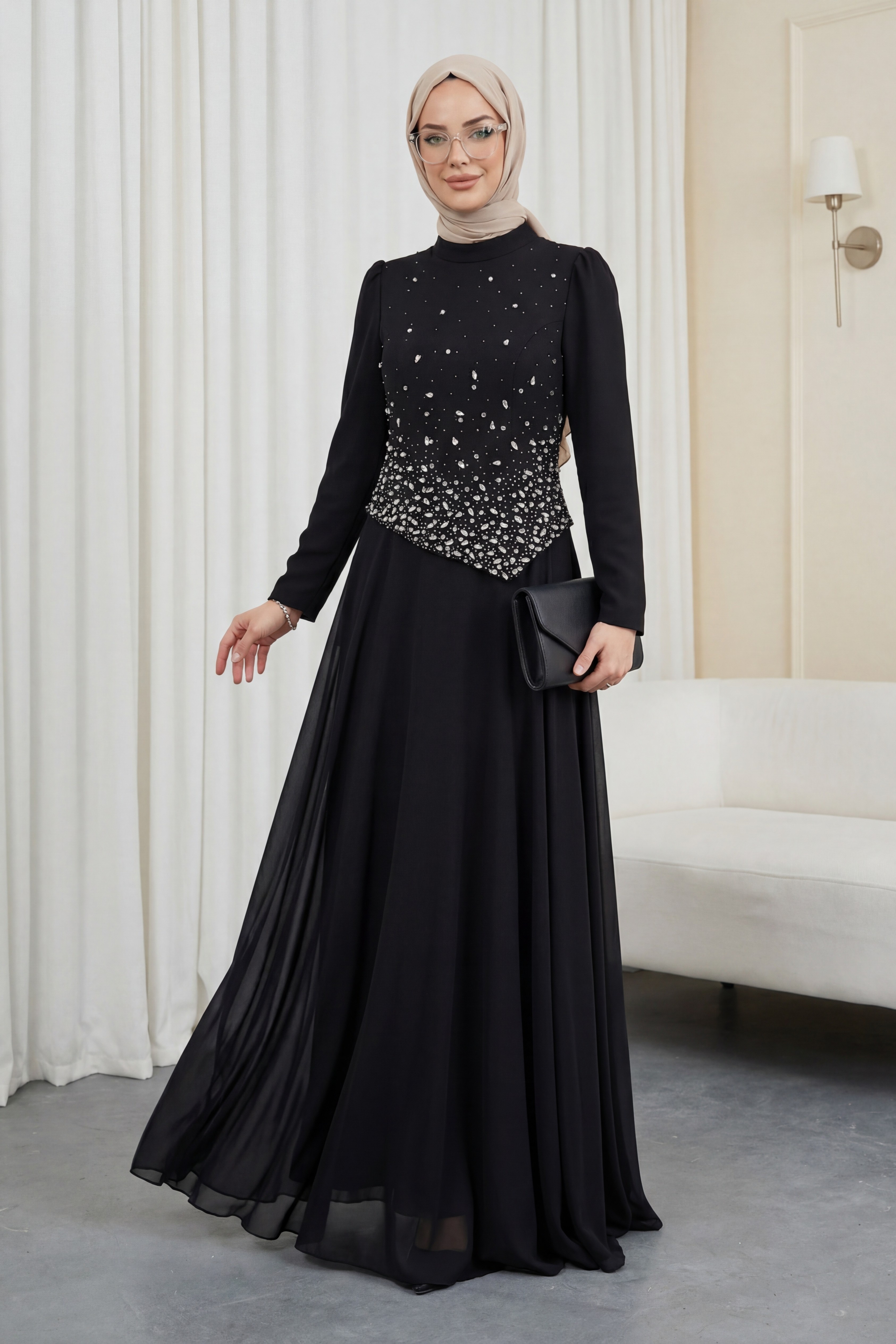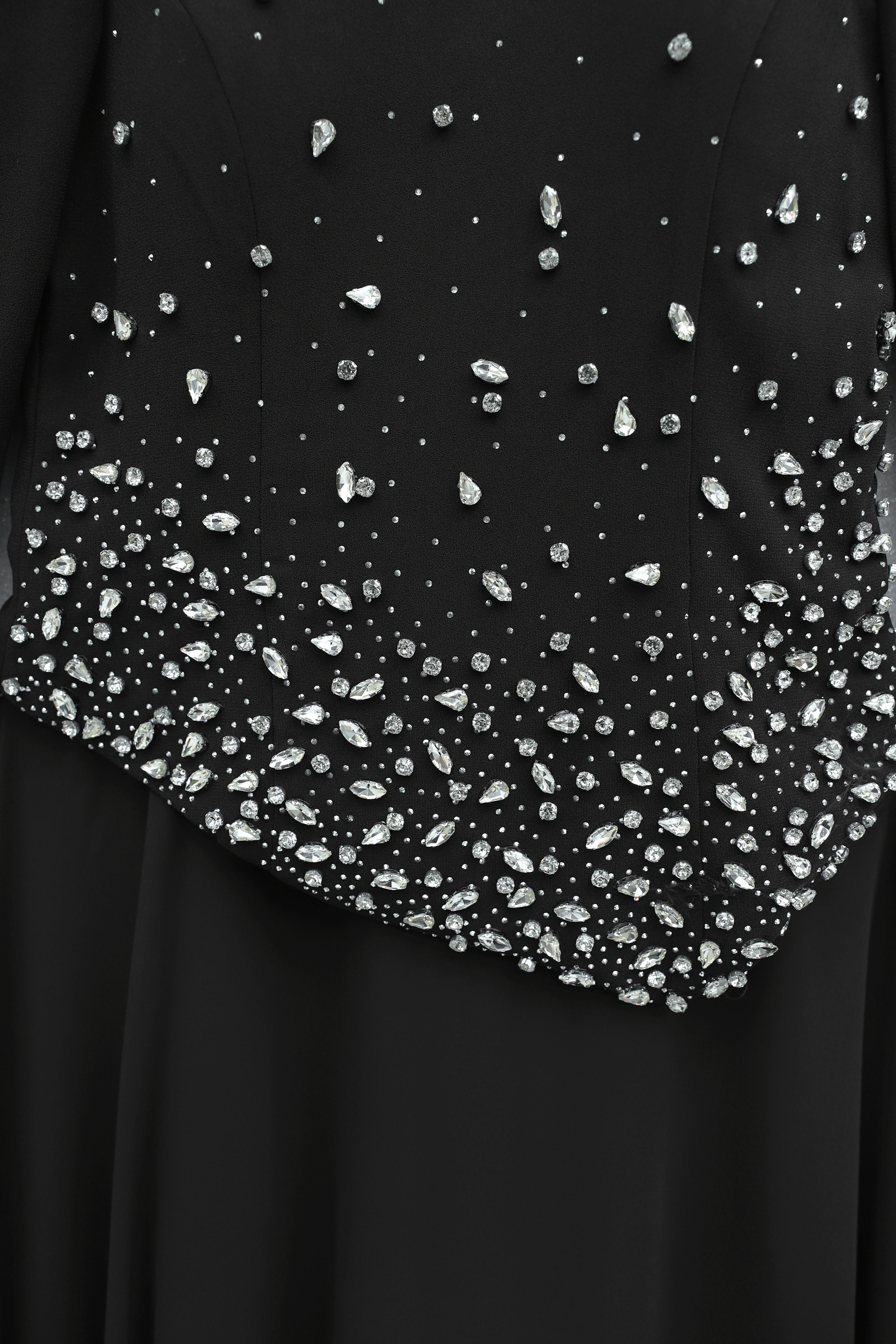 Asymmetrical Top, Chiffon Evening Dress with Scattered Stones -Black