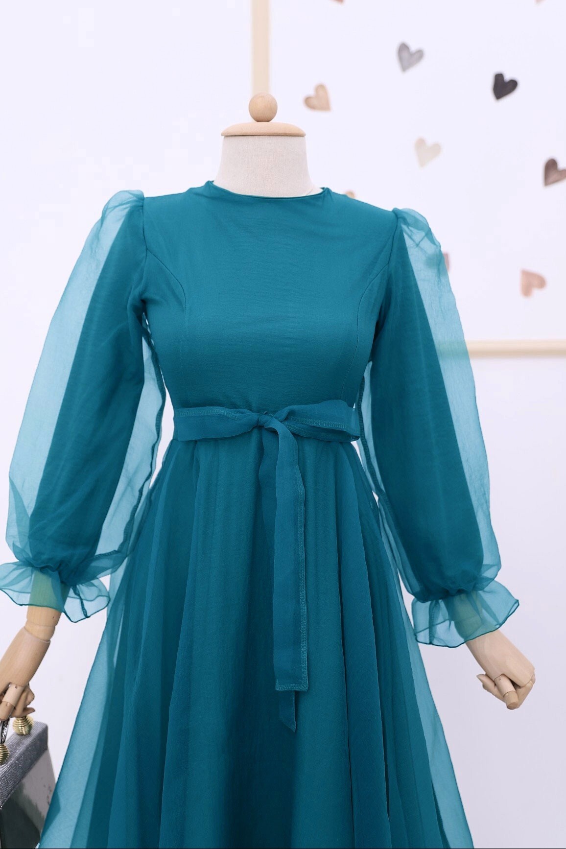 Our crew neck, belted, lined, back zippered evening dress model is one of the most sought-after pieces of the new season.