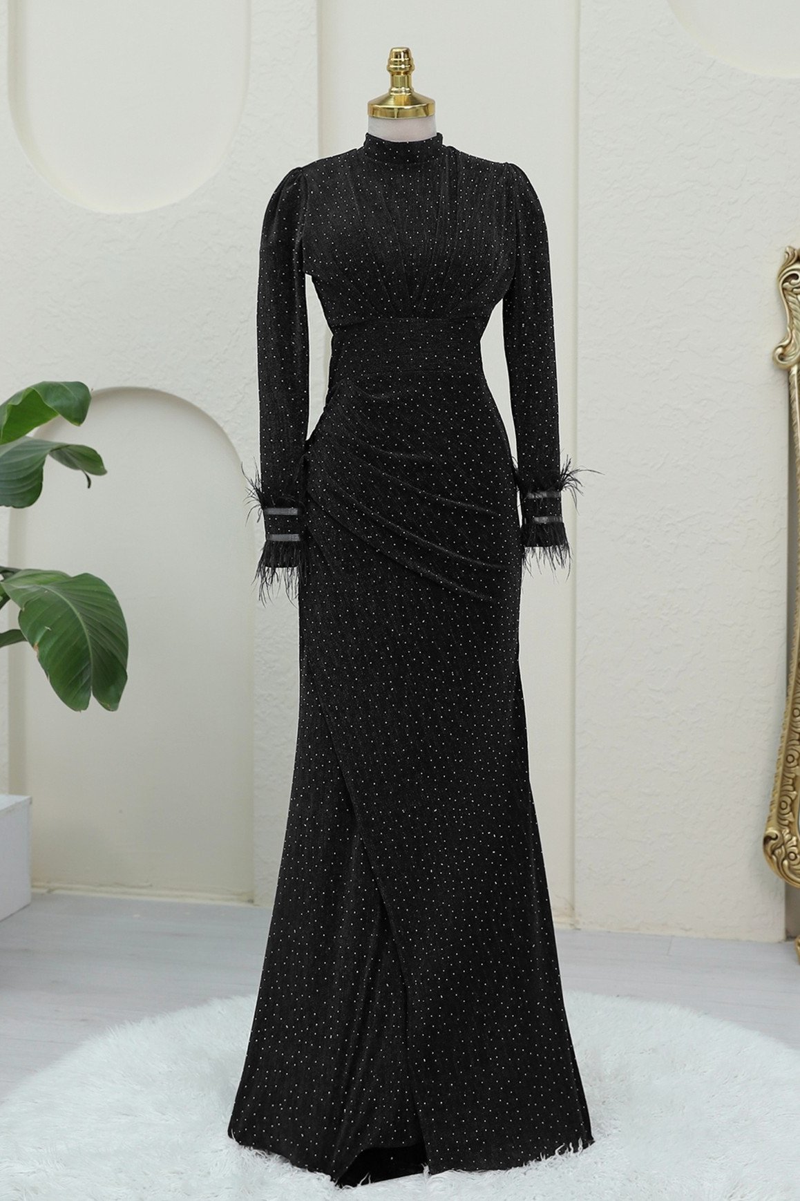 Evening Dress with Feathered Sleeves and Double Tail in Front -Black
