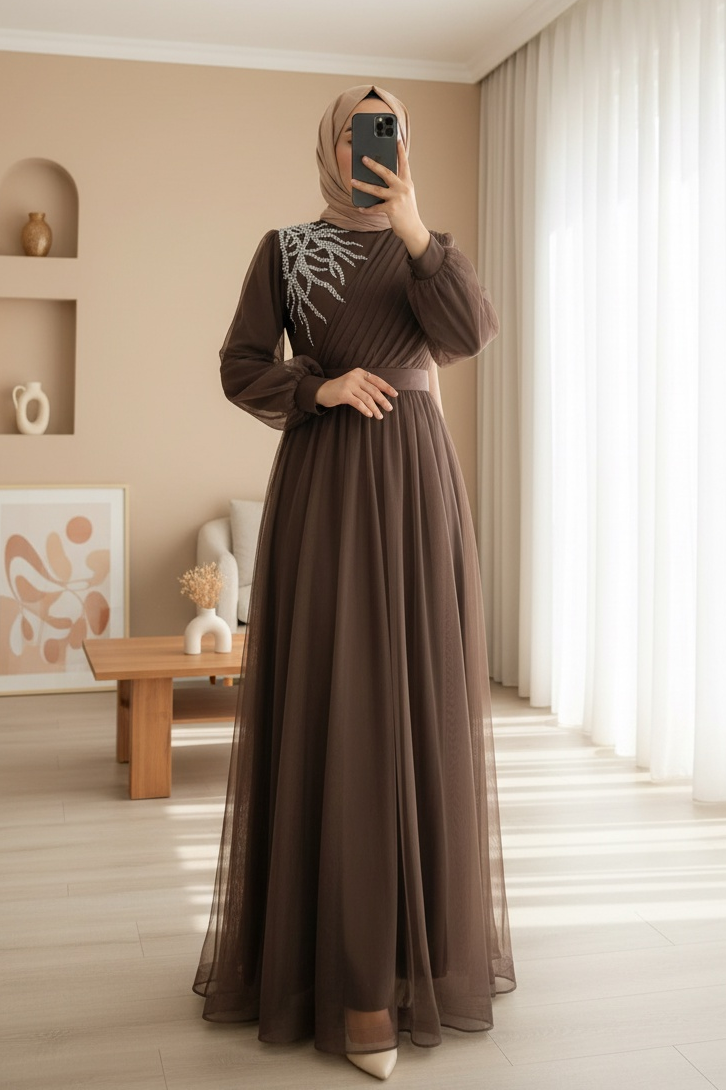 Stone Detailed Draped Belt Tulle Evening Dress -Dark Coffee