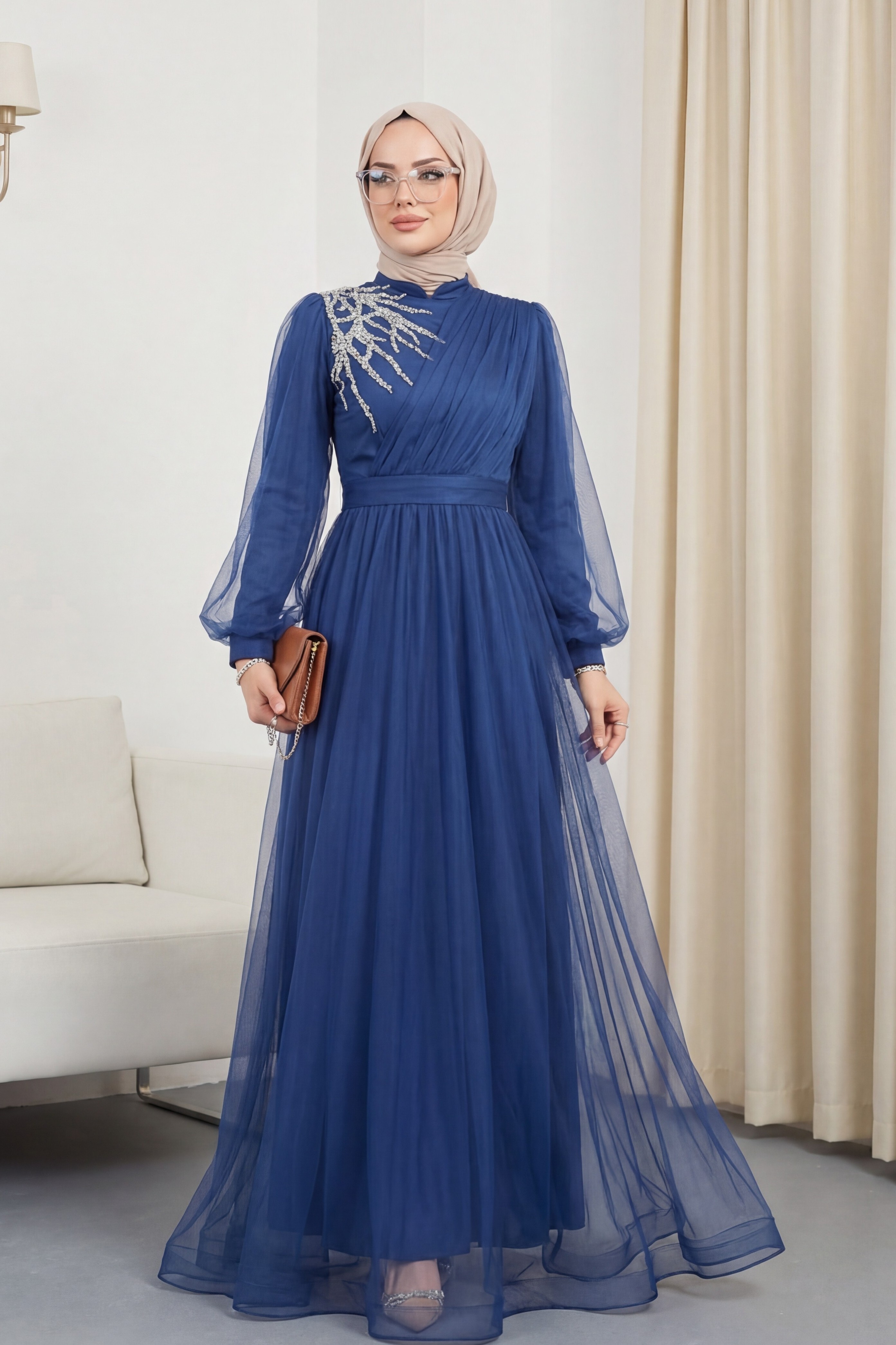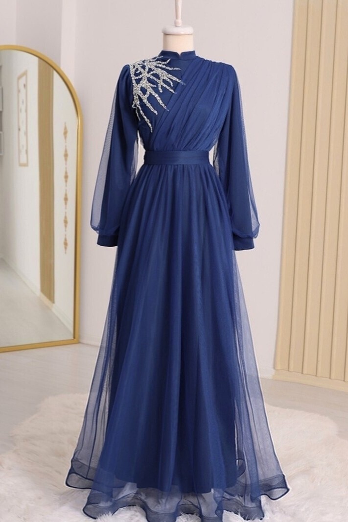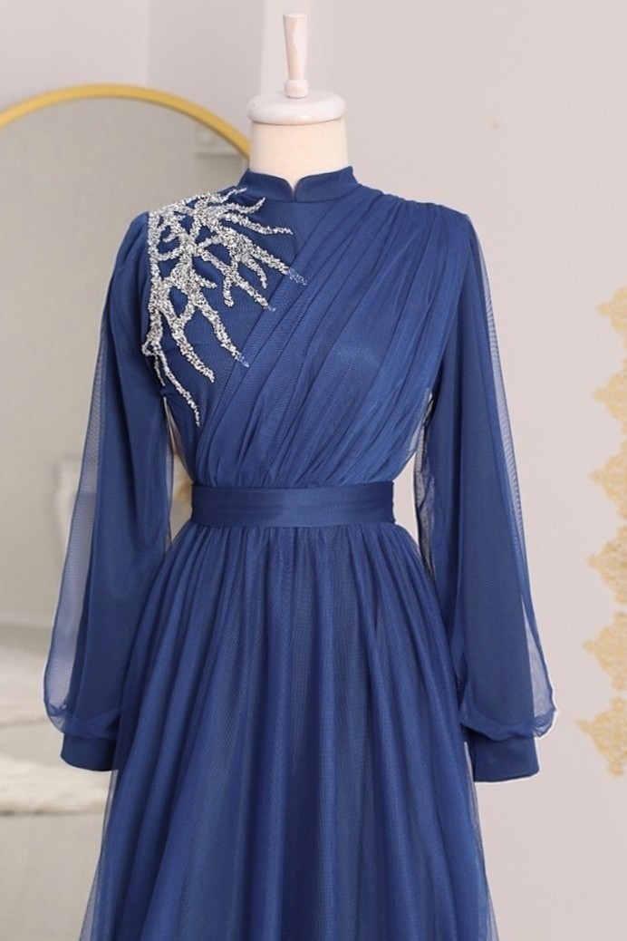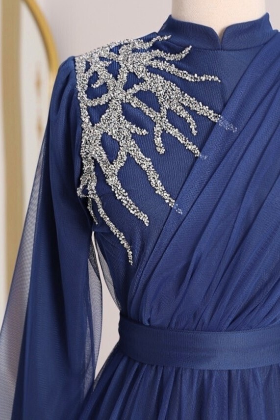 Stone Detailed Draped Belt Tulle Evening Dress -Navy blue