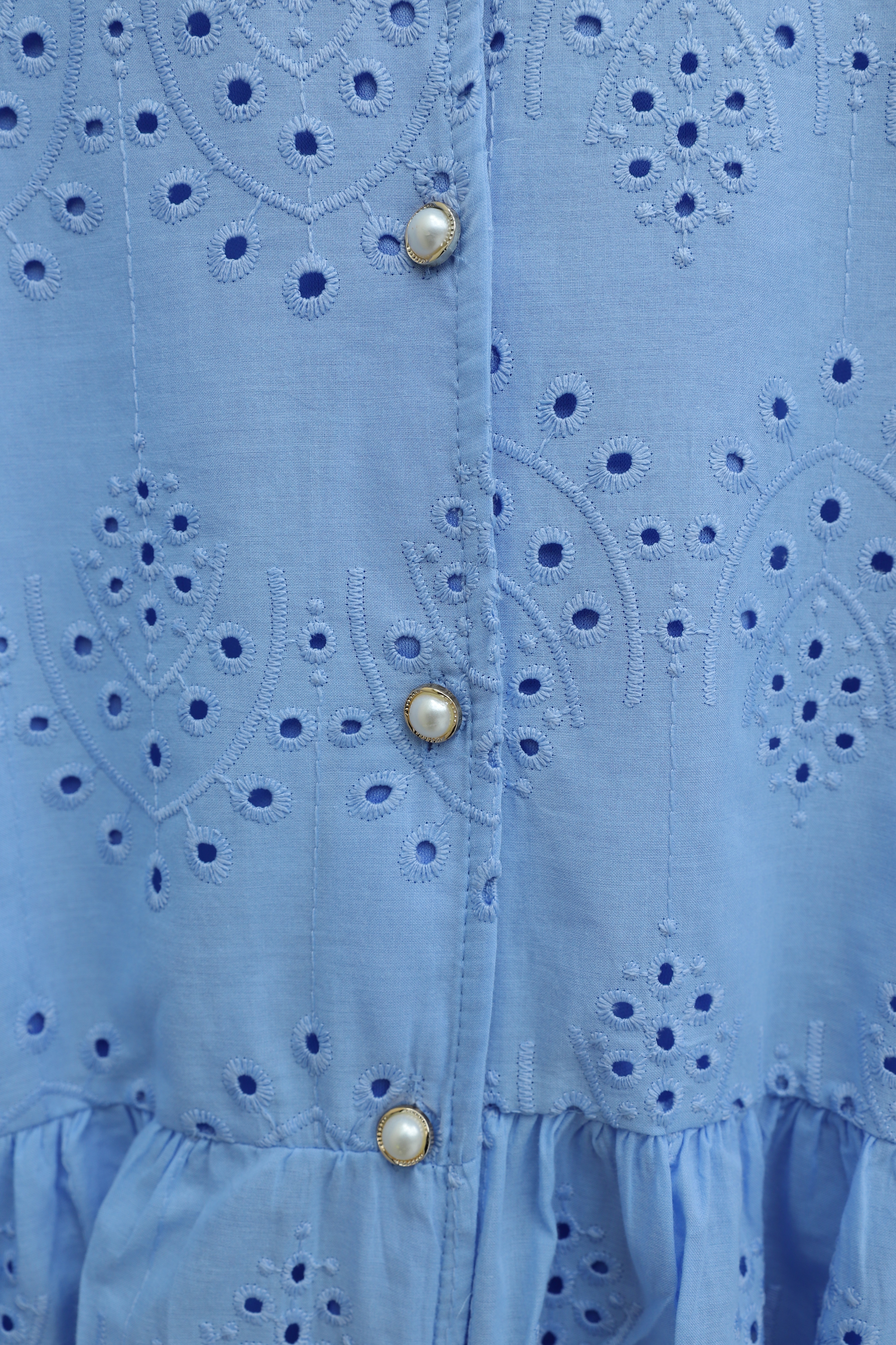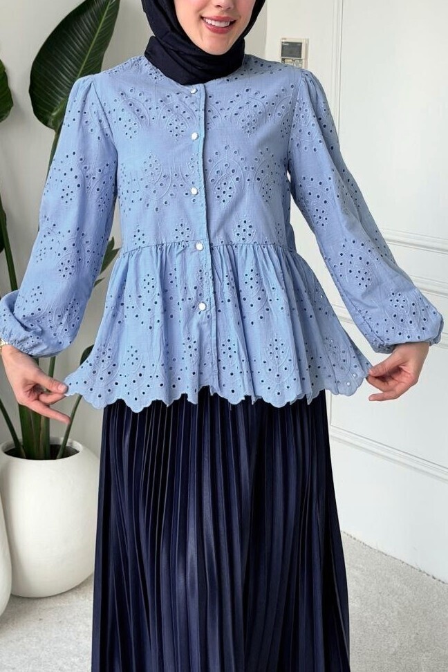 Elastic Sleeve Openwork Buttoned Lined Shirt -Blue