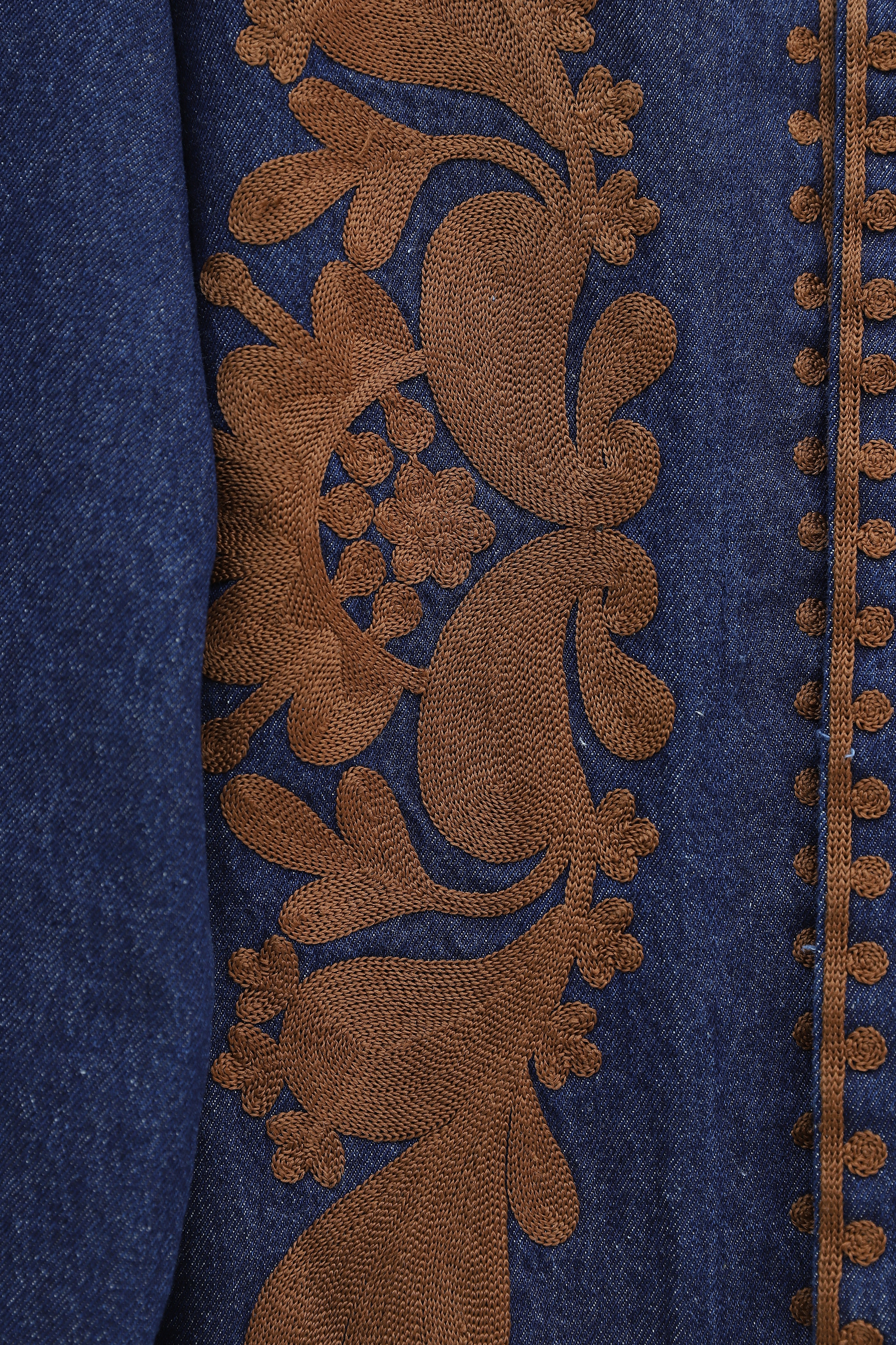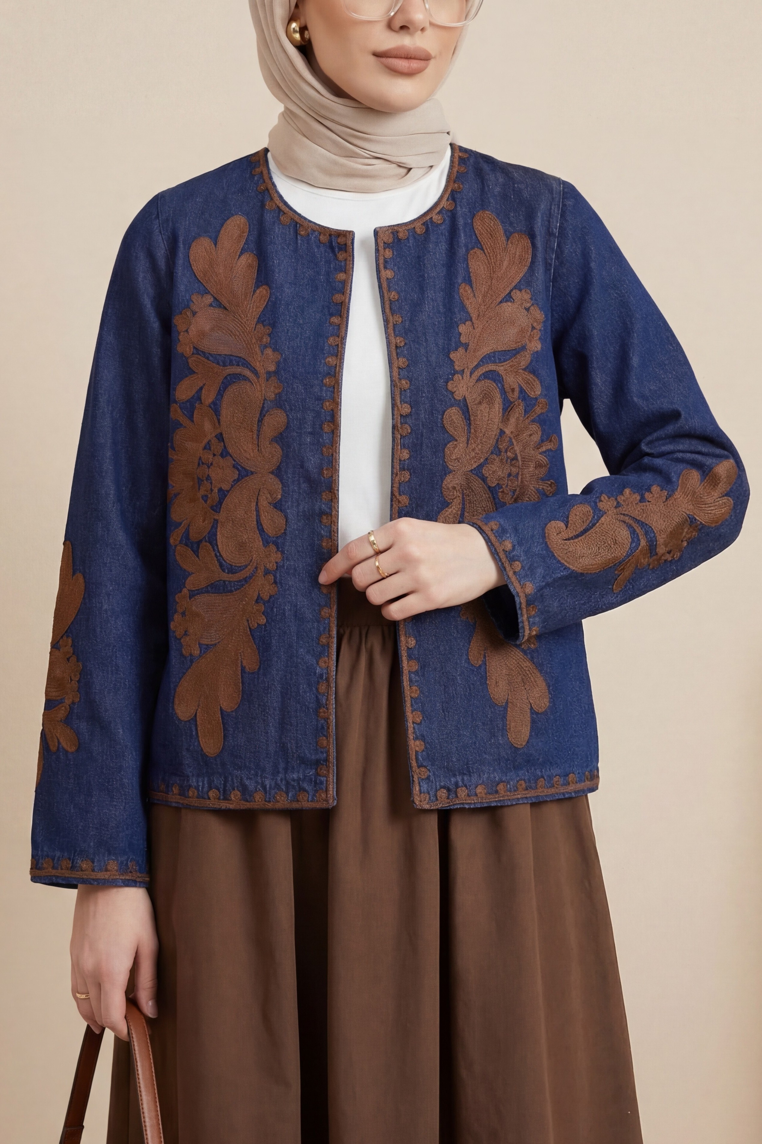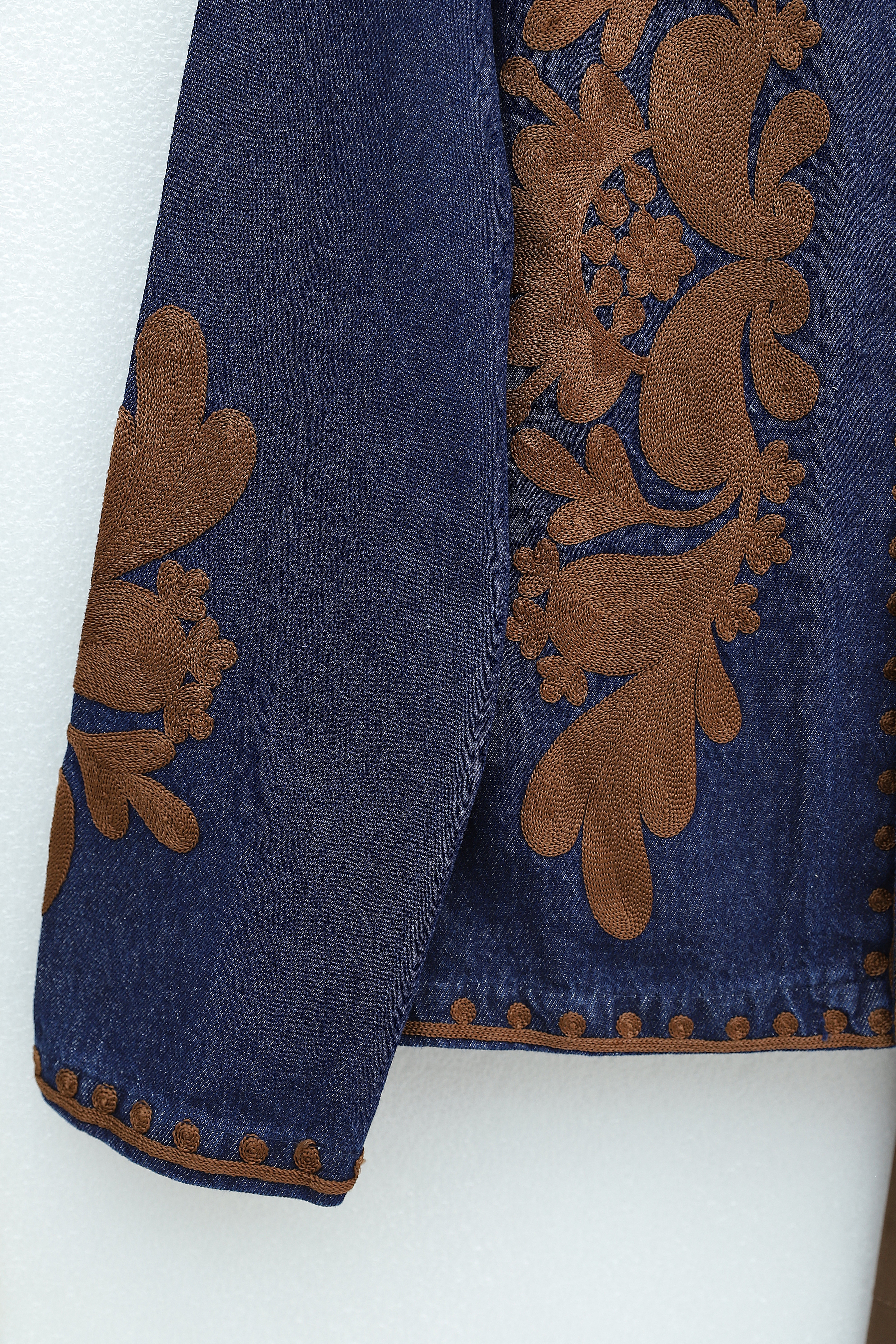 Denim Jacket with Embroidered Front and Sleeves -Navy blue