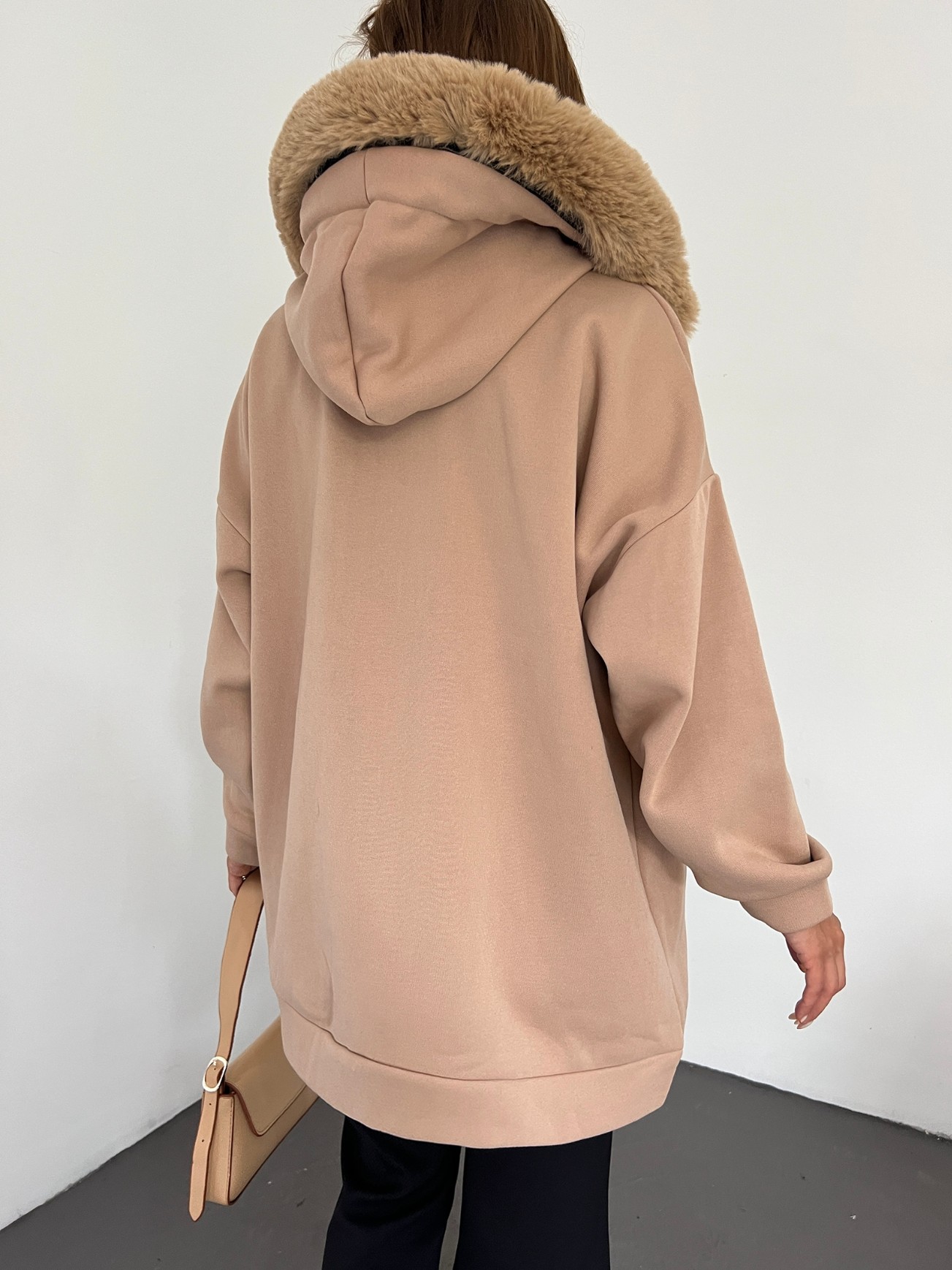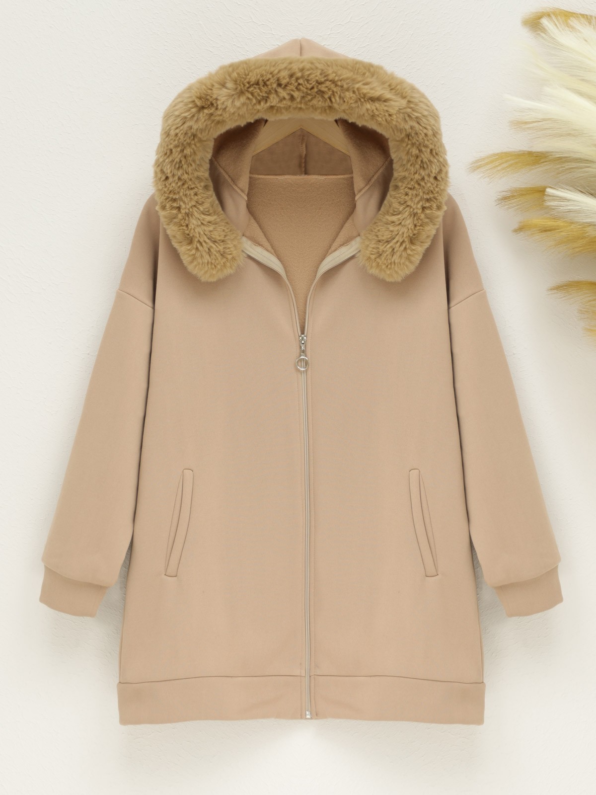 Our hooded, fur detailed, front zippered, 2 pockets, cotton fleece inside model is among the most popular models of the new season.