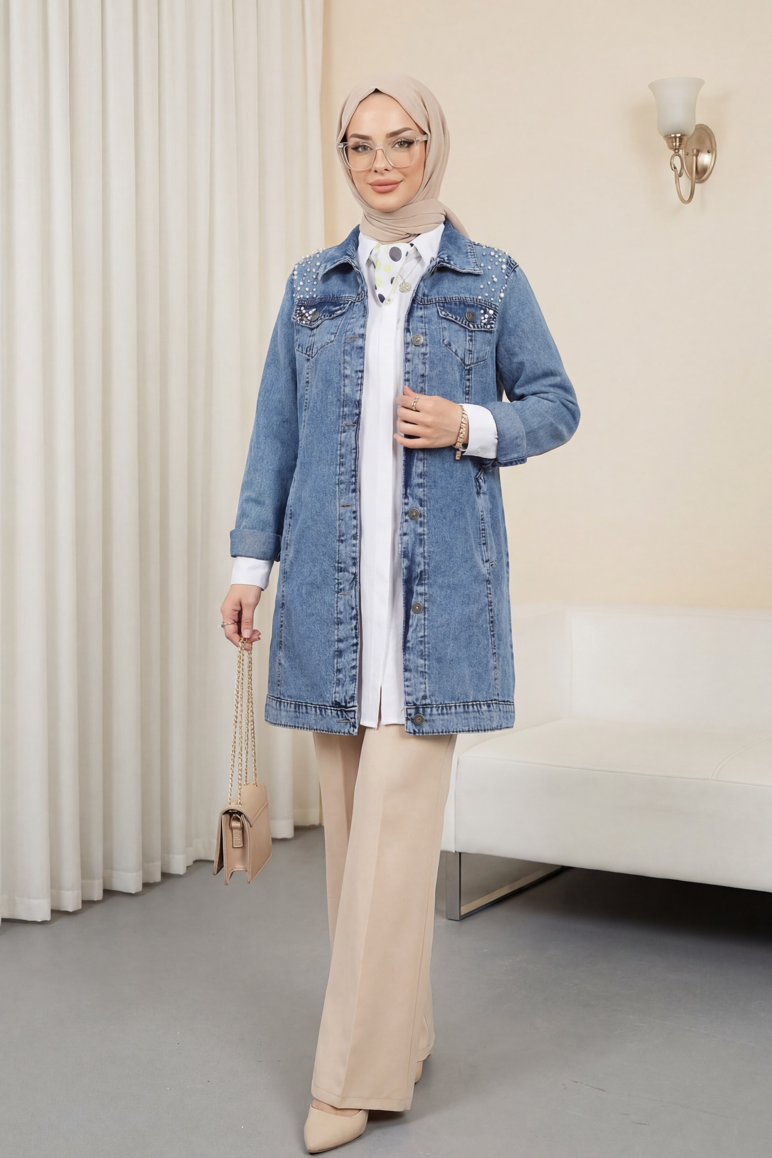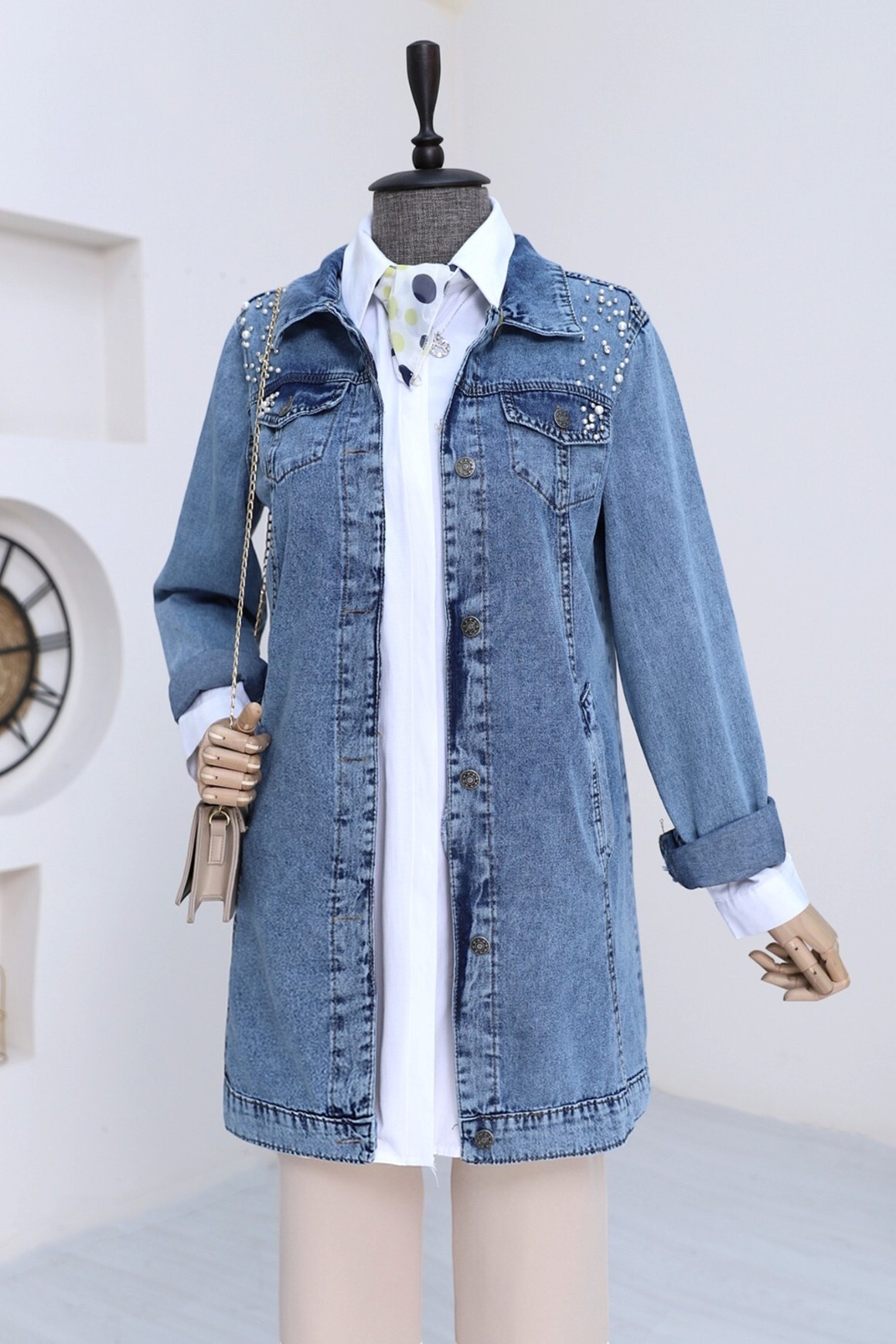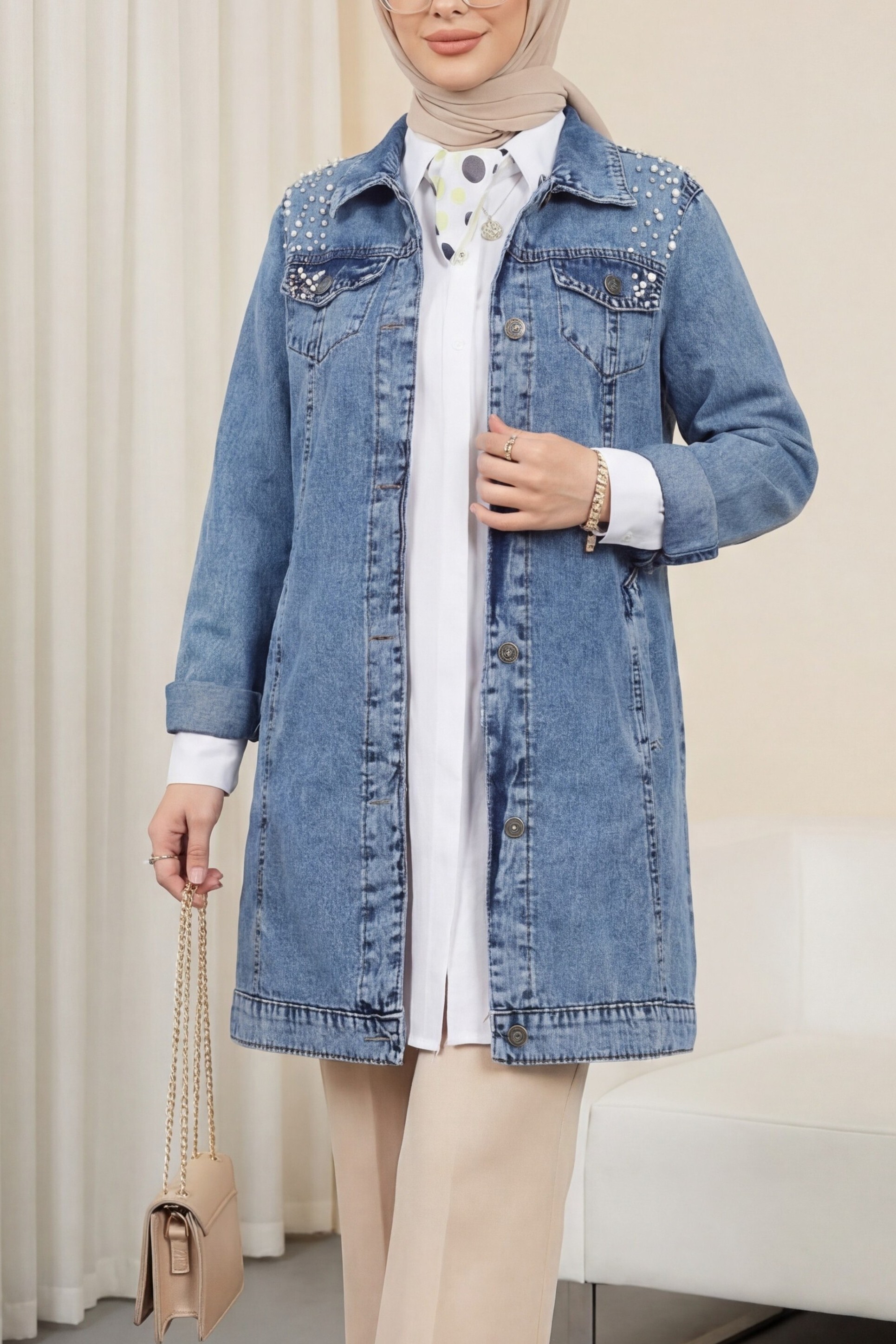 The Stone-Embroidered Washed Denim Jacket is a modern and stylish outerwear piece. The washed denim fabric offers a relaxed look, while the stone embroidery adds a touch of elegant sparkle. Perfect for both casual and chic outfits, this jacket is a great way to complete your style. With its durable construction and stylish details, it can be worn confidently for any occasion.