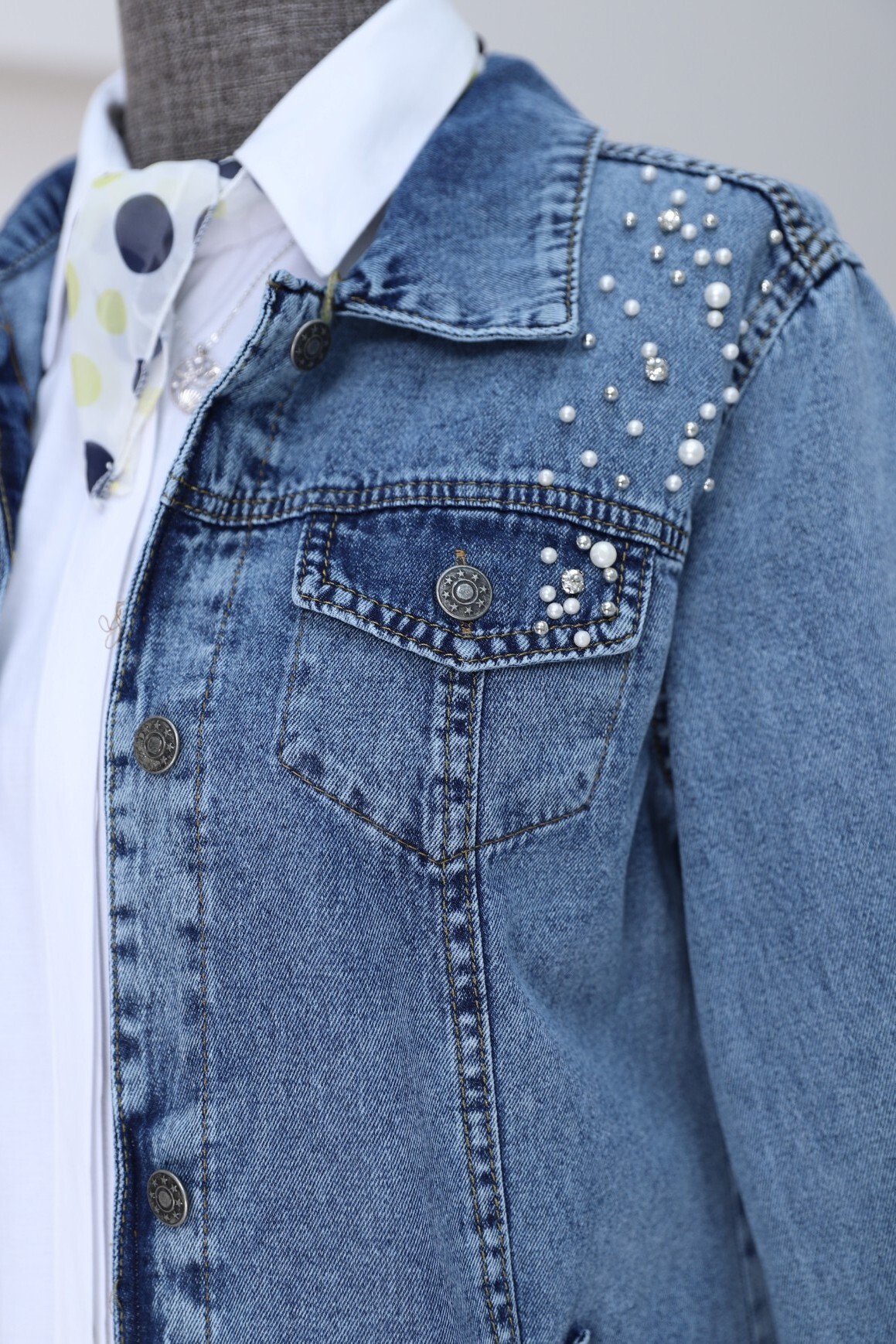 Stone Embroidered Washed Denim Jacket -Blue