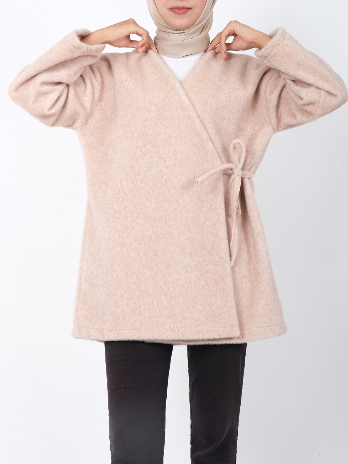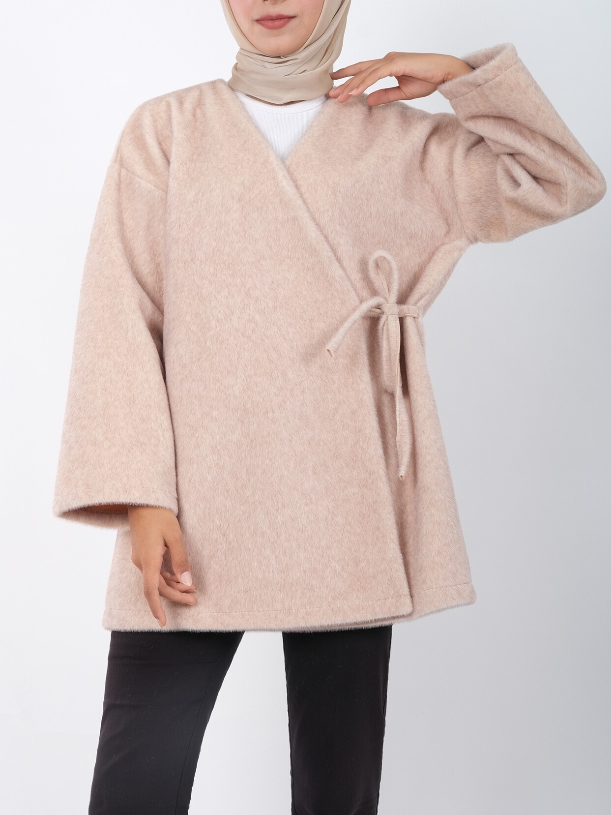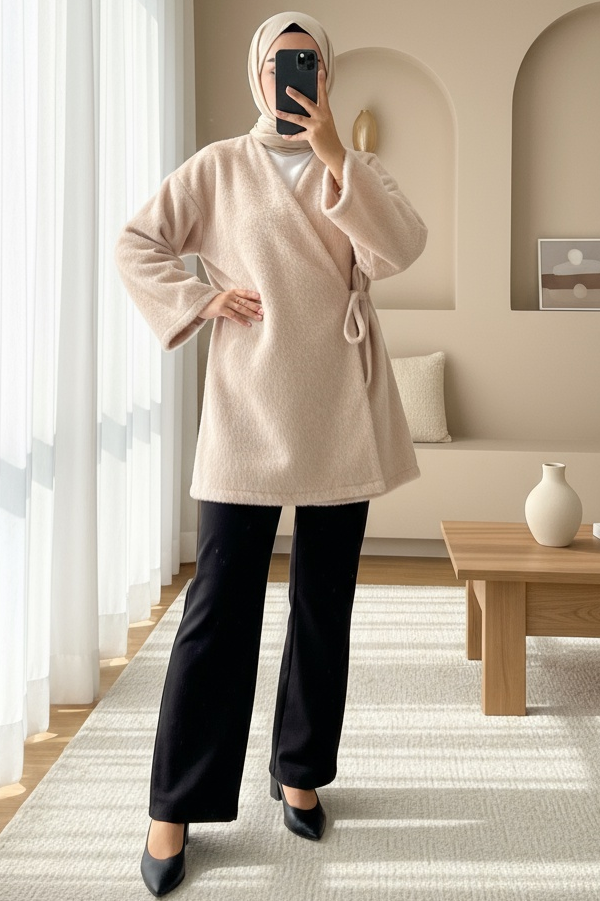 Complete your look with the side-tied faux fur jacket. With elegant fur details and a modern tie design, it keeps you warm while enhancing your style. Perfect for cold weather, this jacket is a must-have for your wardrobe with its high-quality fabric and affordable price.
