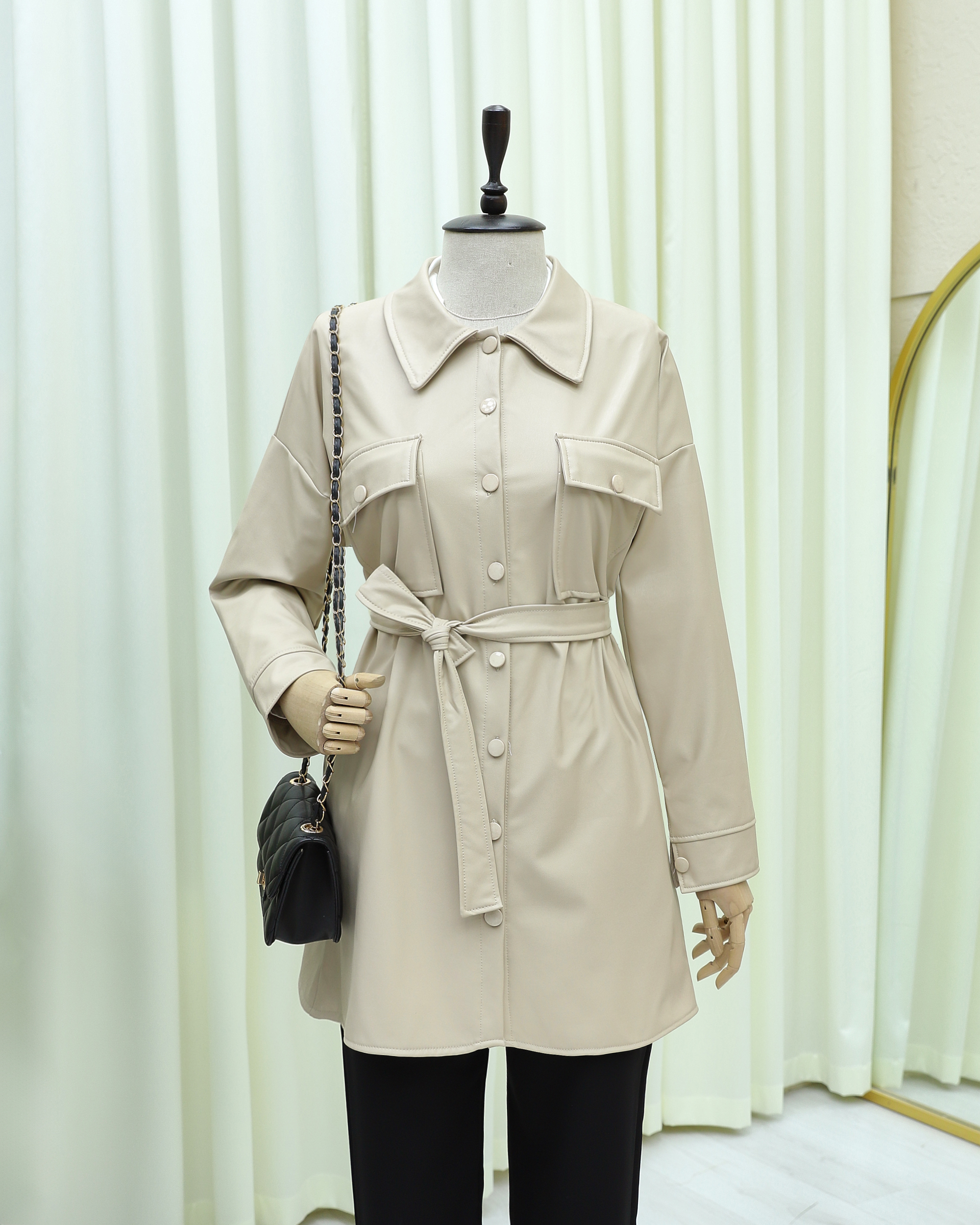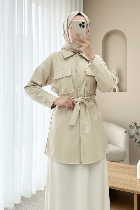 "Featuring a modern design with a belted waist and double pockets, this leather shirt offers both style and comfort. Perfect for daily wear or special occasions, it adds a chic touch to your wardrobe."
