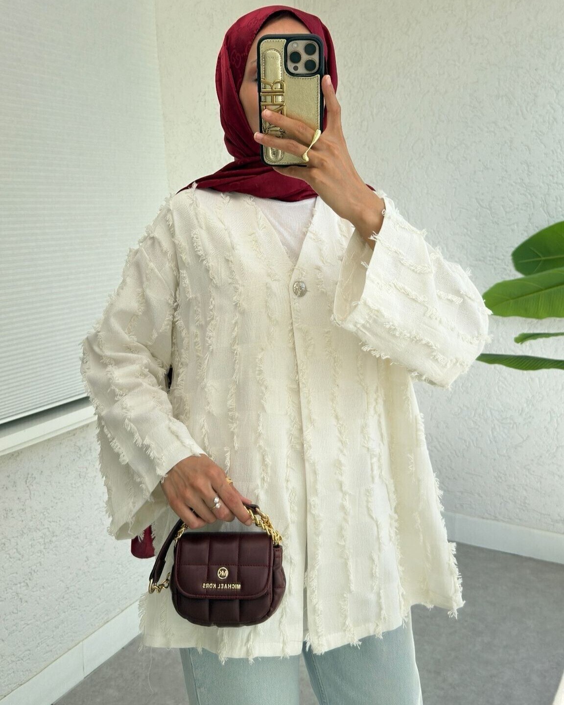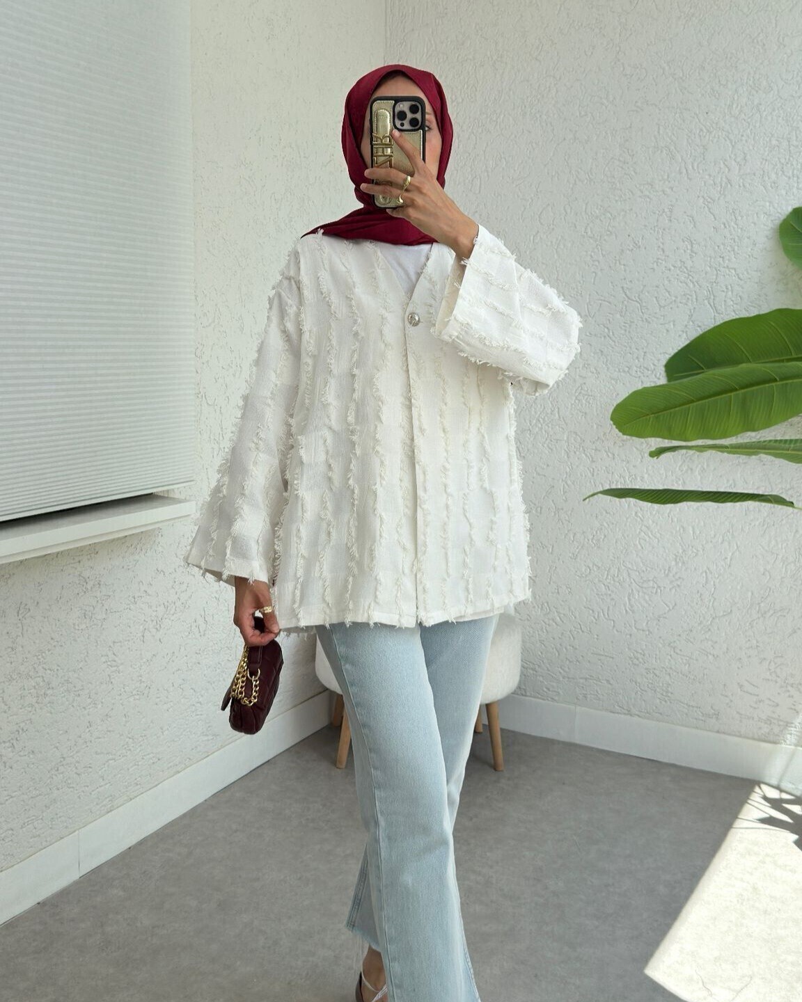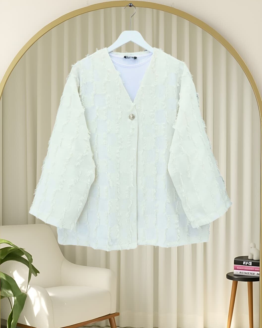 Fringed Single Button Square Patterned Kimono -White