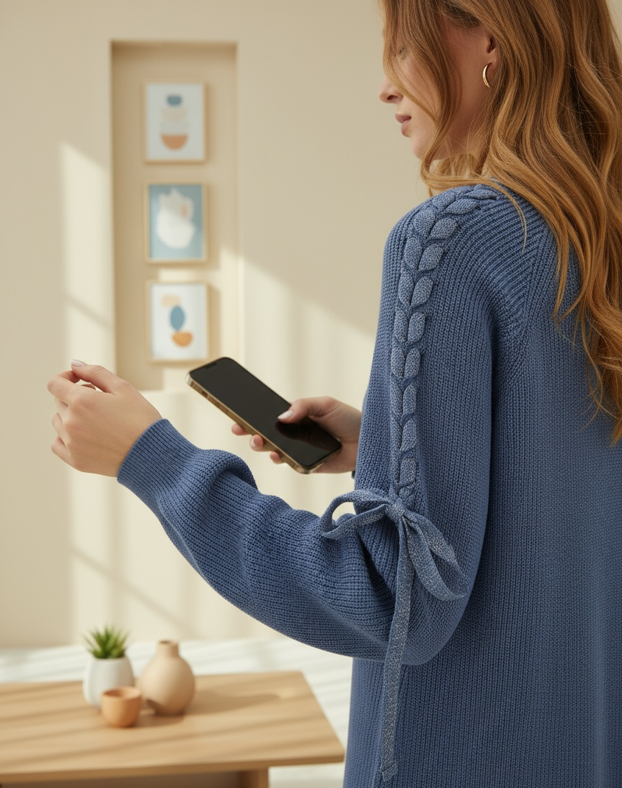 Casual Knit Tunic with Shoulder Braid -İndigo
