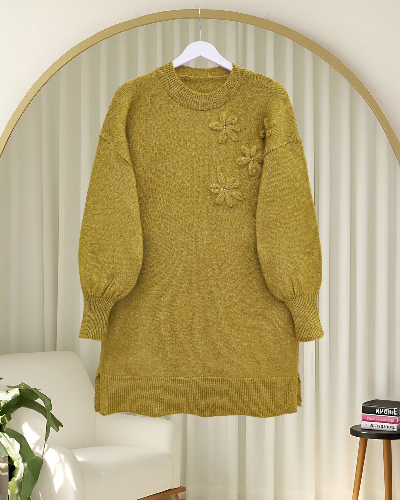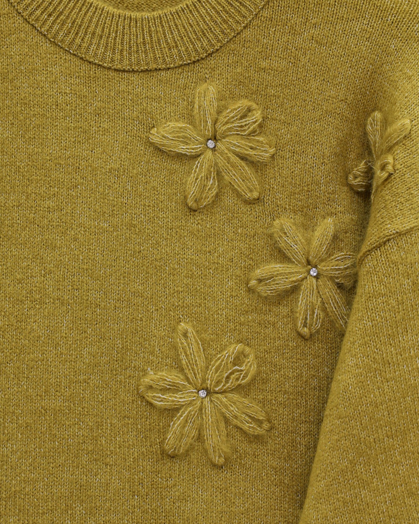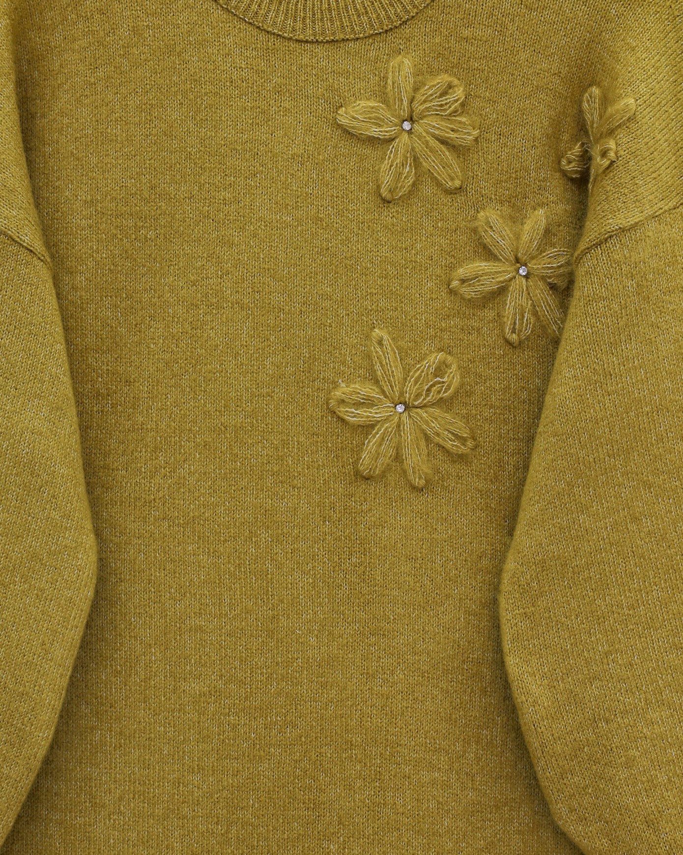 Flower Patterned Stoned Soft Knit Sweater -Oil Green