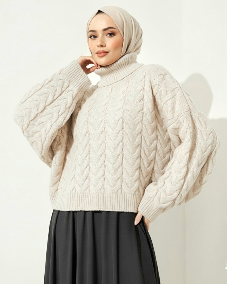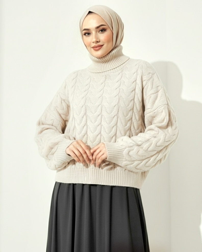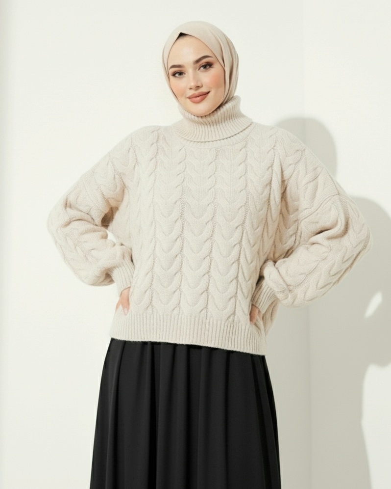 Knitted Patterned Turtleneck Sweater -Ecru -