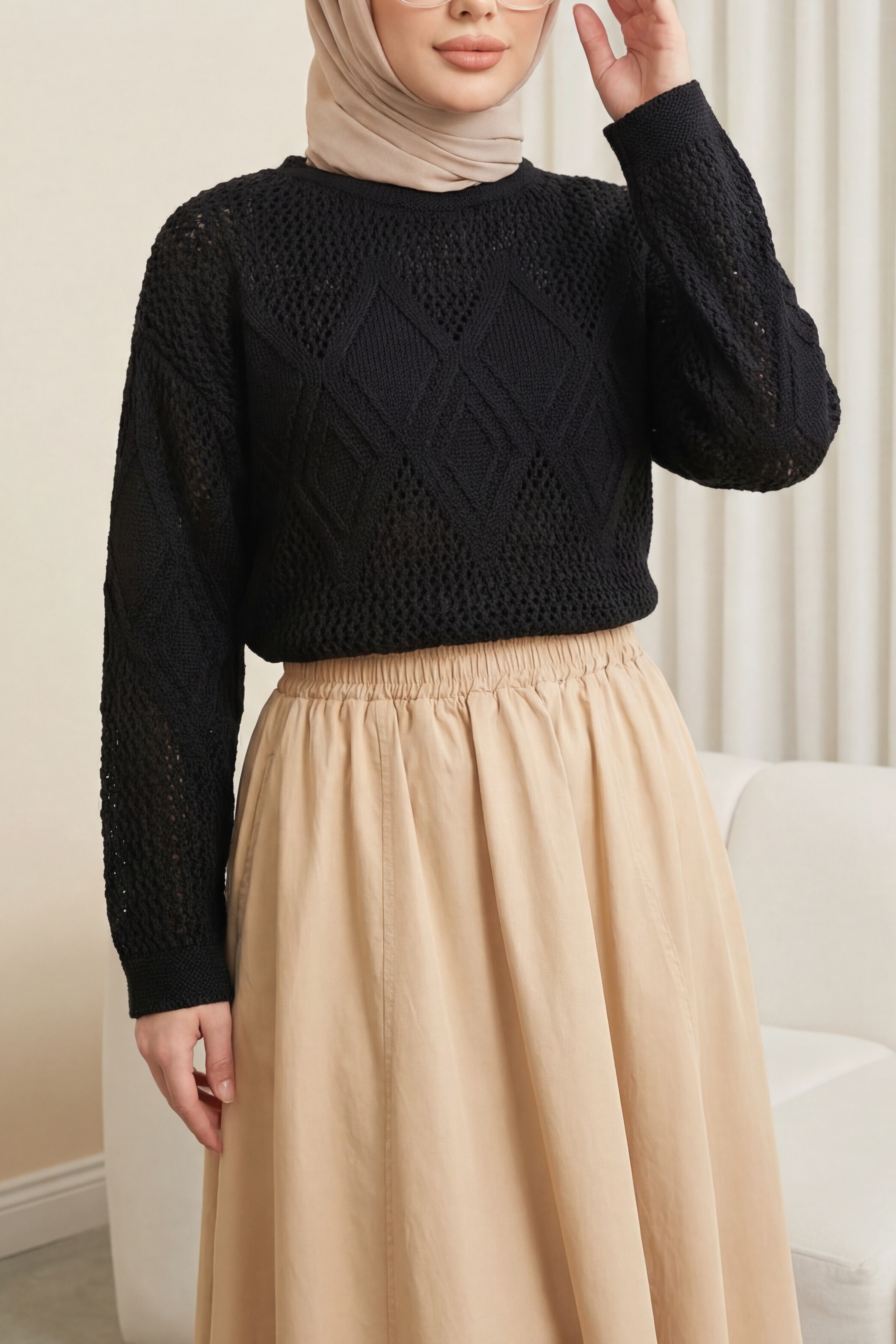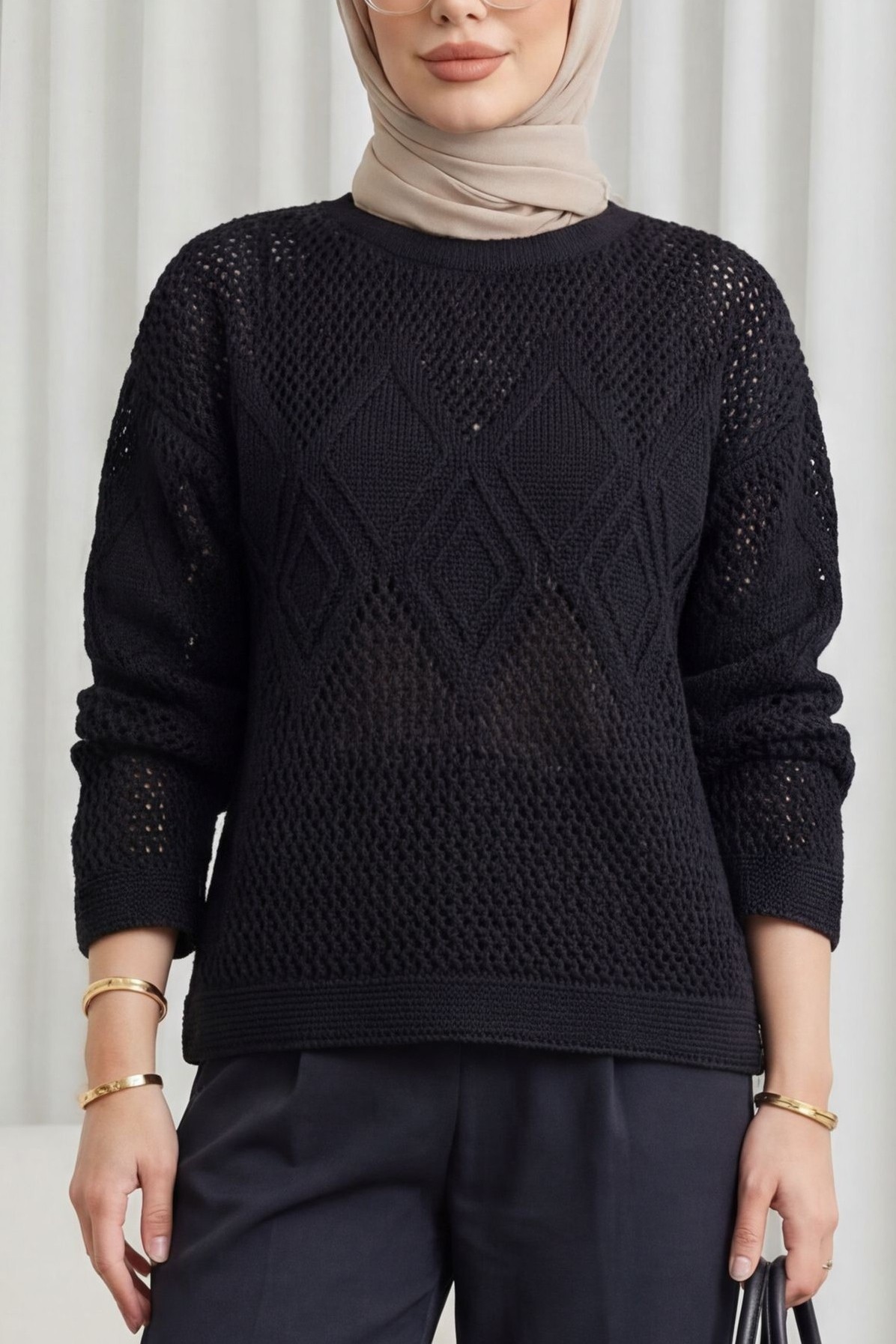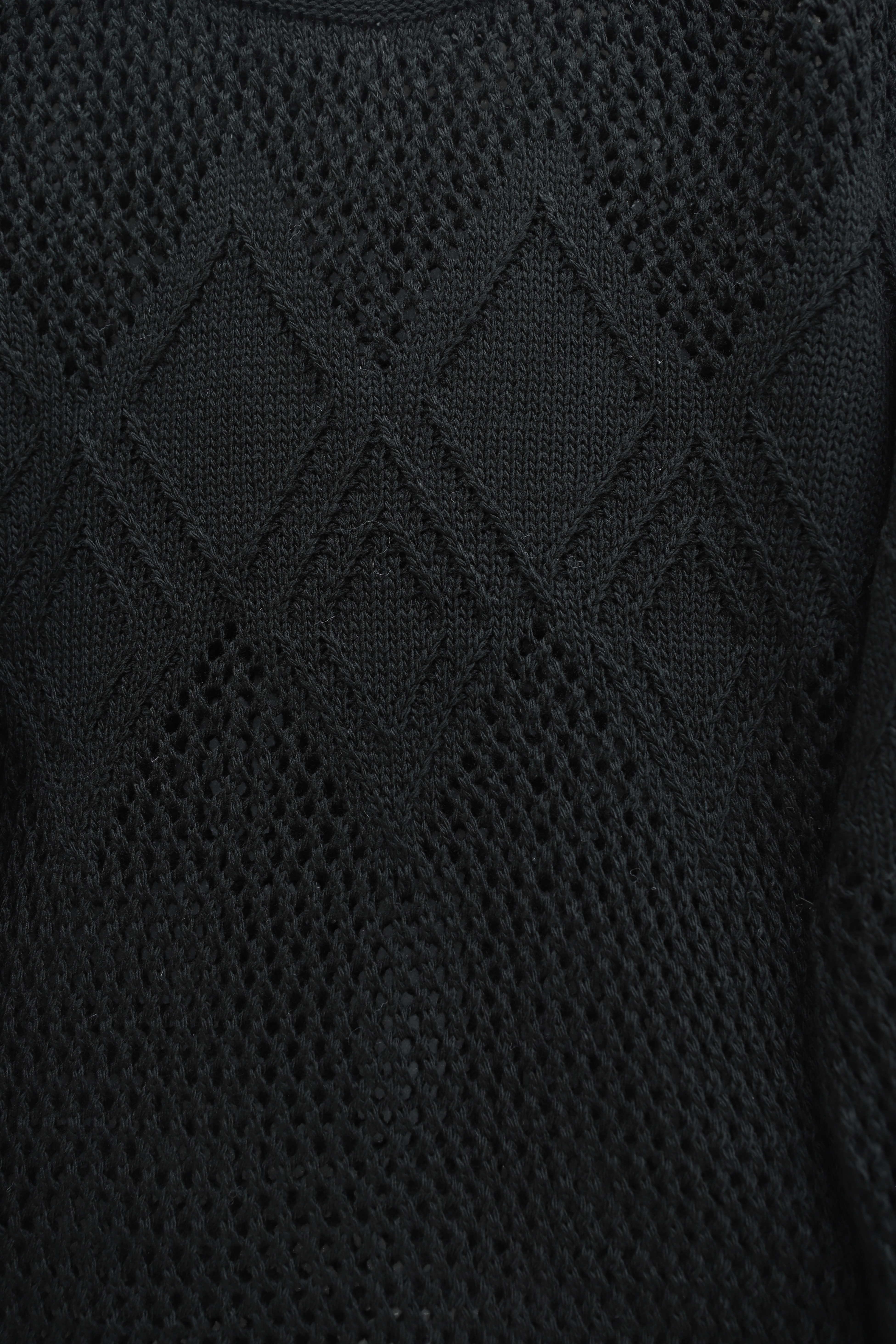 Knitted Sweater with Openwork Pattern on Front and Sleeves -Black