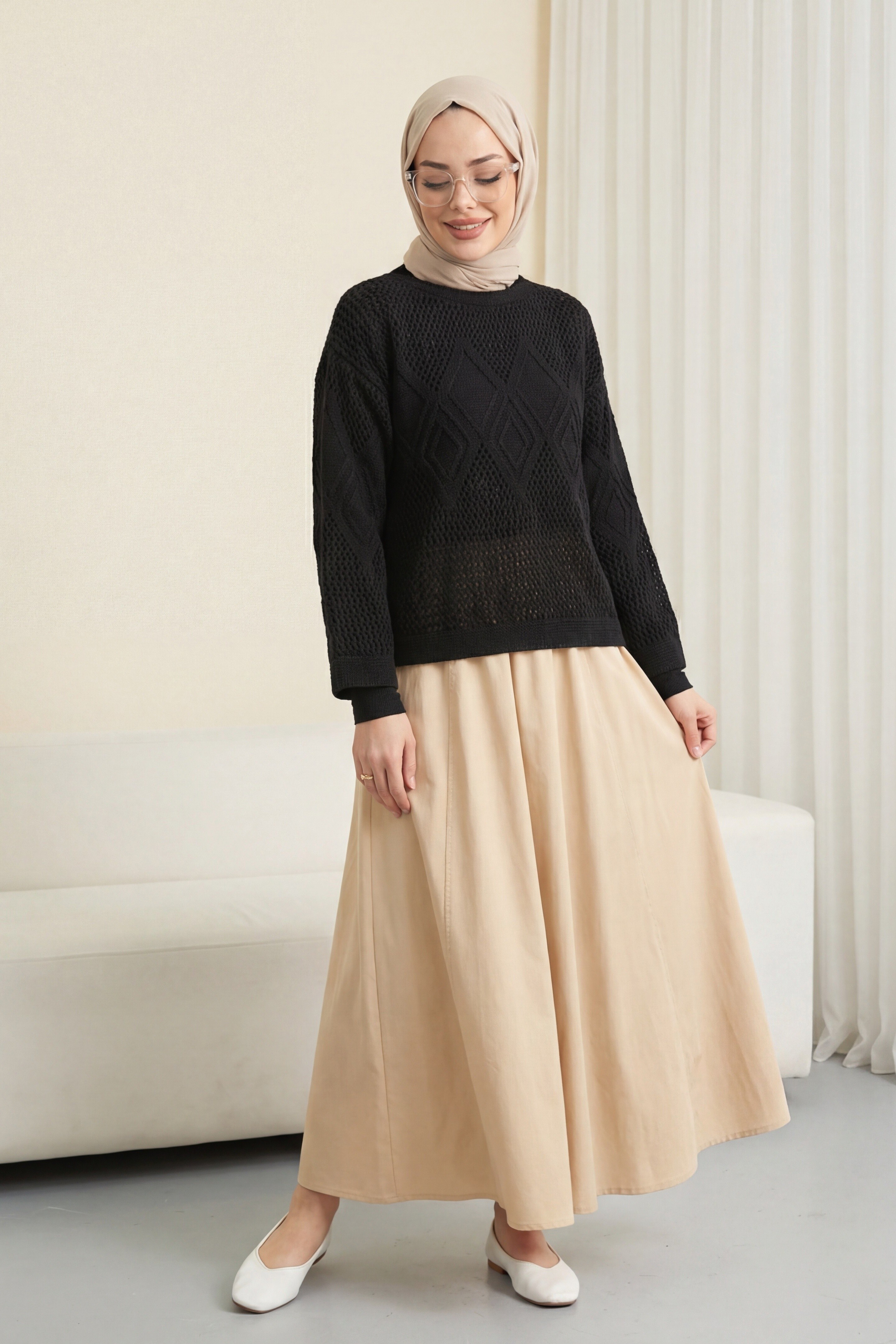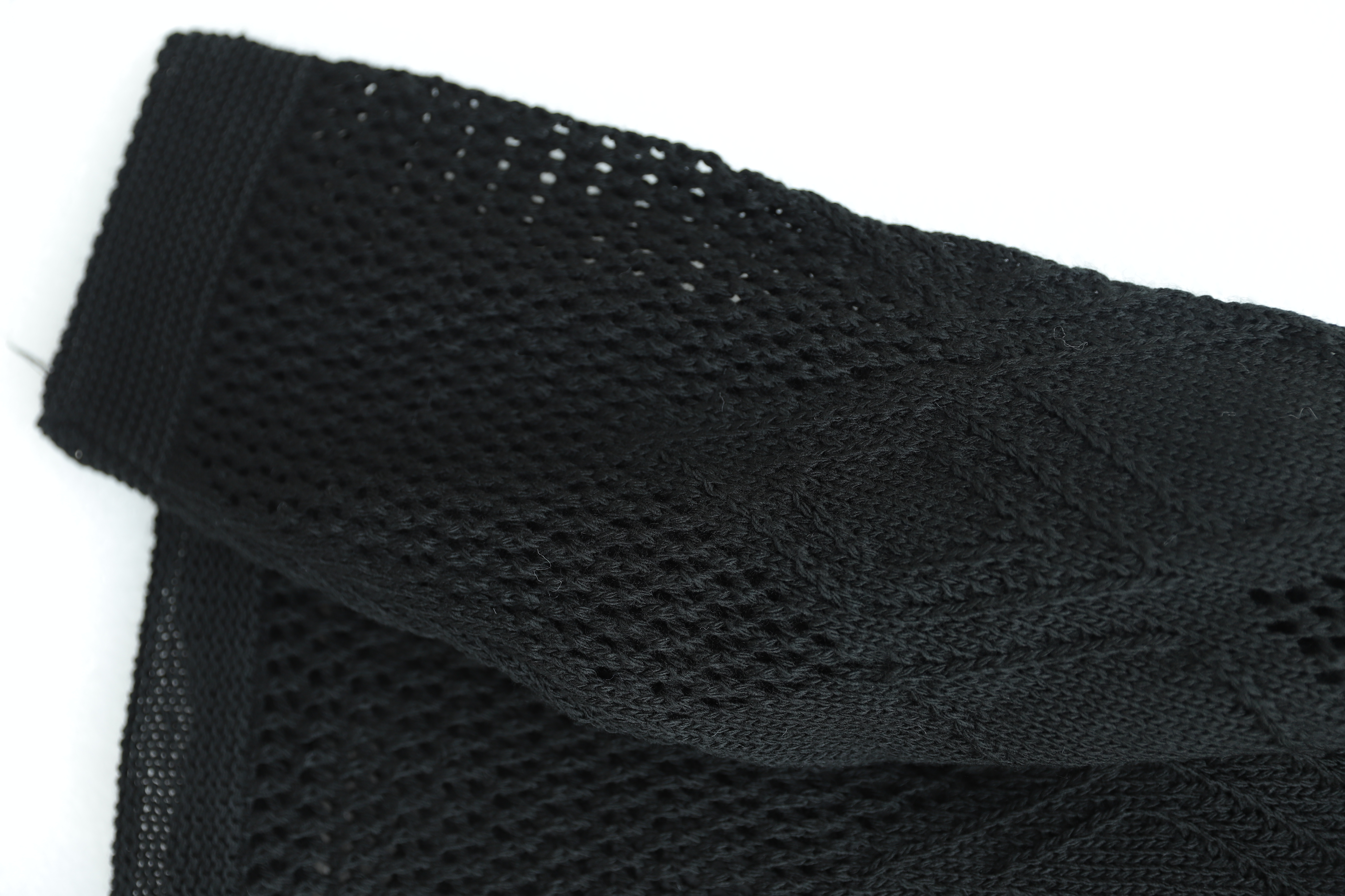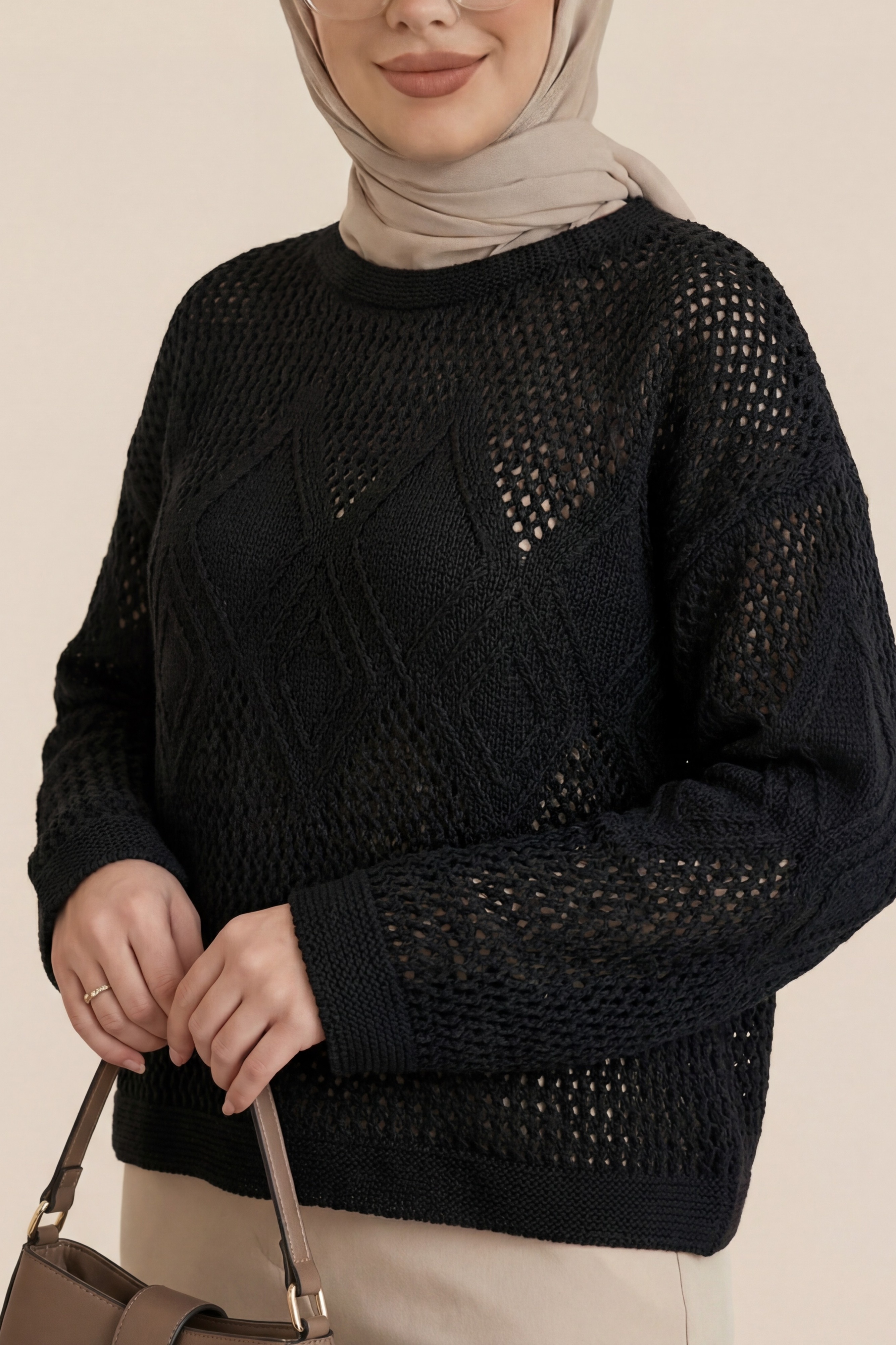 Knitted Sweater with Openwork Pattern on Front and Sleeves -Black