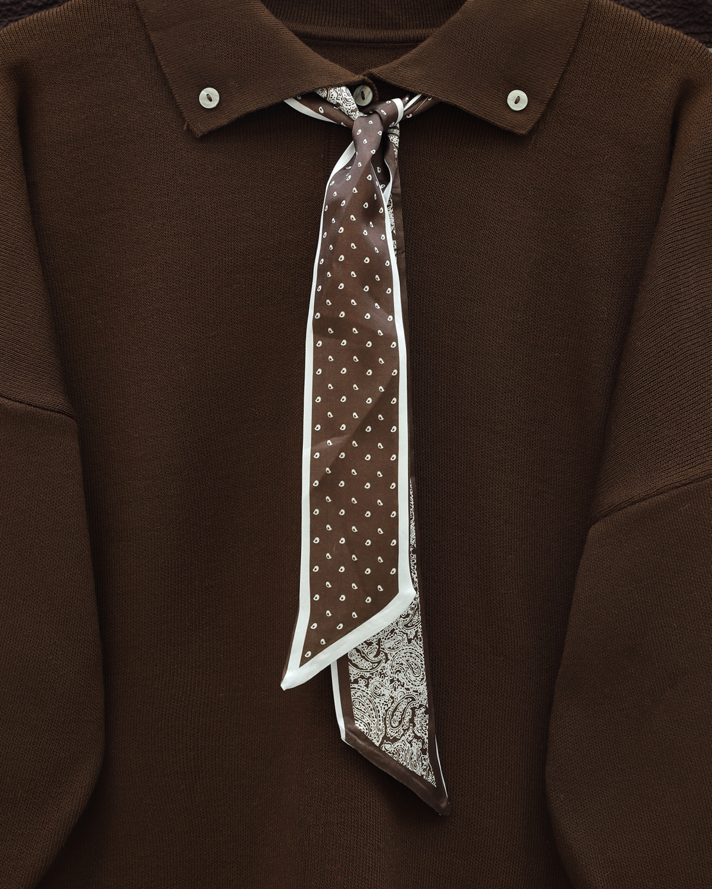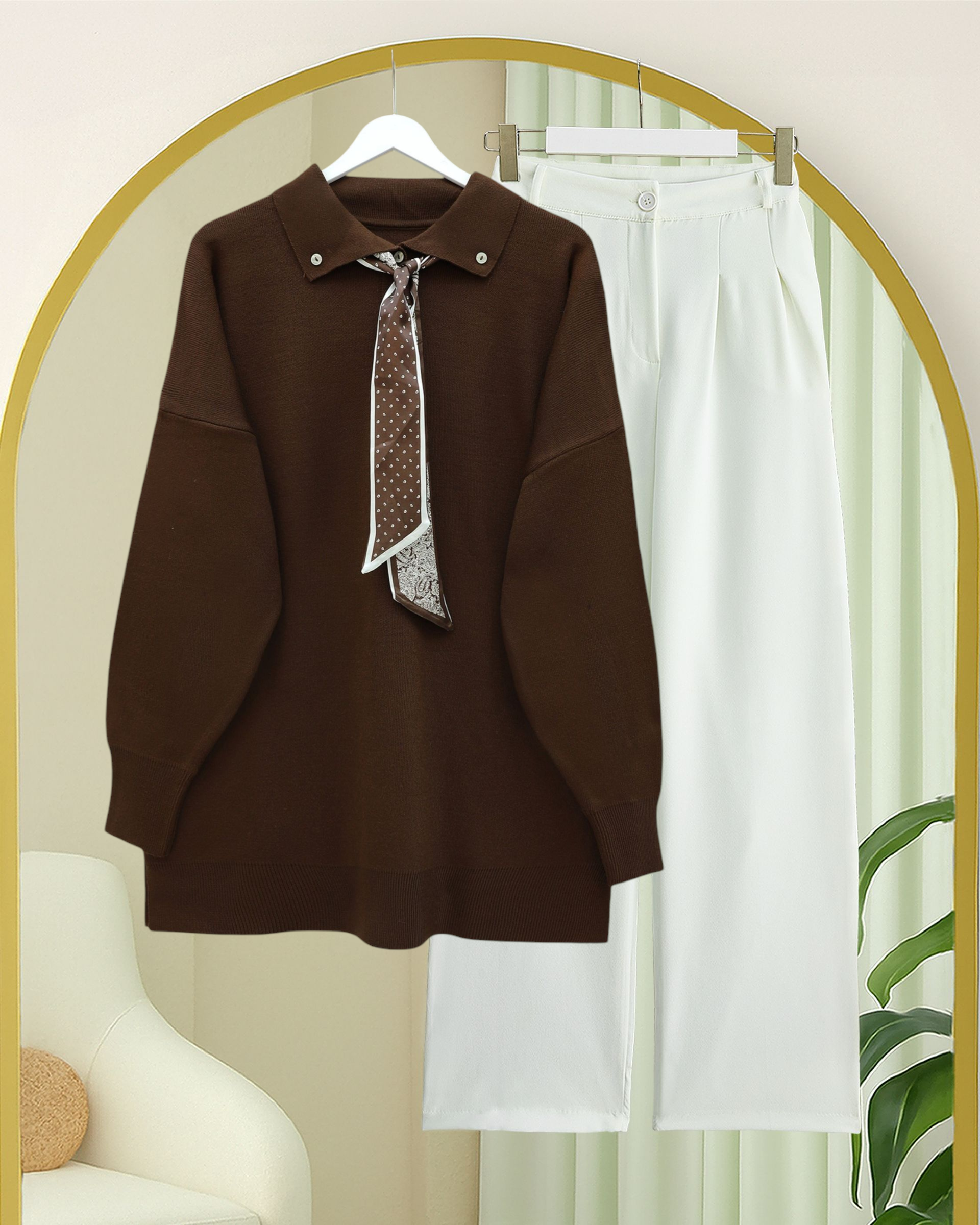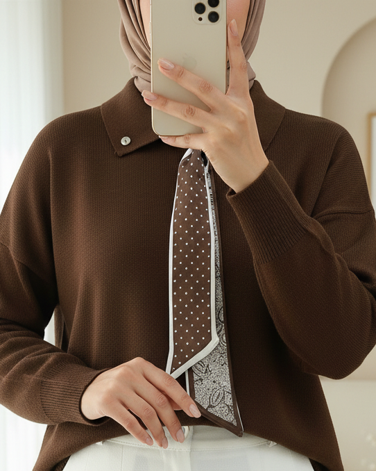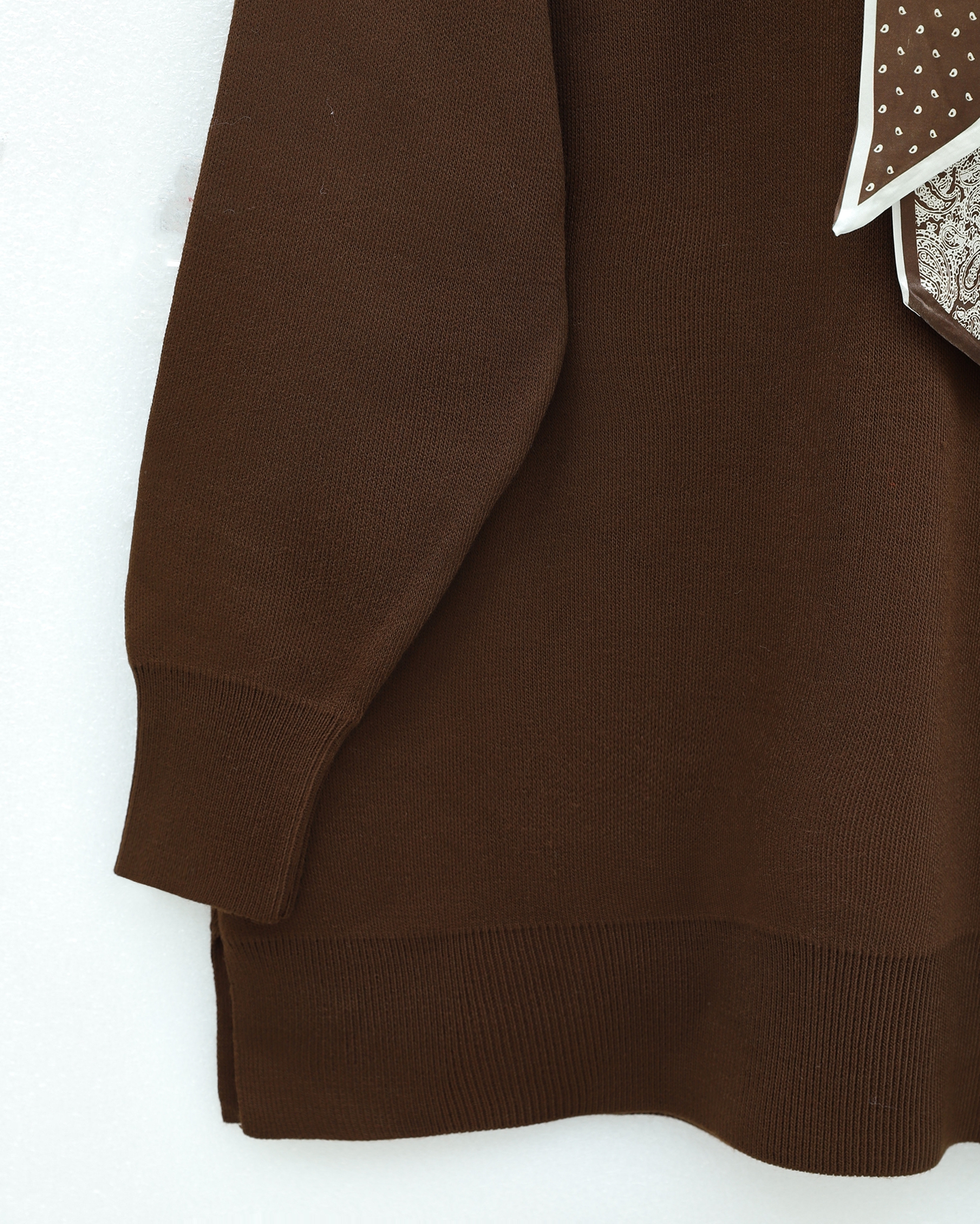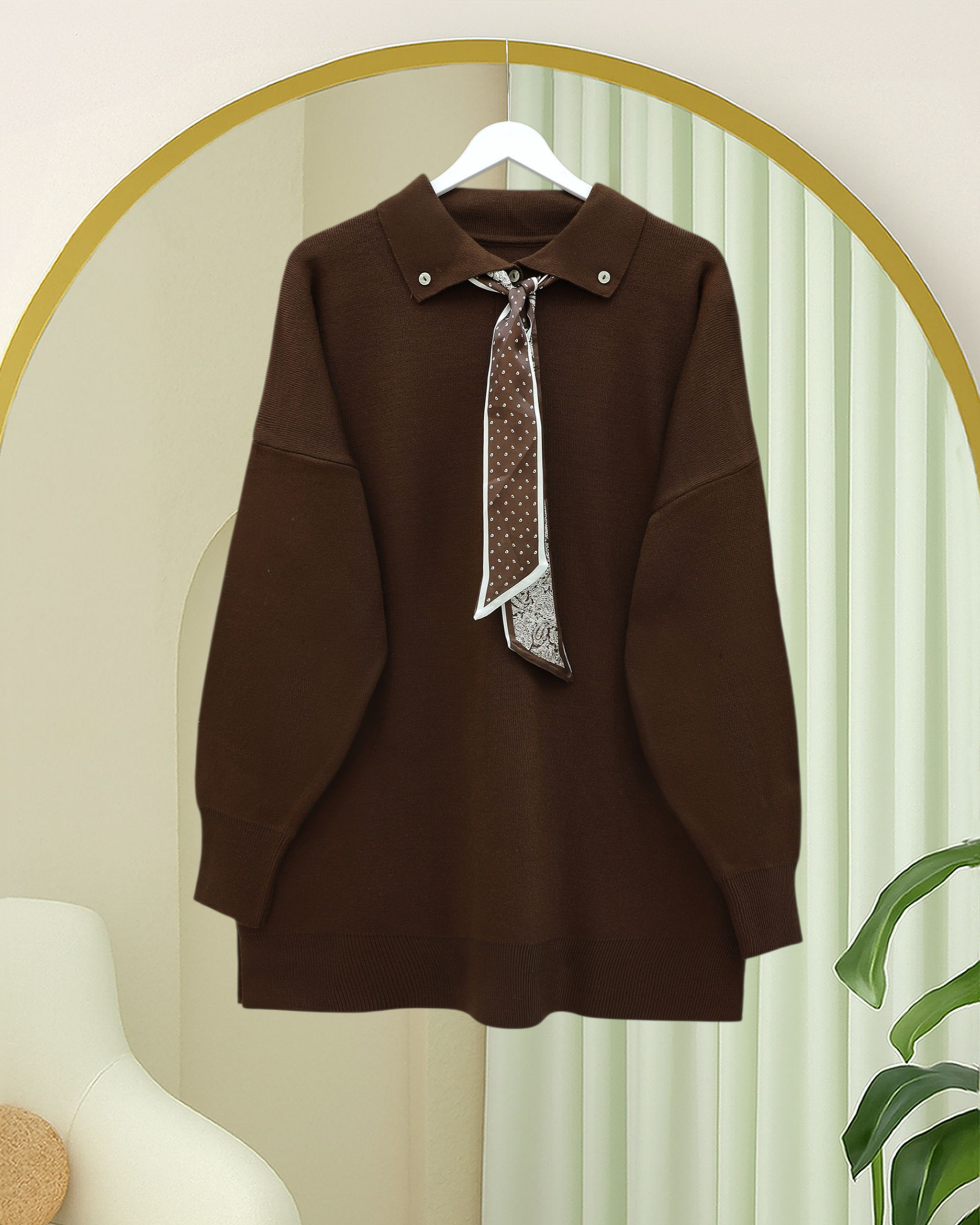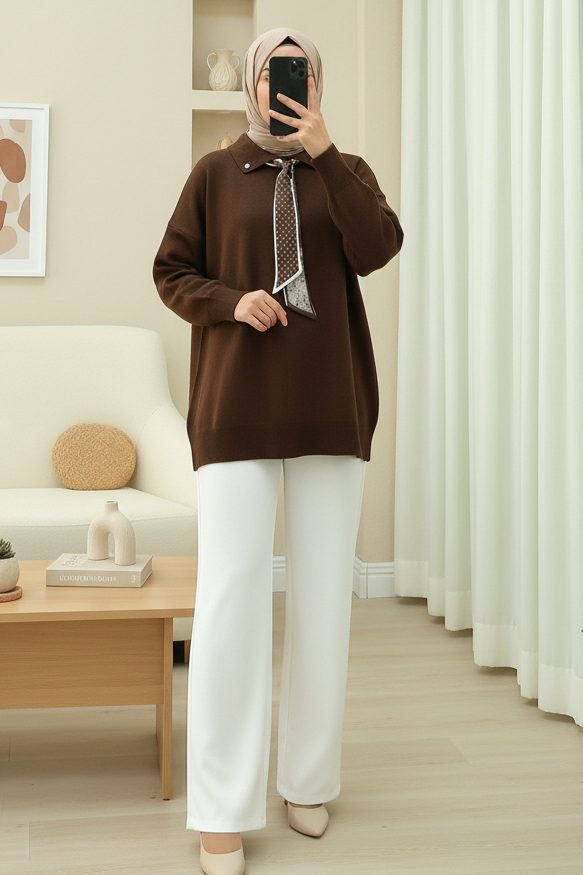 Polo Neck Scarf and Slit Loose Knit Tunic -Brown