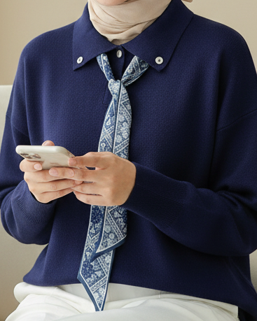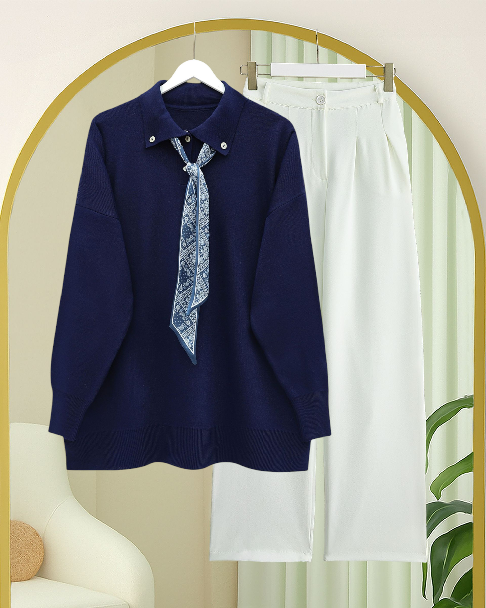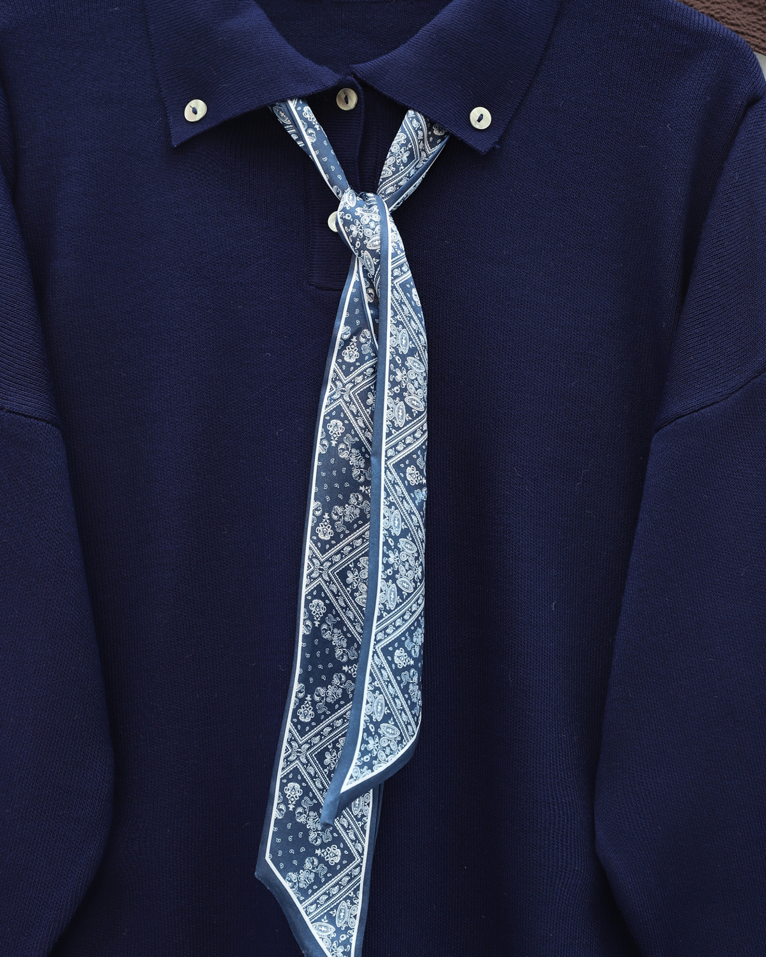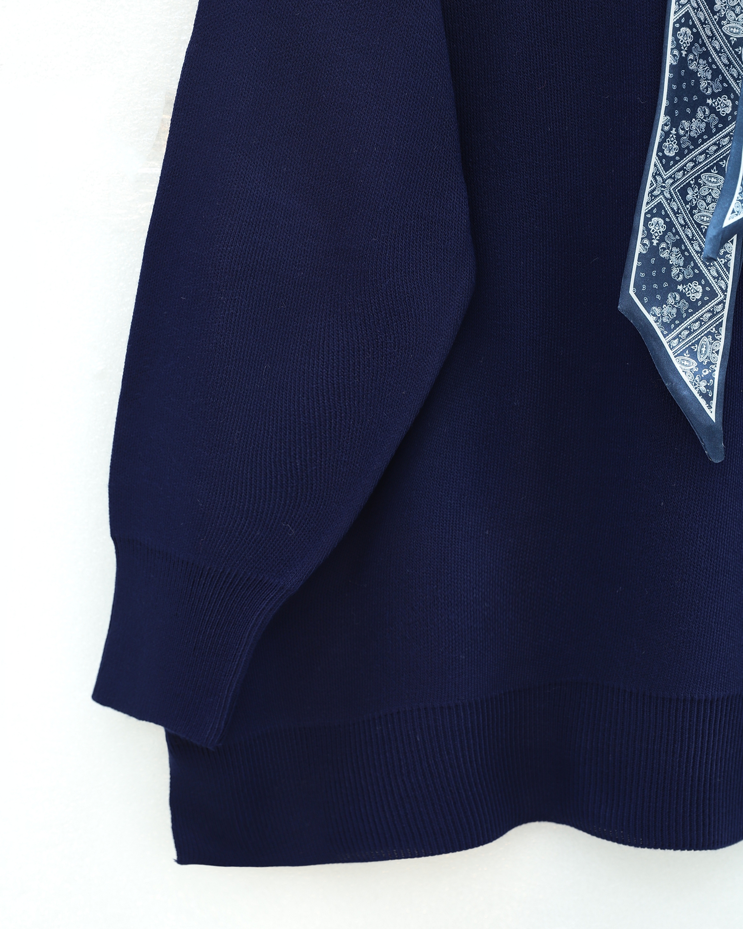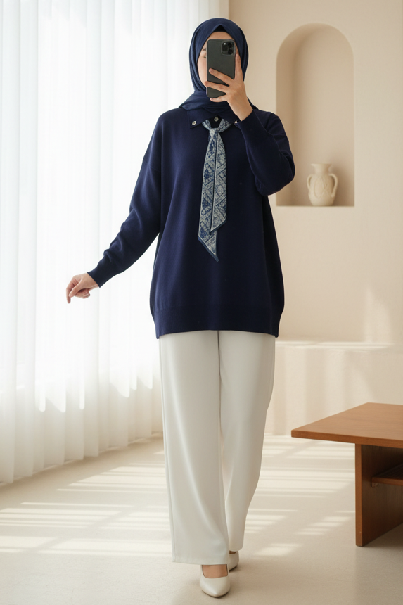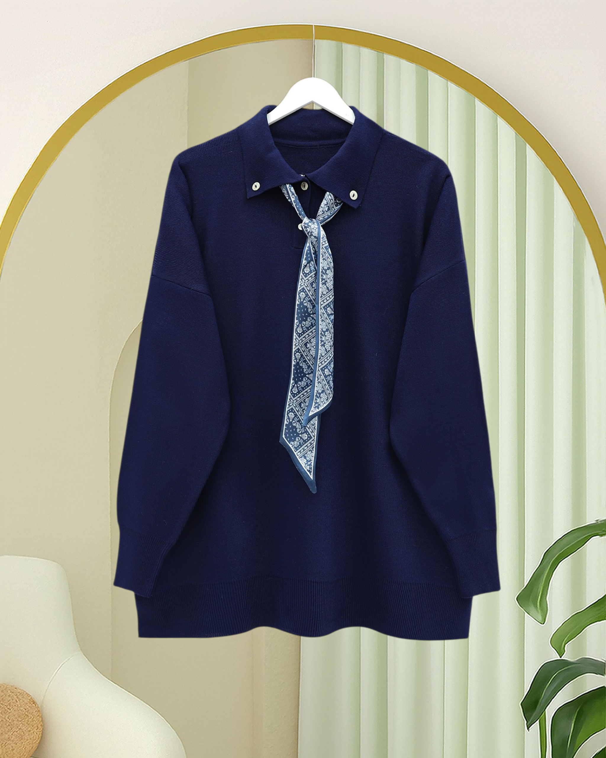 Polo Neck Scarf and Slit Loose Knit Tunic -Navy blue