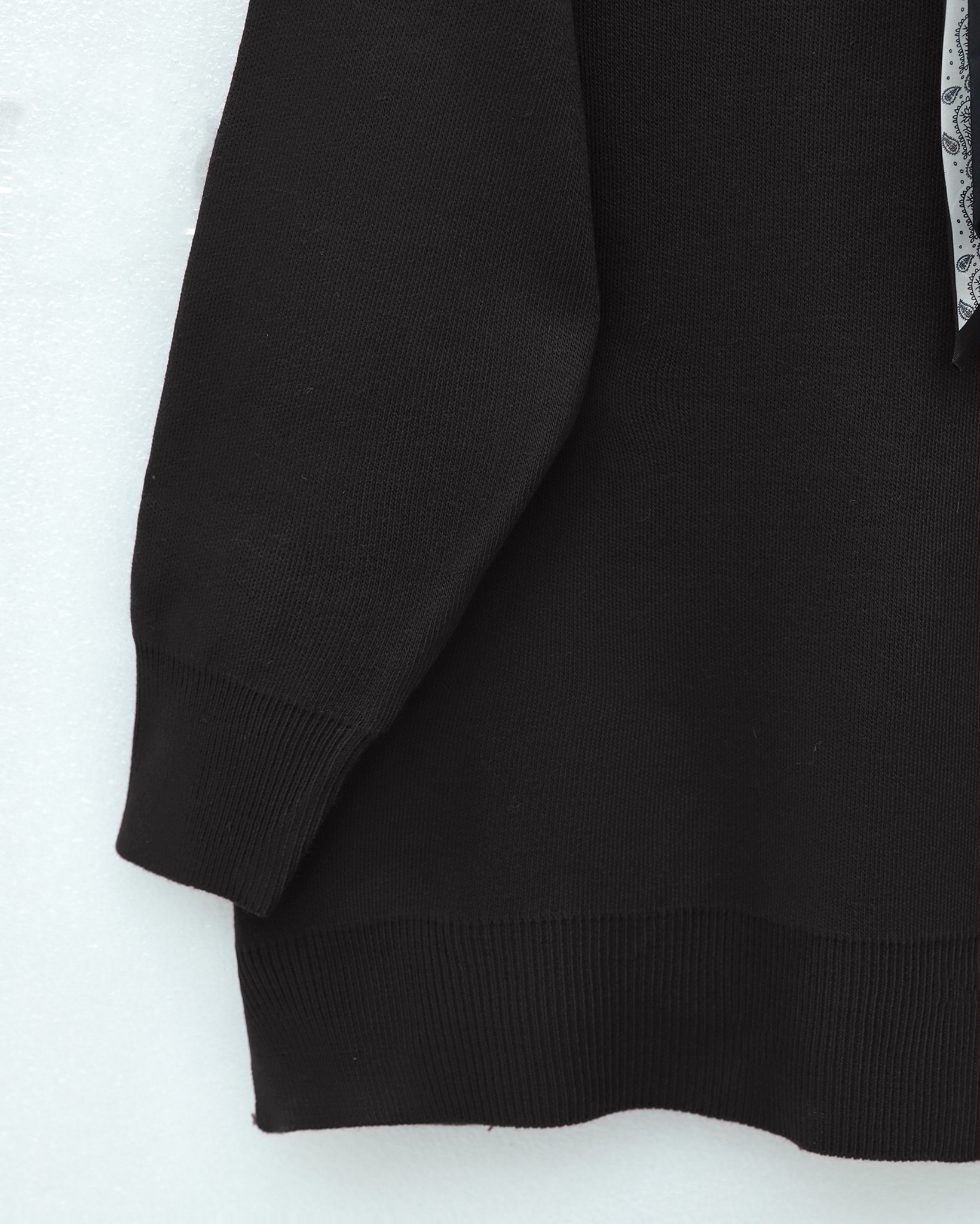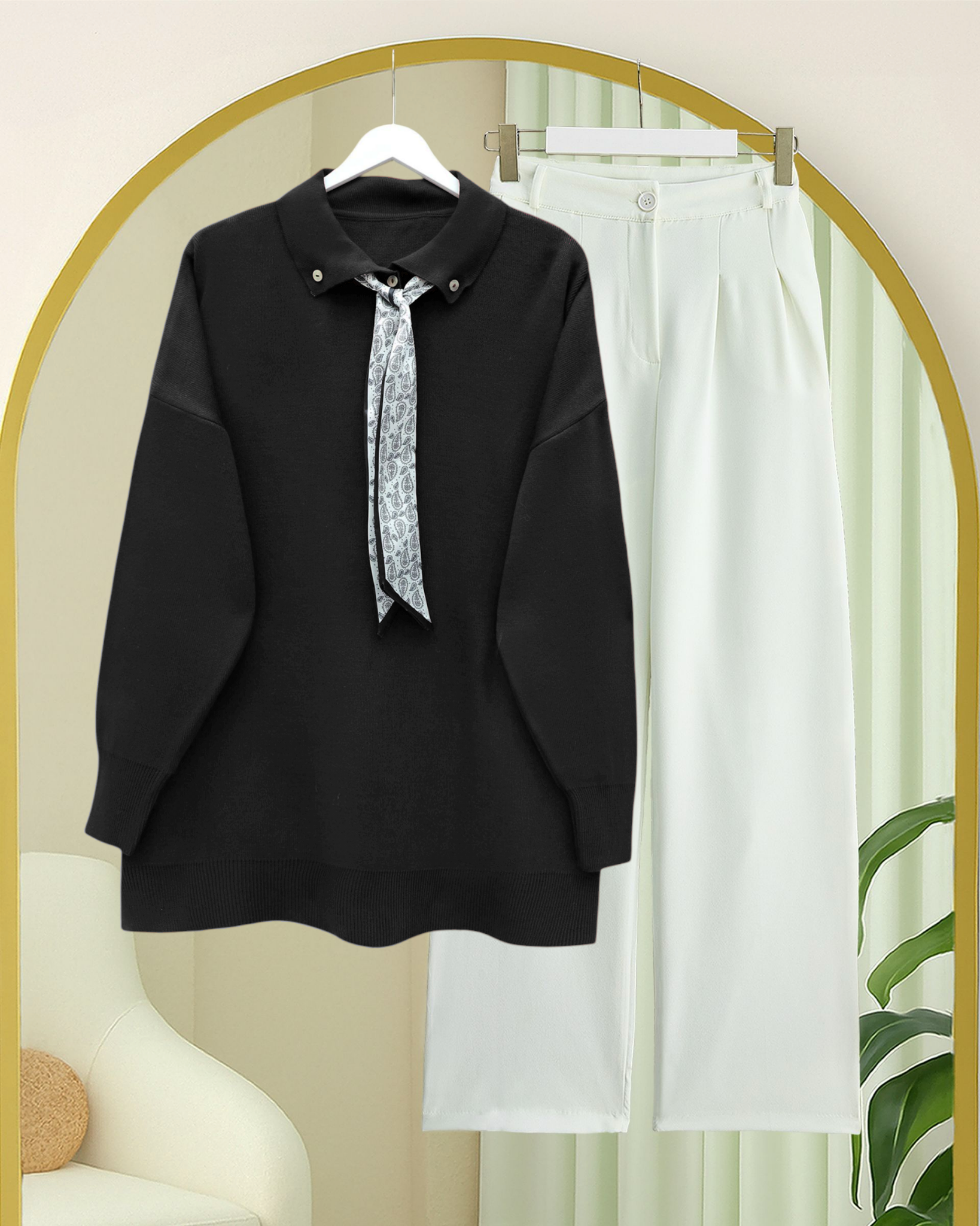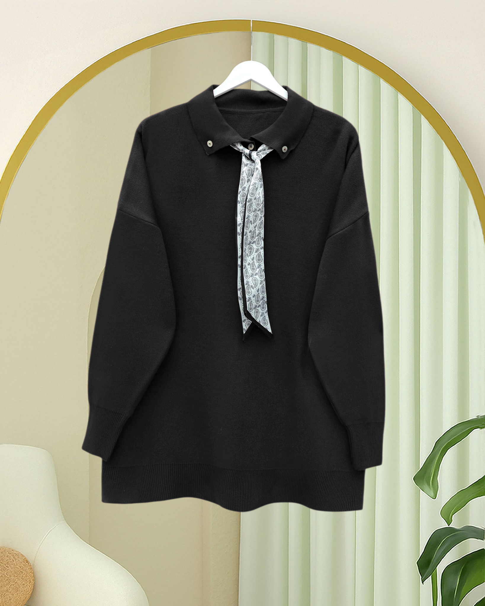 Polo Neck Scarf and Slit Loose Knit Tunic -Black
