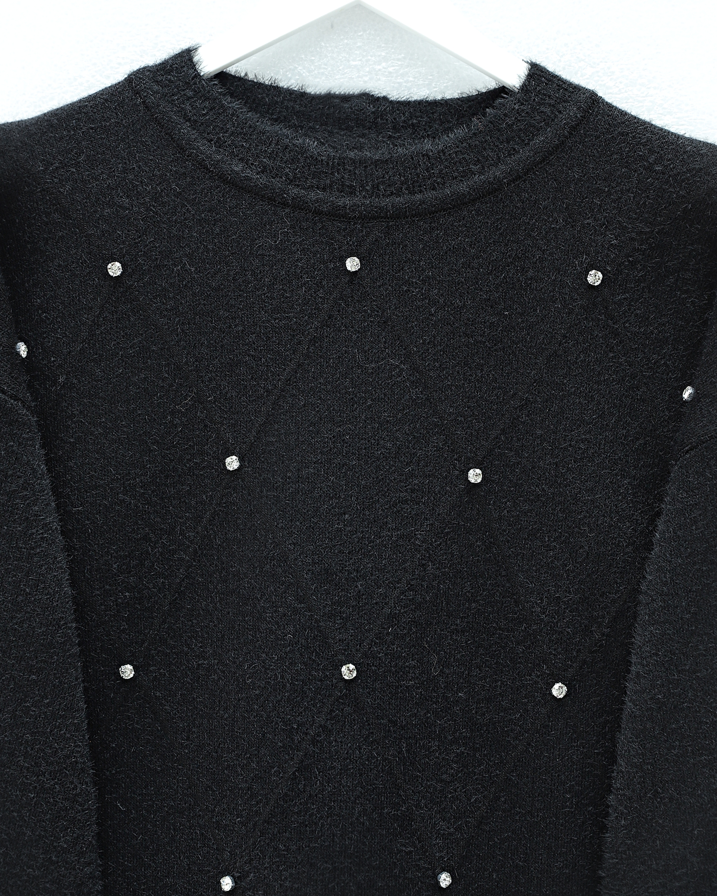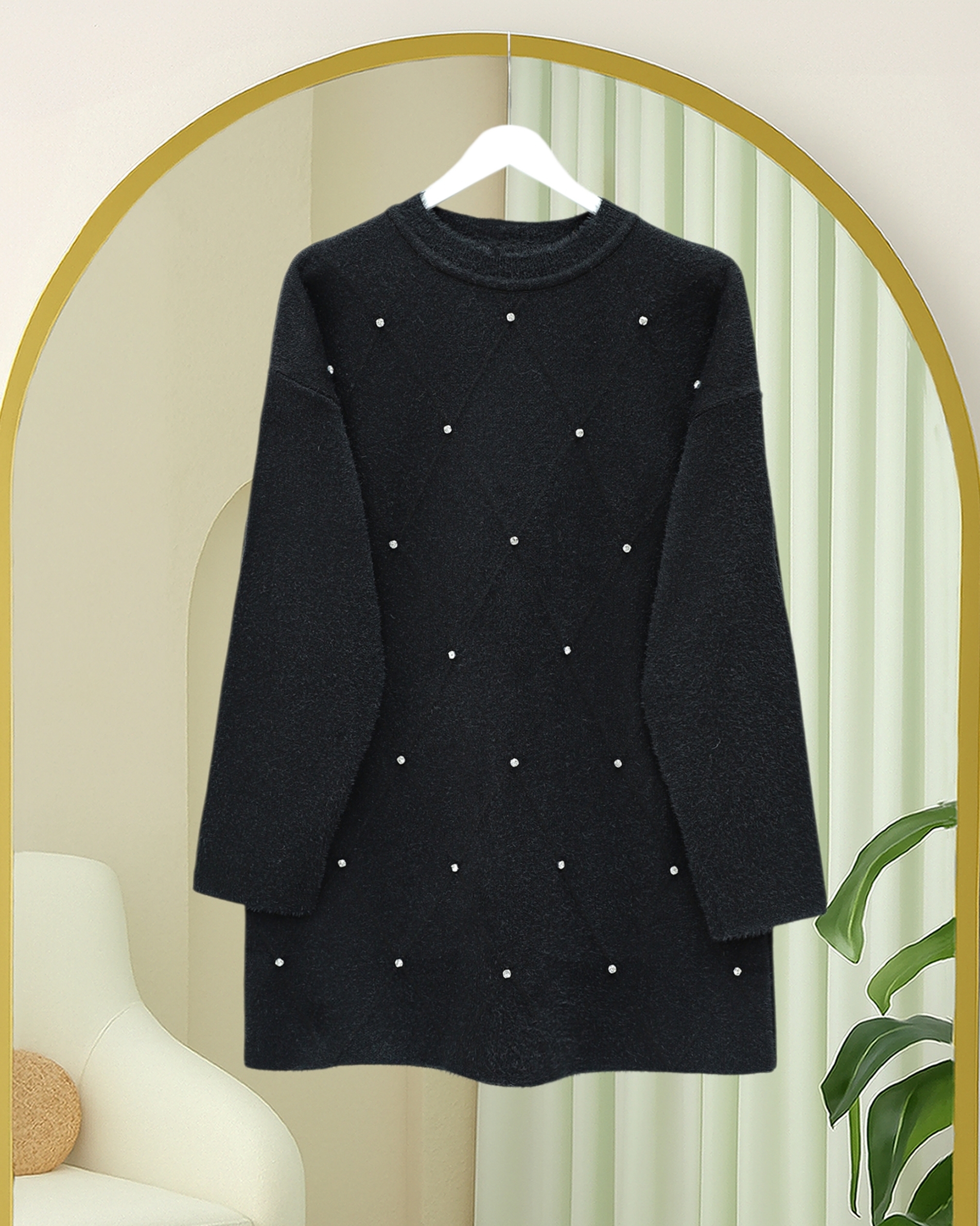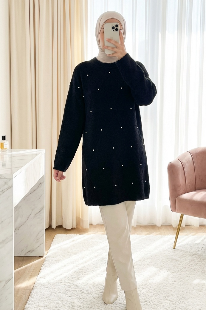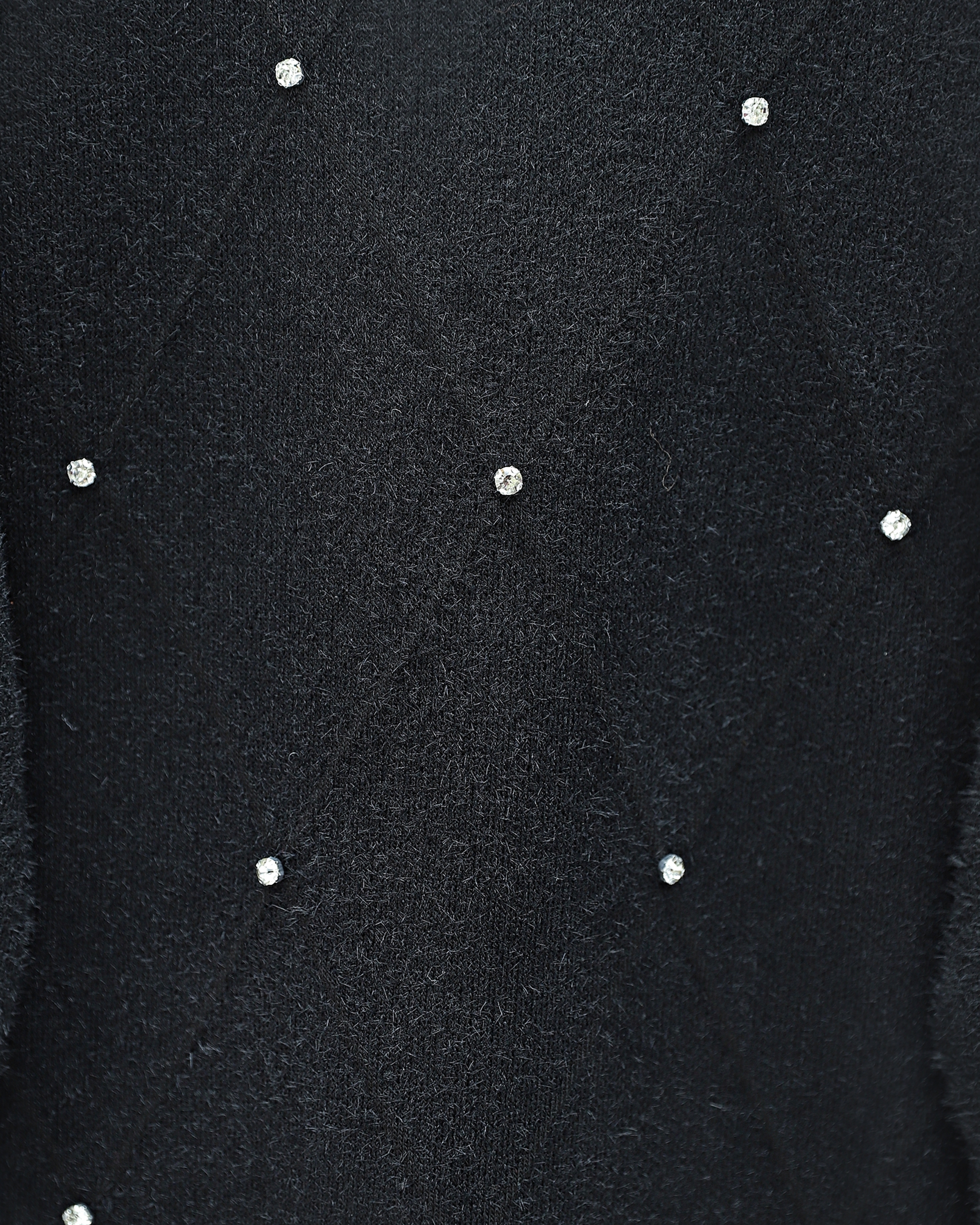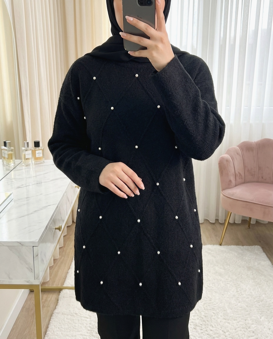 Stone Detail Baklava Pattern Textured Knit Tunic -Black