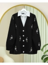 Floral Embroidered Shiny Buttoned Knit Cardigan -Black