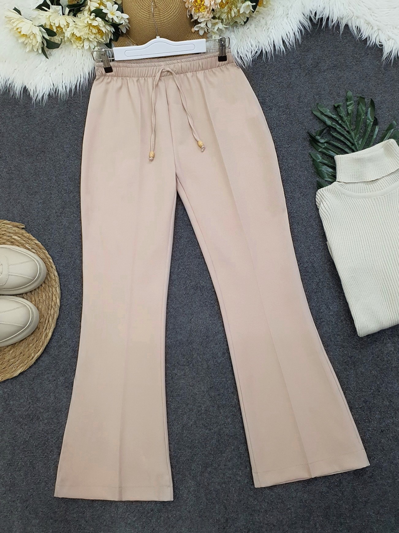 Our elastic waist, flared leg, pocketless trousers model is among the most popular models of the new season.