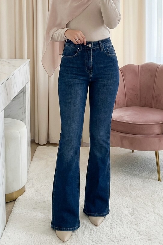 Pocketed, Spanish-style flared, lycra, zippered denim jeans -İndigo