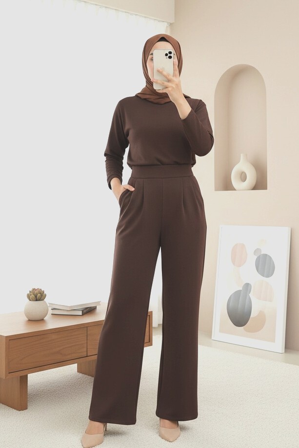 Tube Leg Fabric Trousers with Velcro Waist Detail -Brown