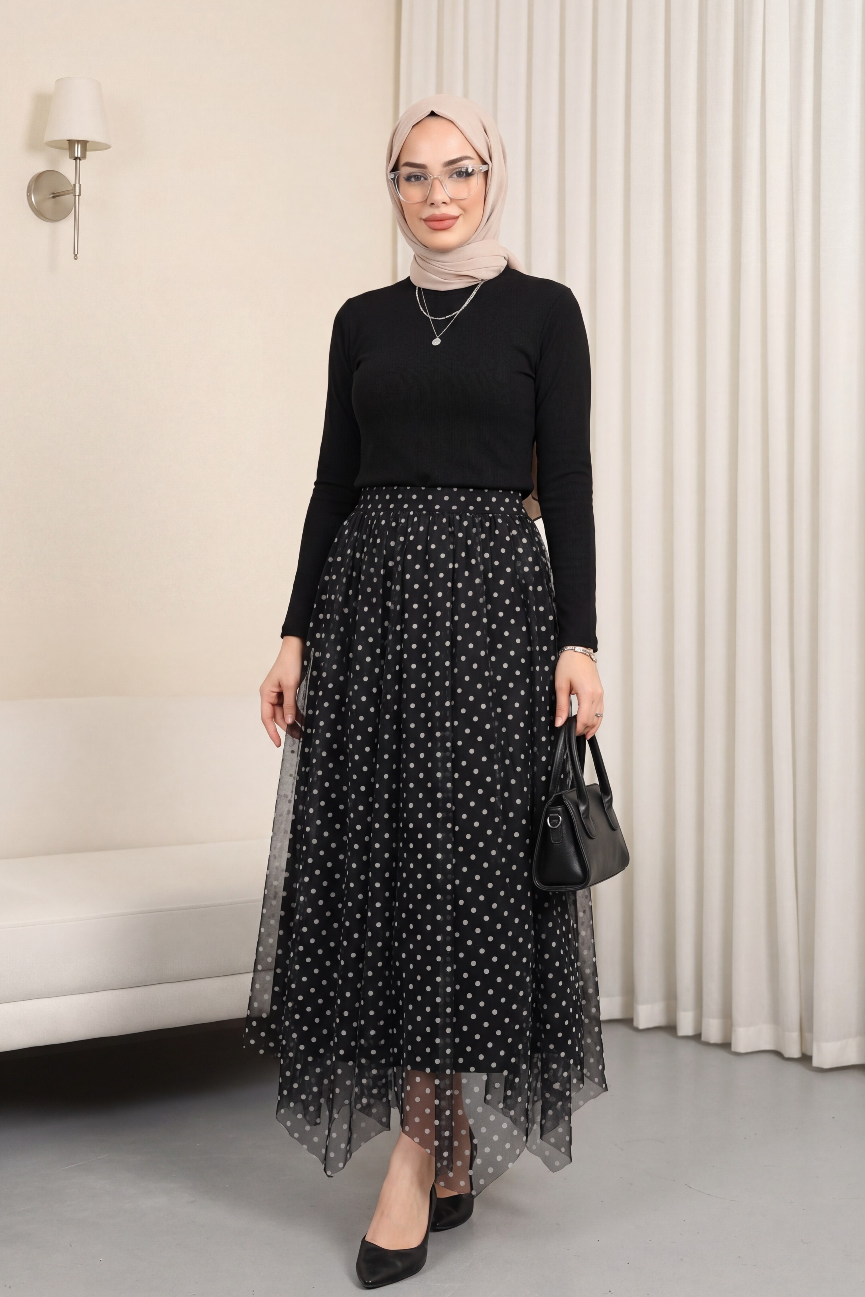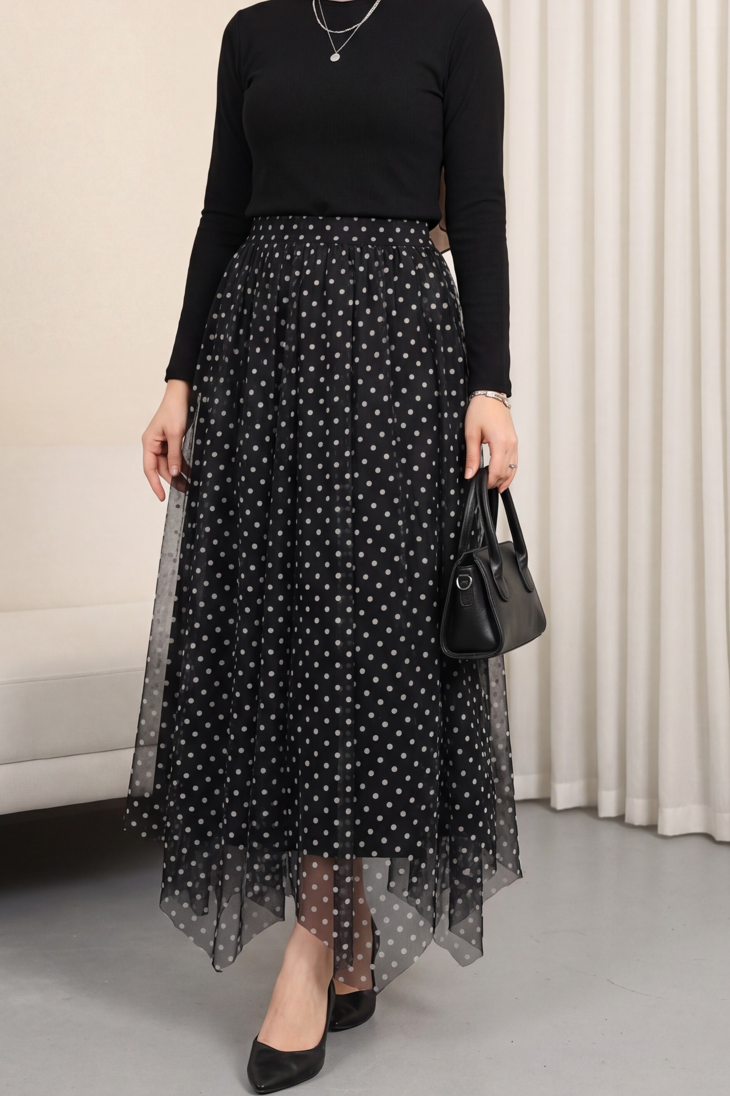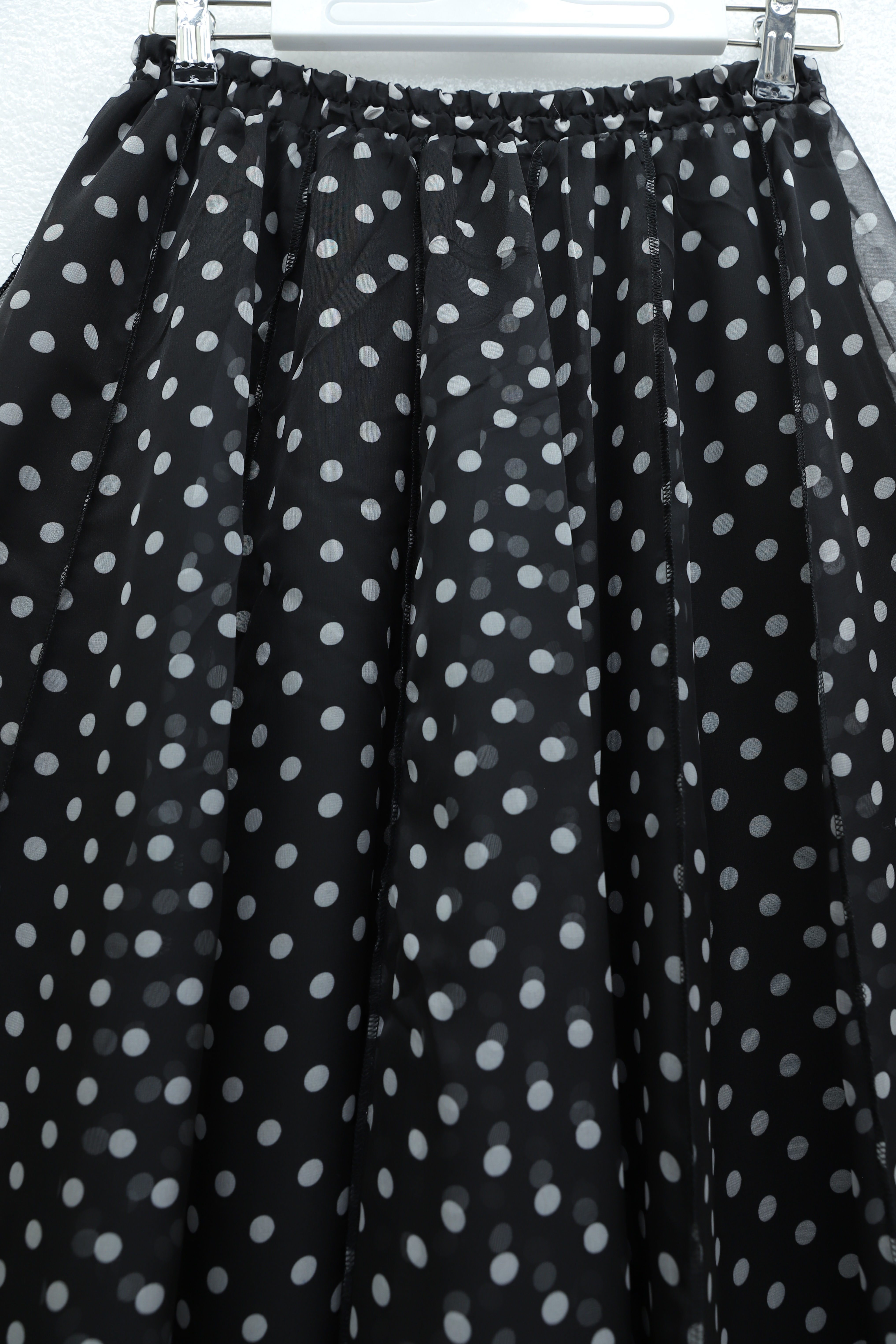 Asymmetrical, panelled, lined chiffon skirt with elasticated waist. -Black