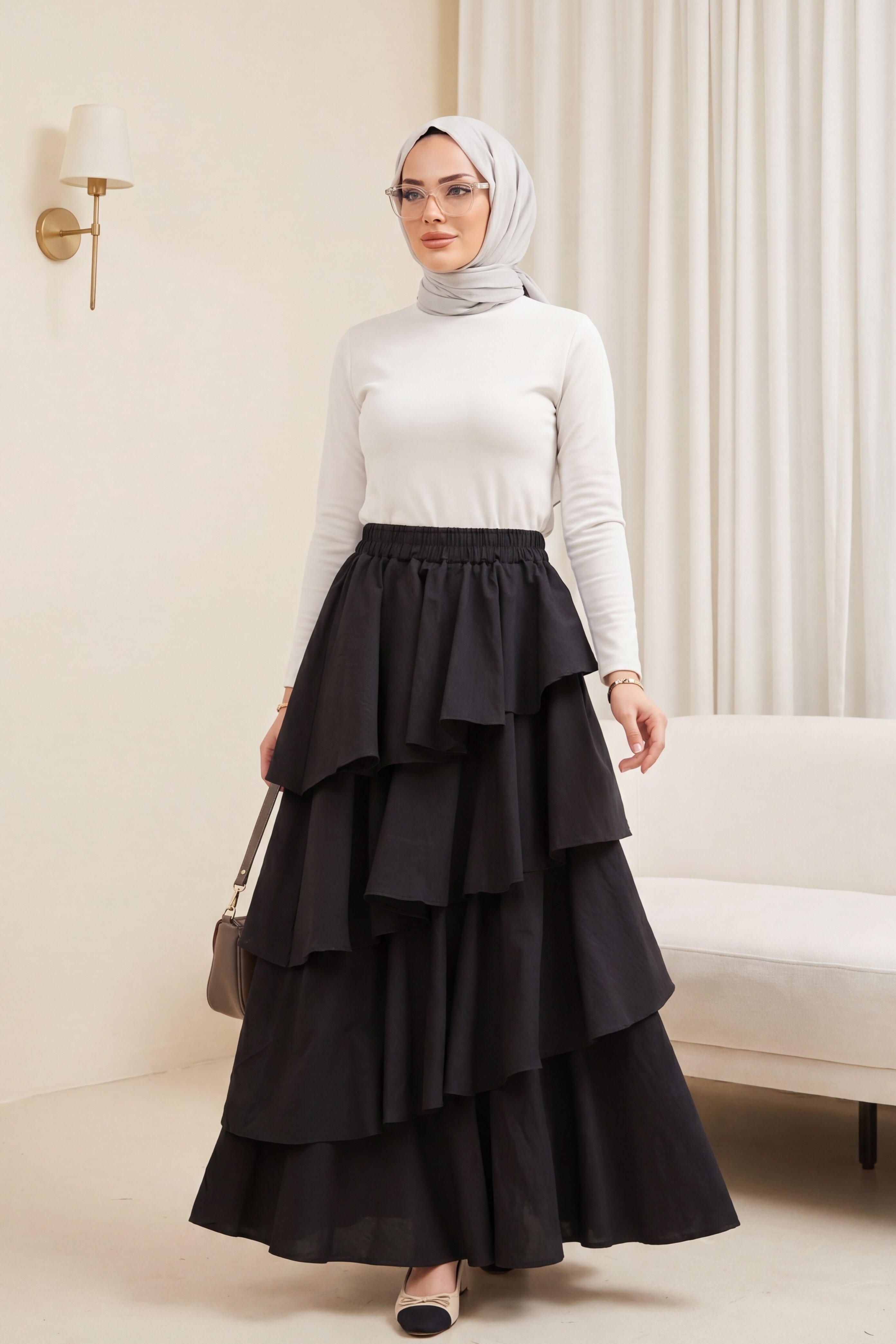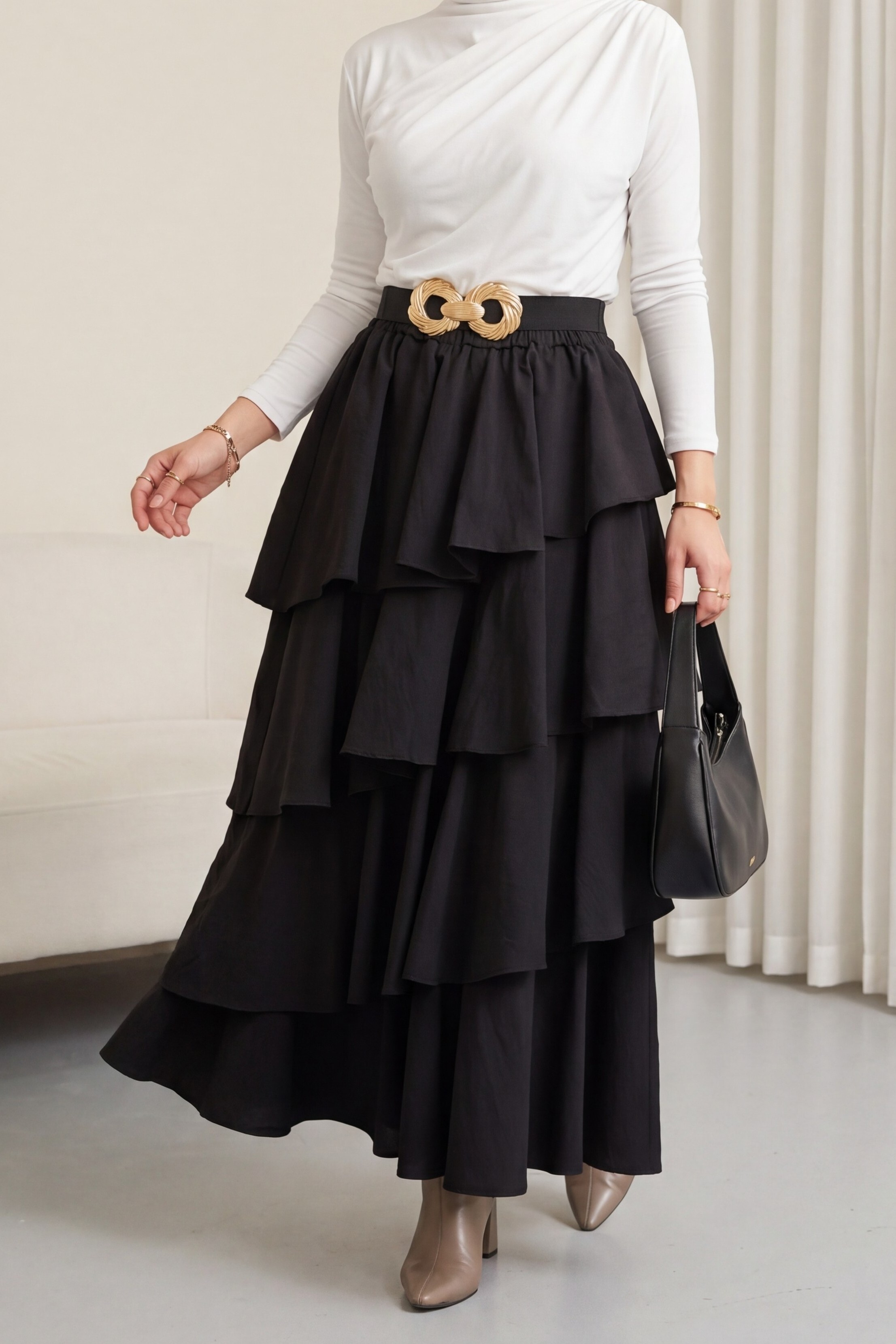 Cupra Skirt with Elastic Waist and Layered Lining -Black