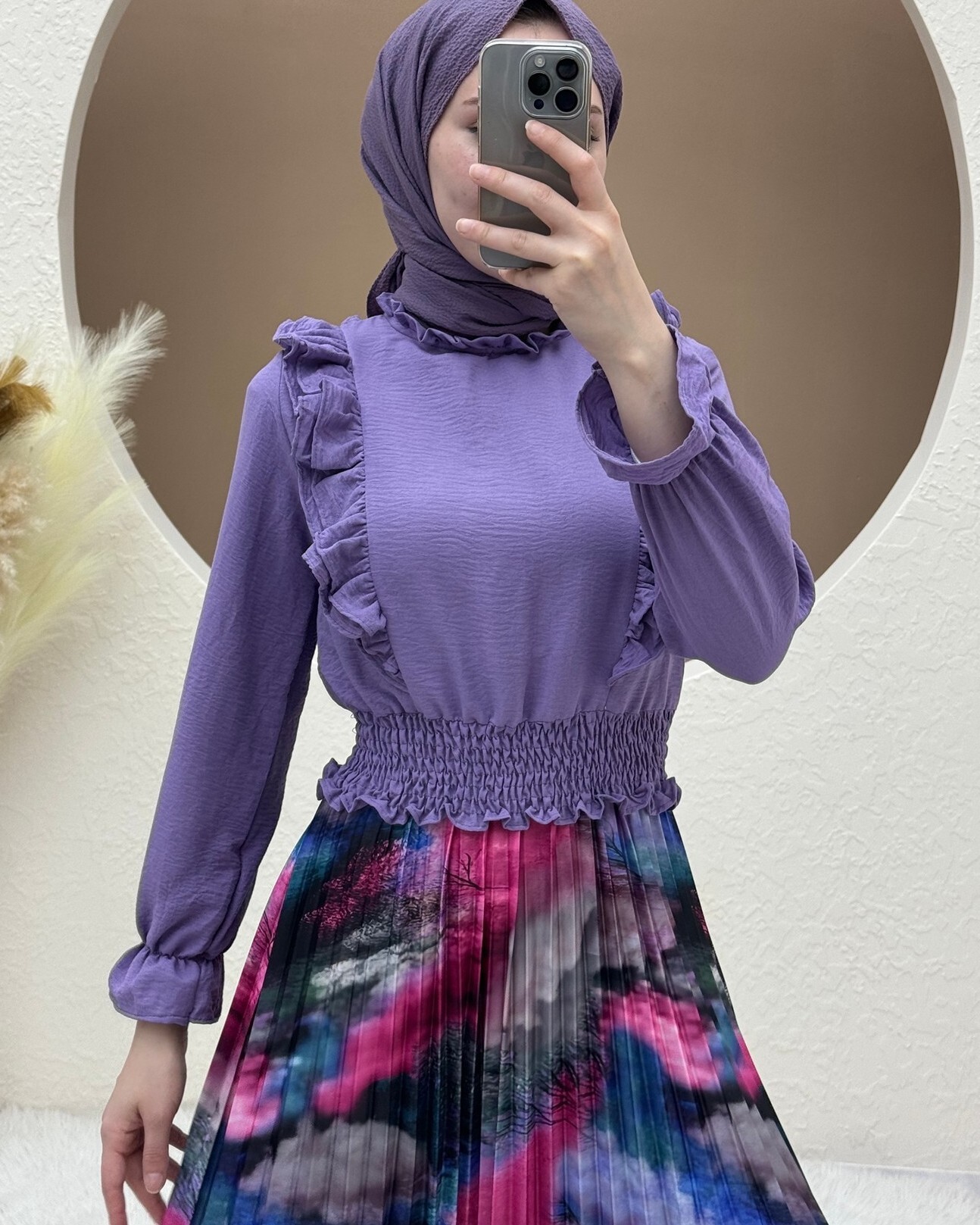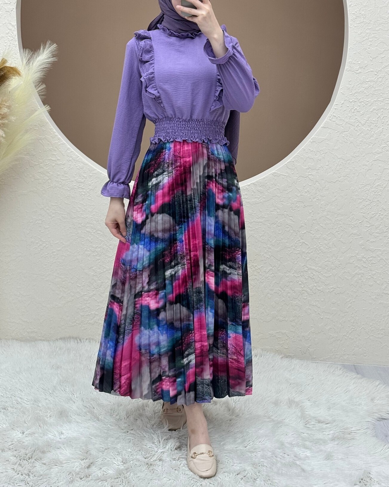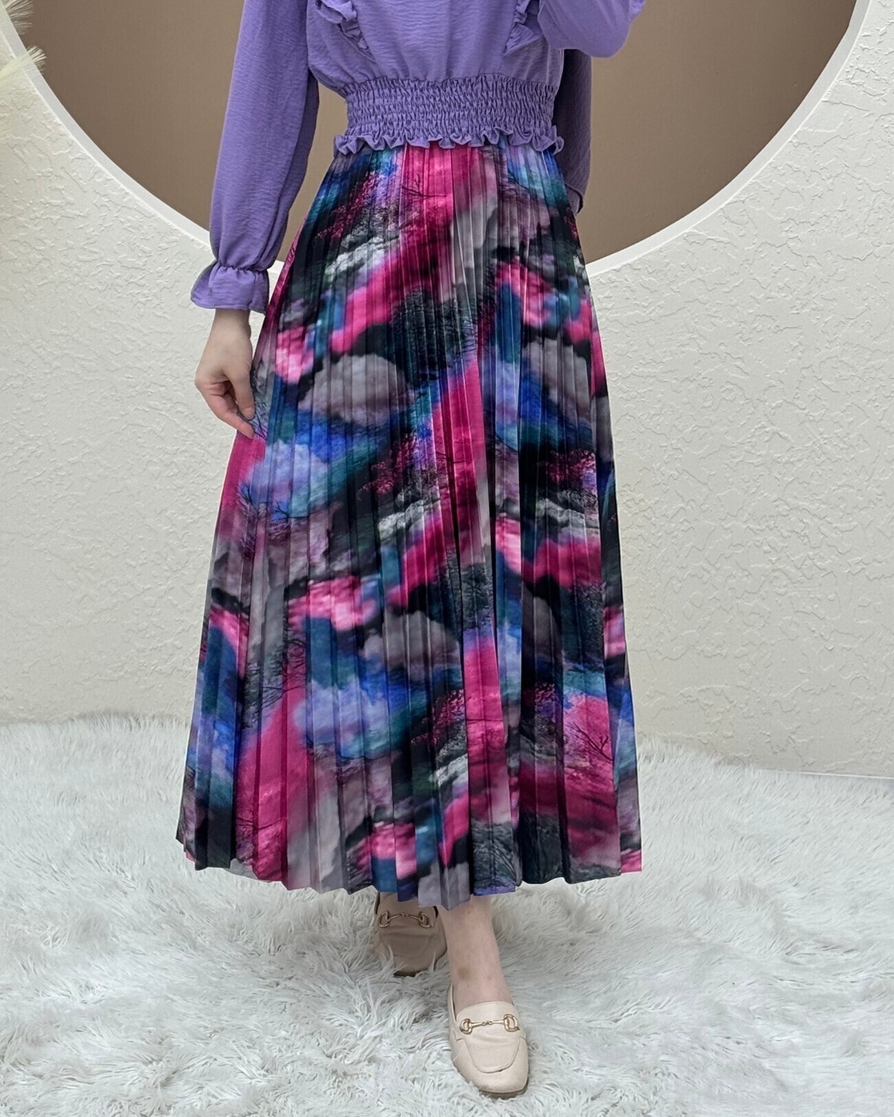 "The Digital Print Pleated Skirt stands out with its modern design and stylish details. The vibrant and unique patterns created with digital printing give the skirt a one-of-a-kind look. The pleated design adds movement and dynamism to your outfit. Perfect for both casual wear and special occasions, this skirt offers both elegance and comfort. Express your style with digital print pleated skirts now!"