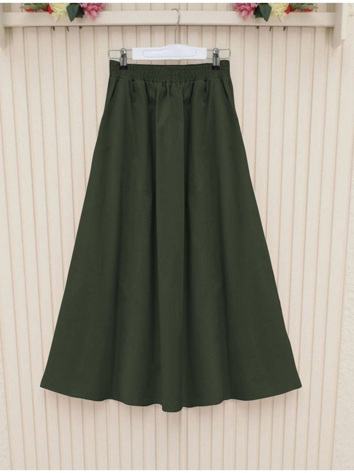 Elastic Waist Double Pocket Gabardine Skirt -Khaki -