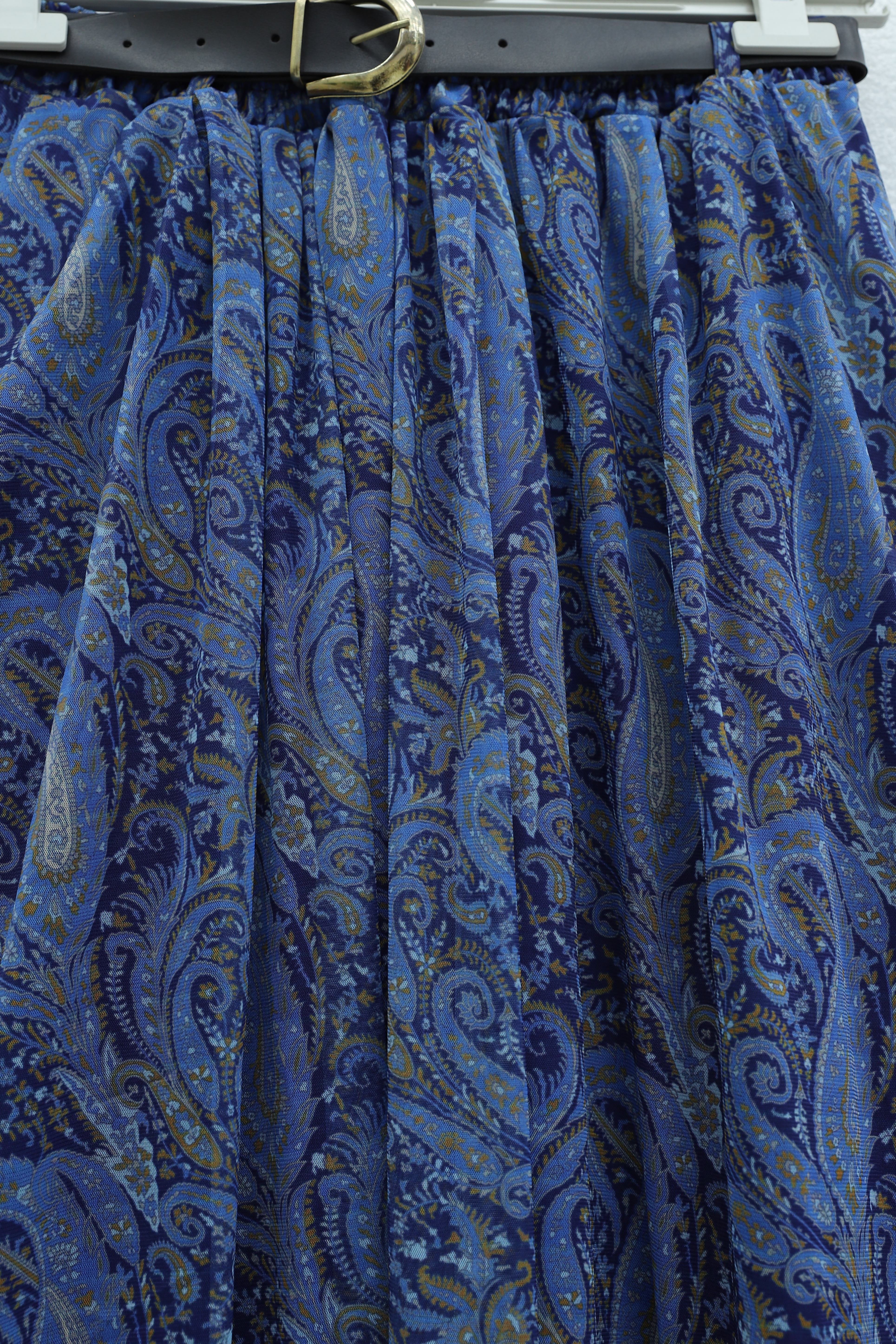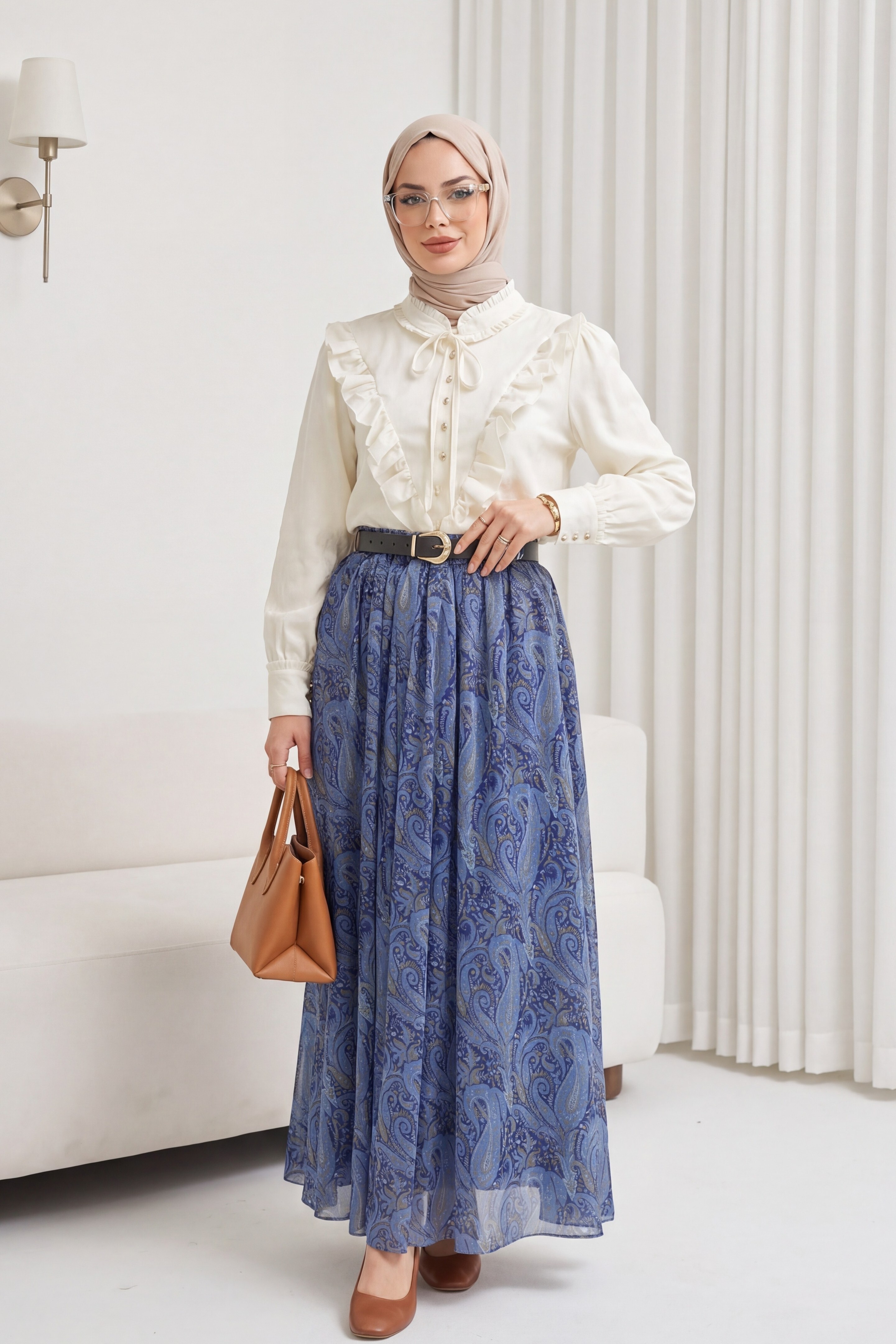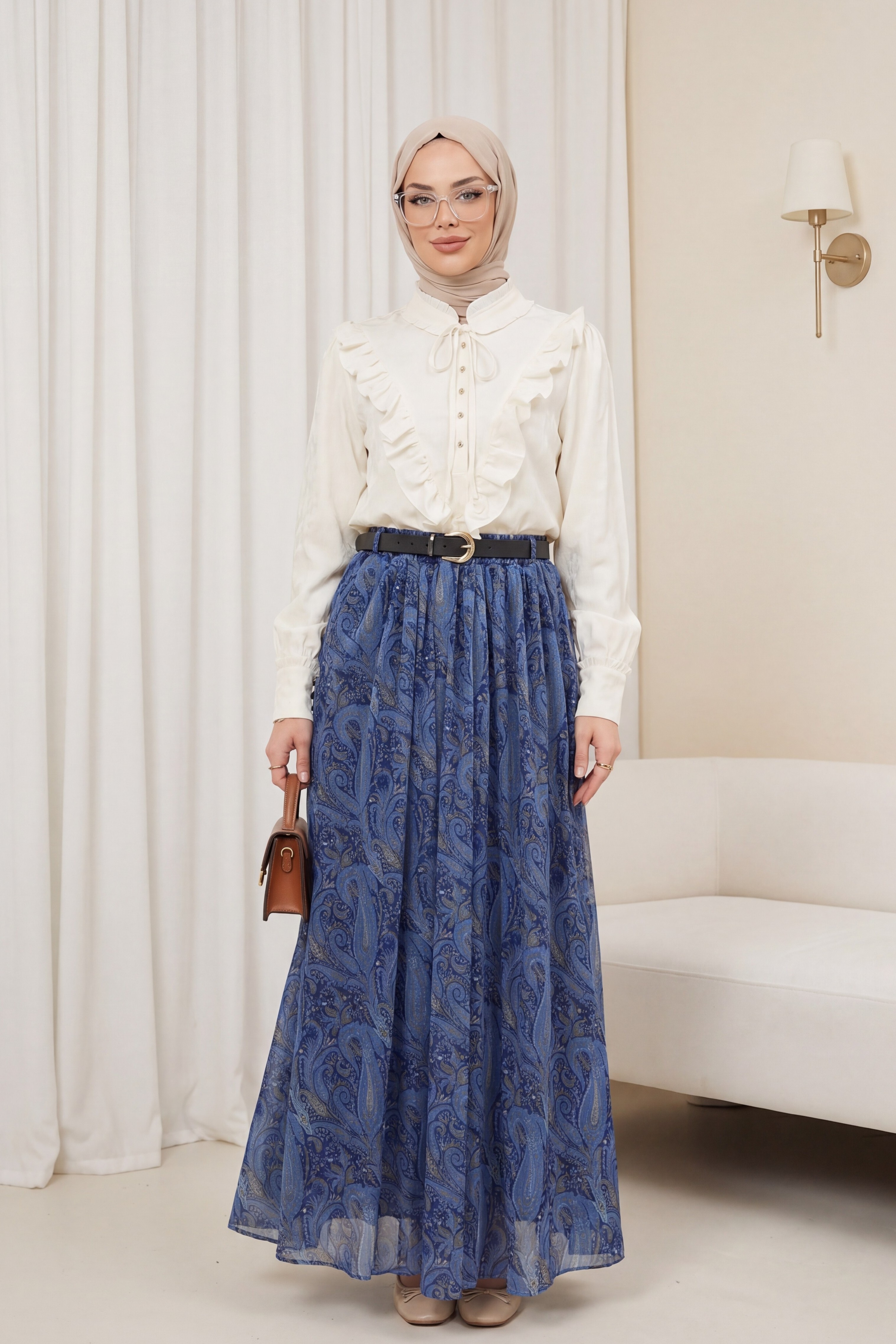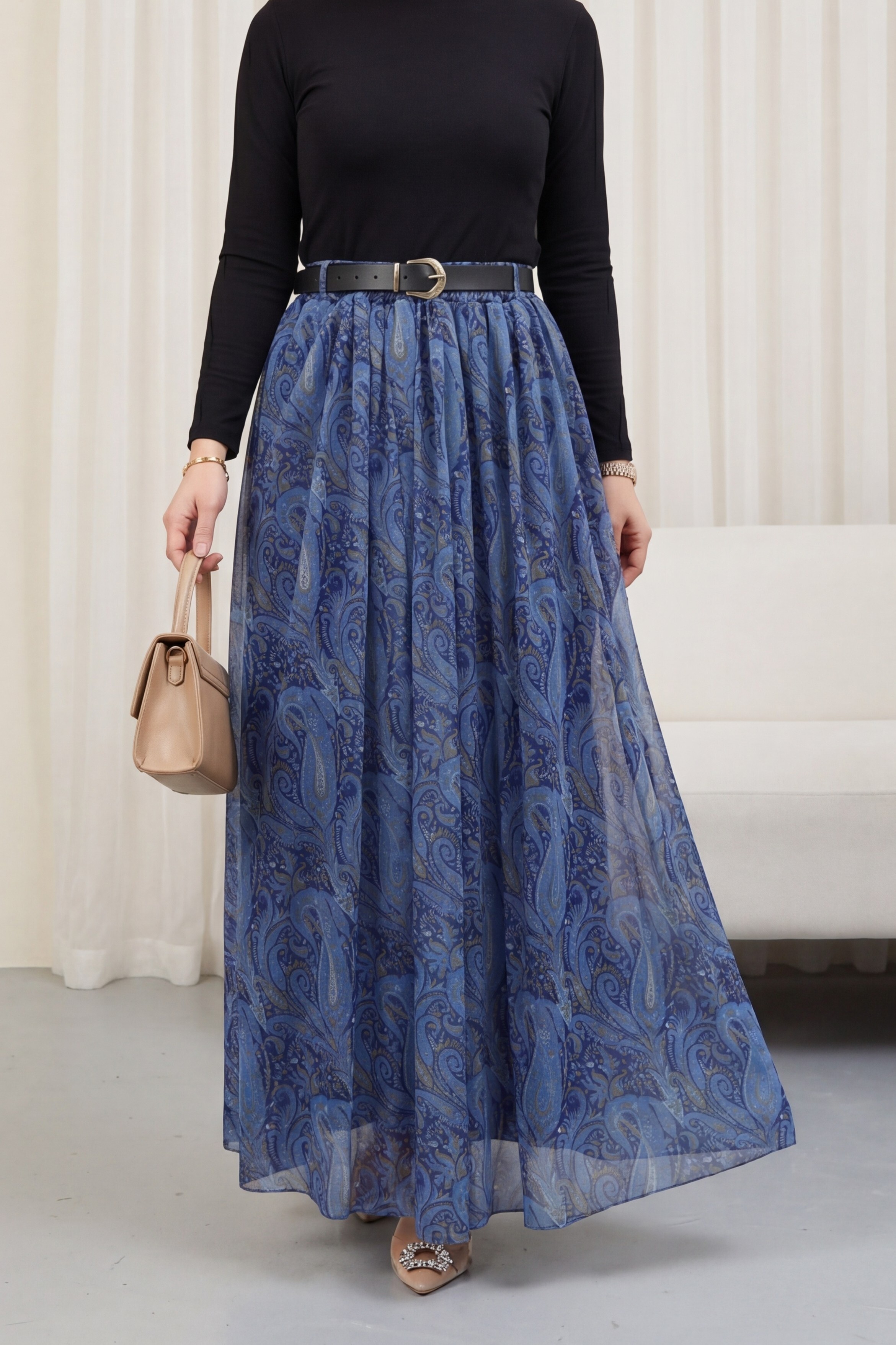 Elasticated Waist Belted Lined Patterned Tulle Skirt -İndigo