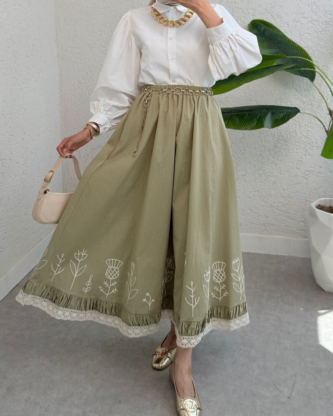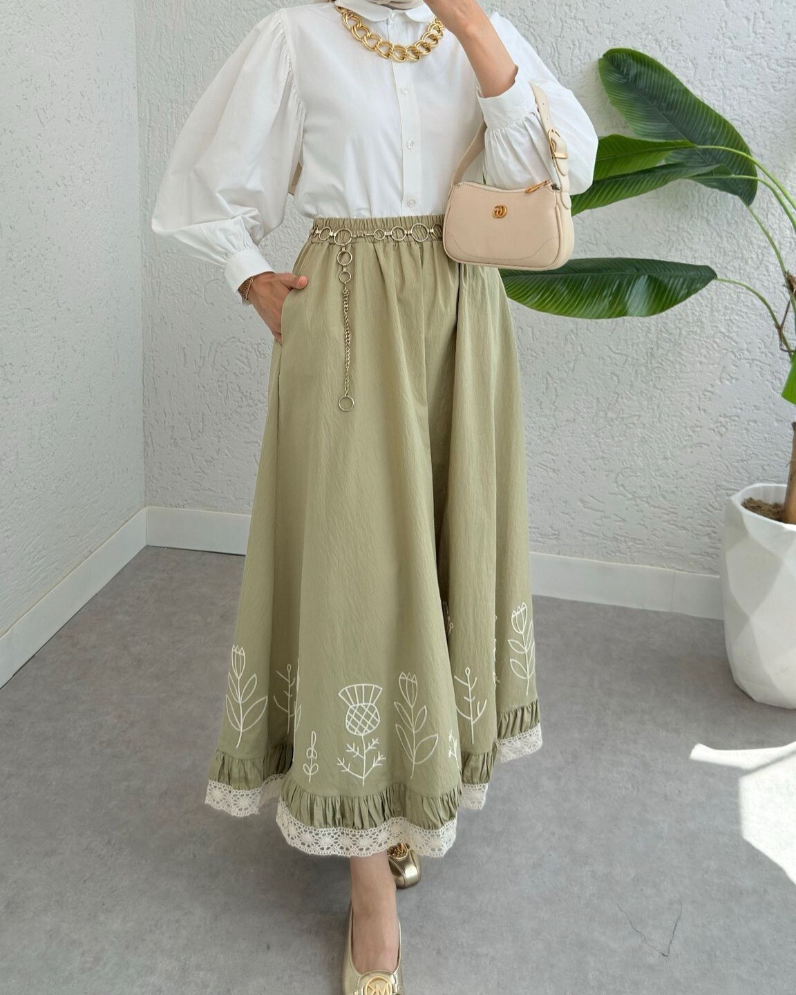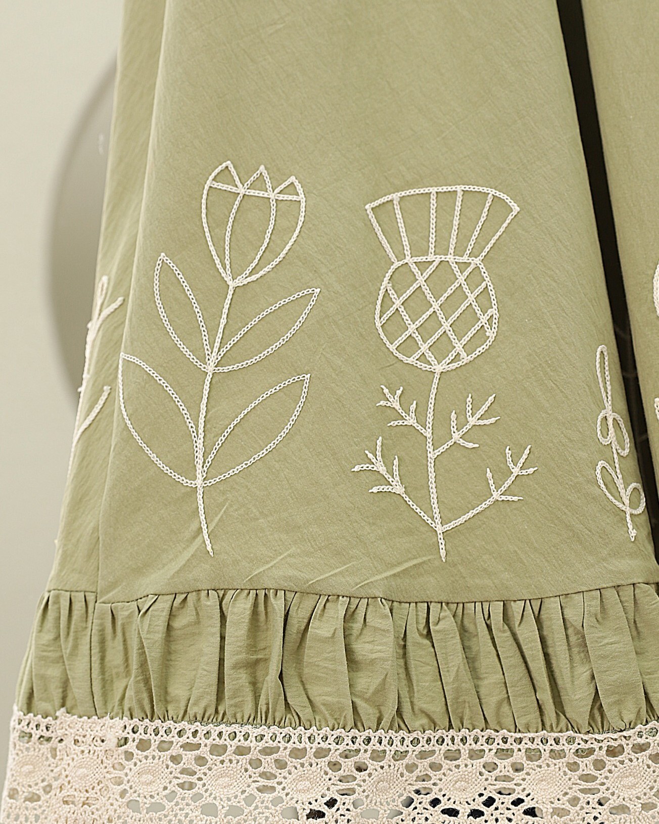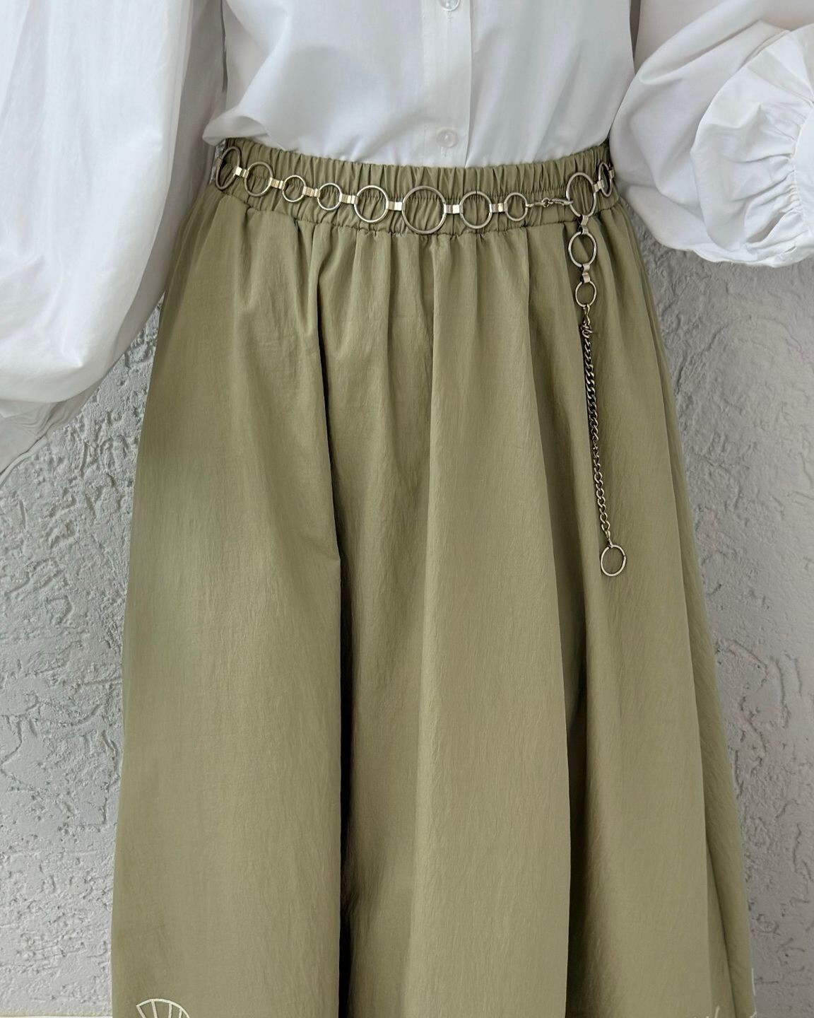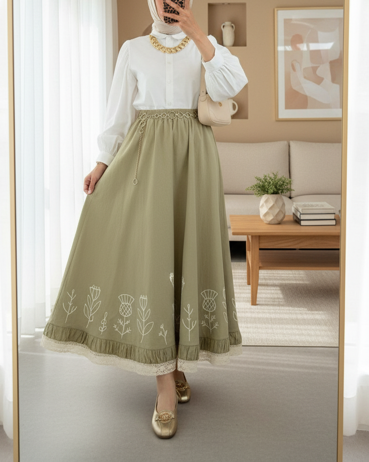 Lace Embroidered Elastic Waist Skirt -Cagla Green