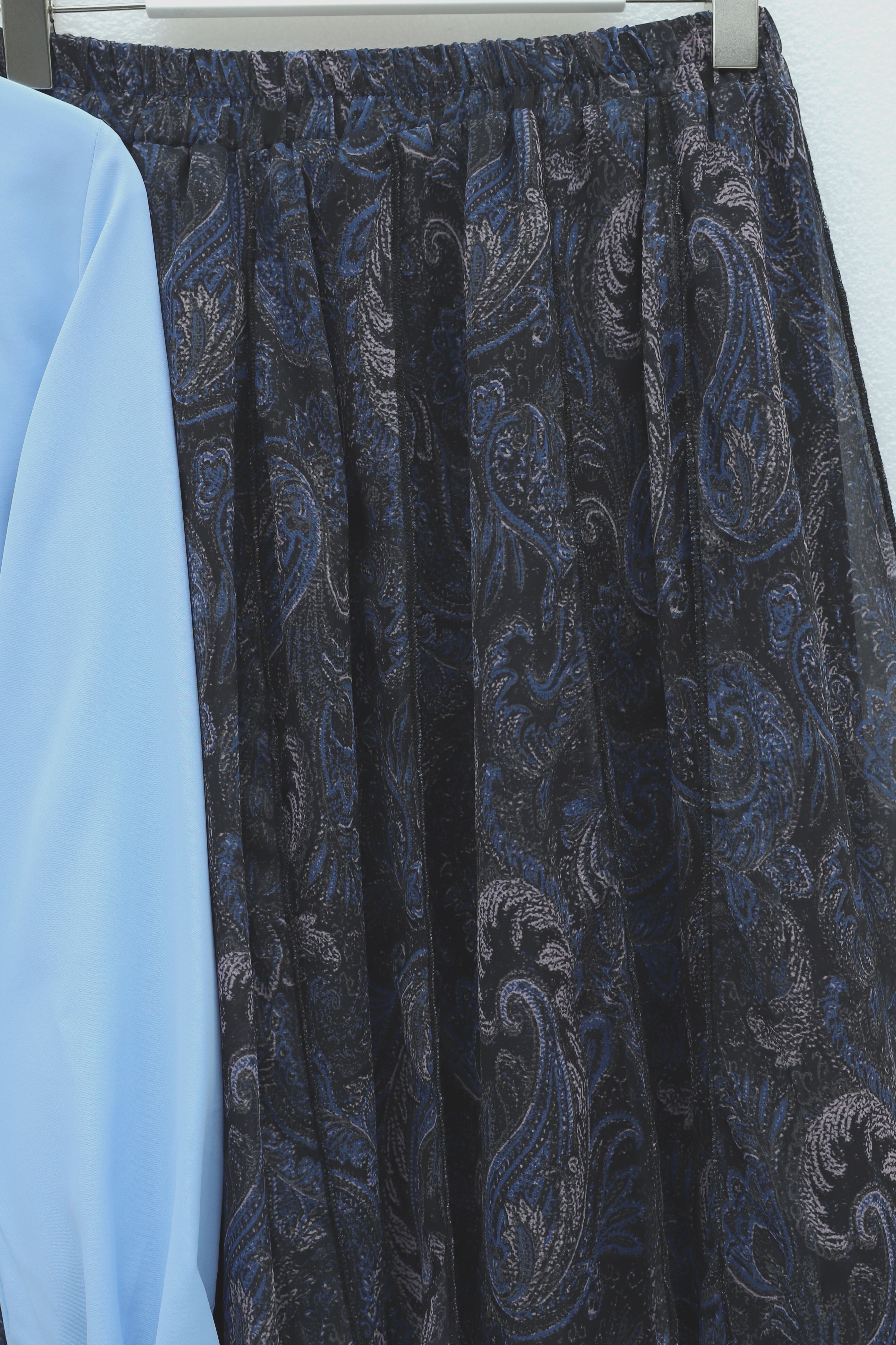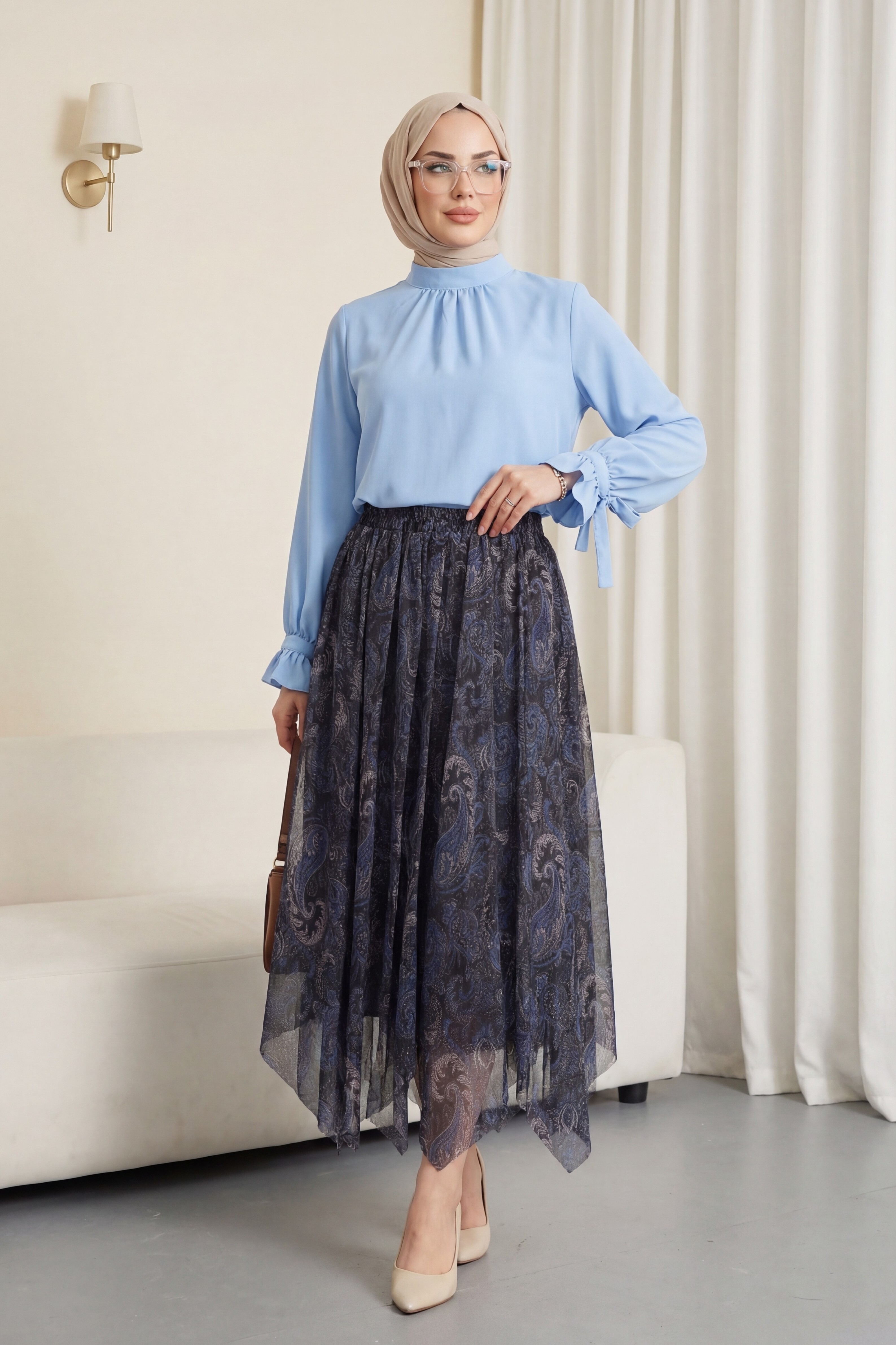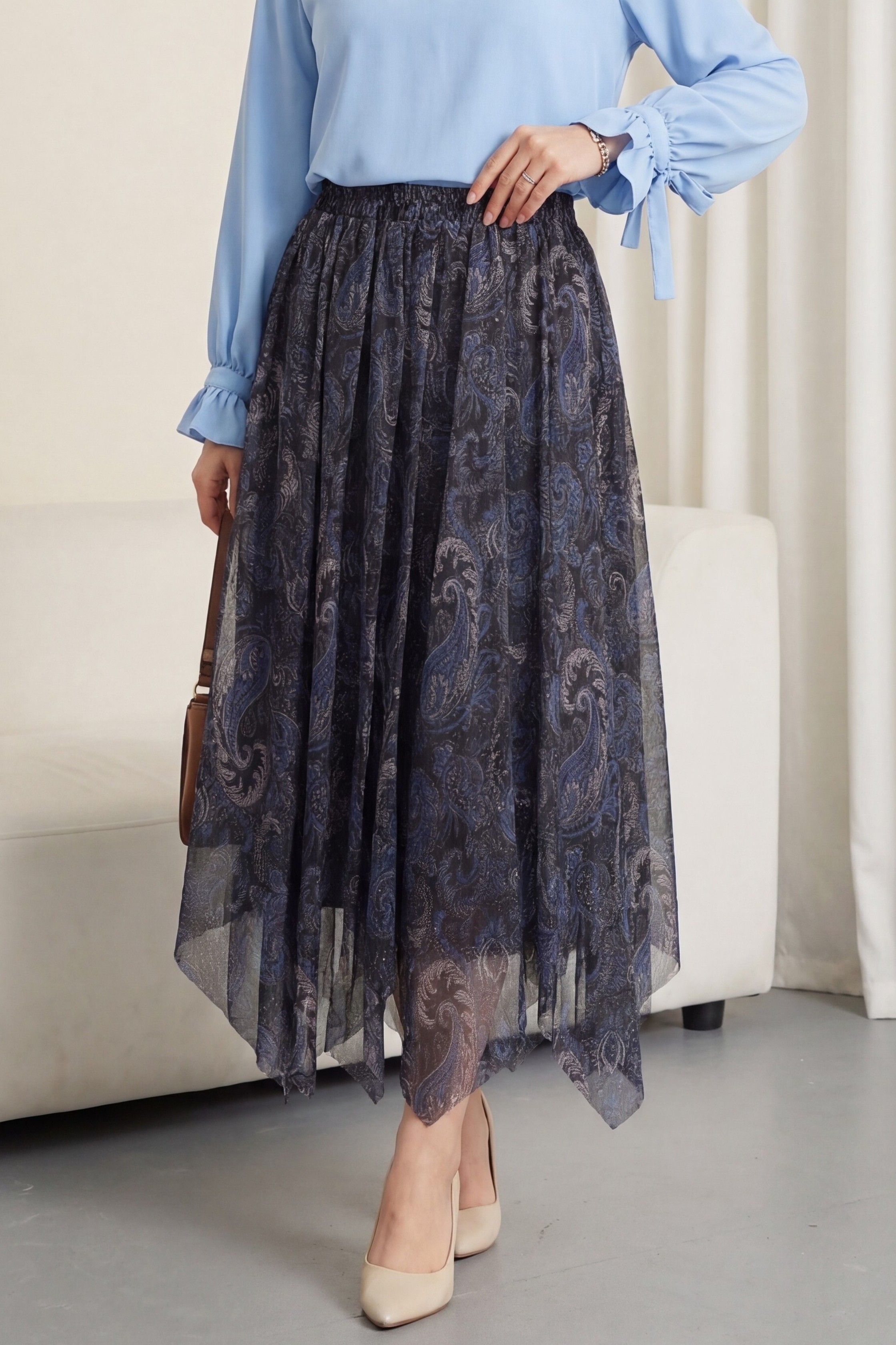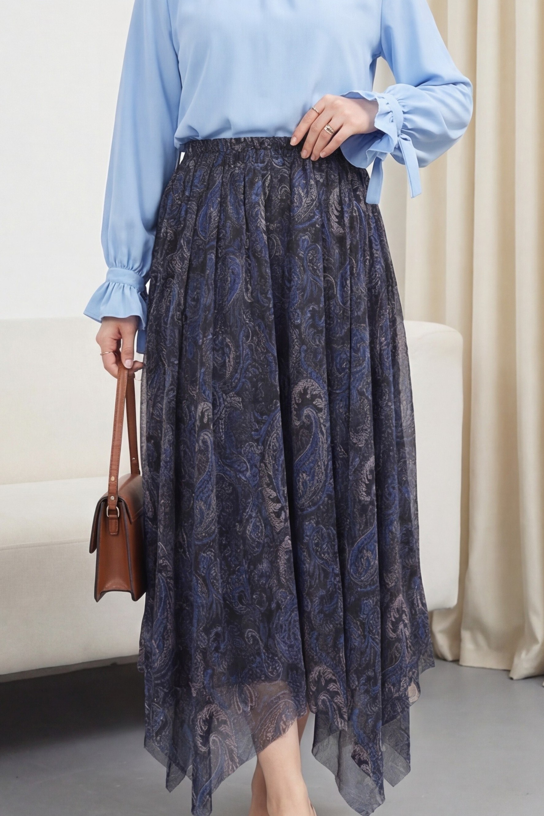 Patterned, Lined Chiffon Skirt with Elastic Waistband -Navy blue