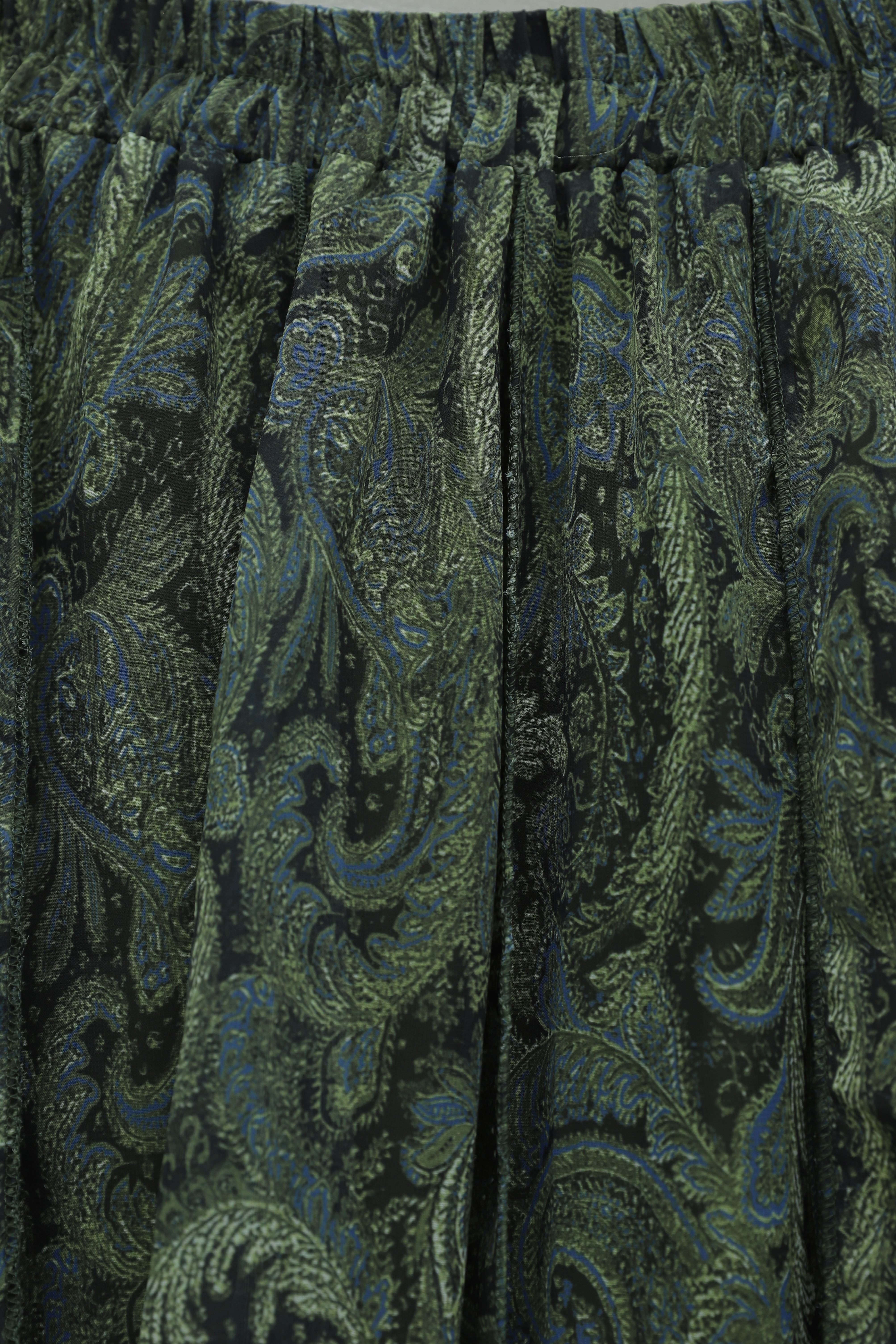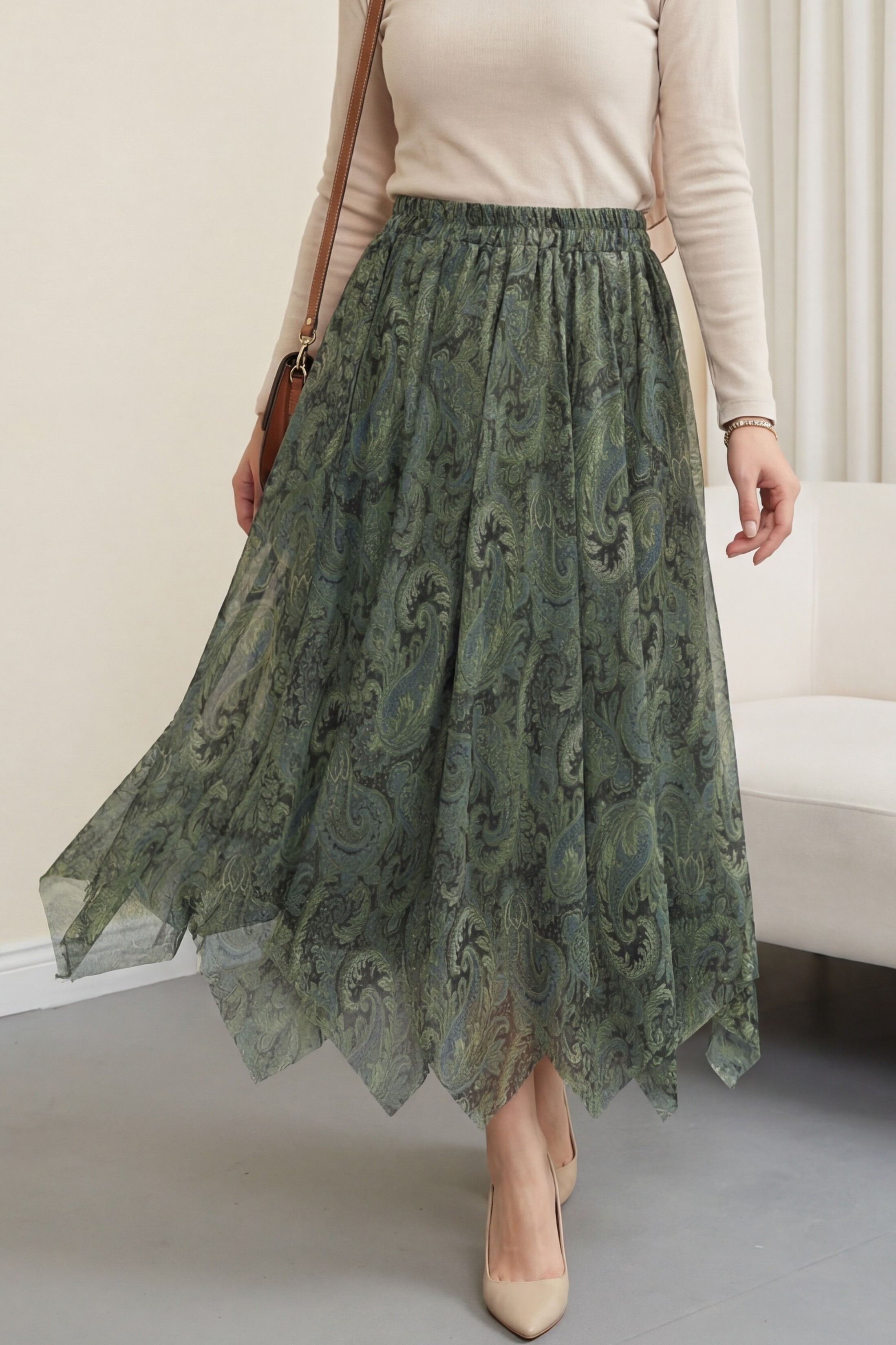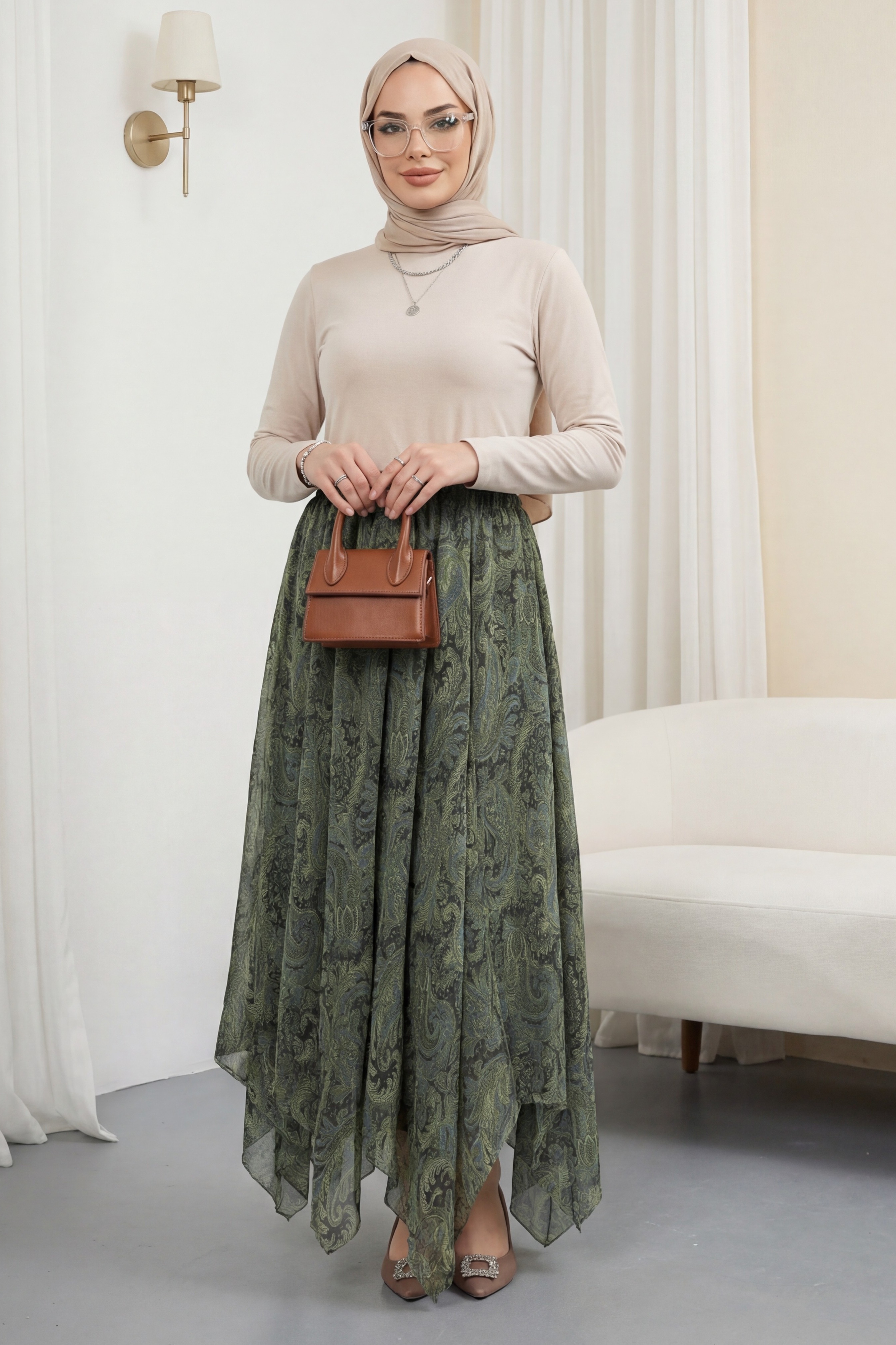 Patterned, Lined Chiffon Skirt with Elastic Waistband -Green
