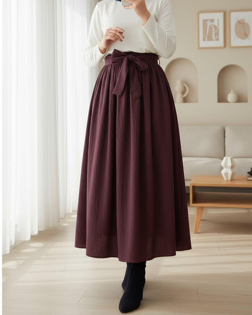 Pleated Belted Parachute Skirt -Cherry Color