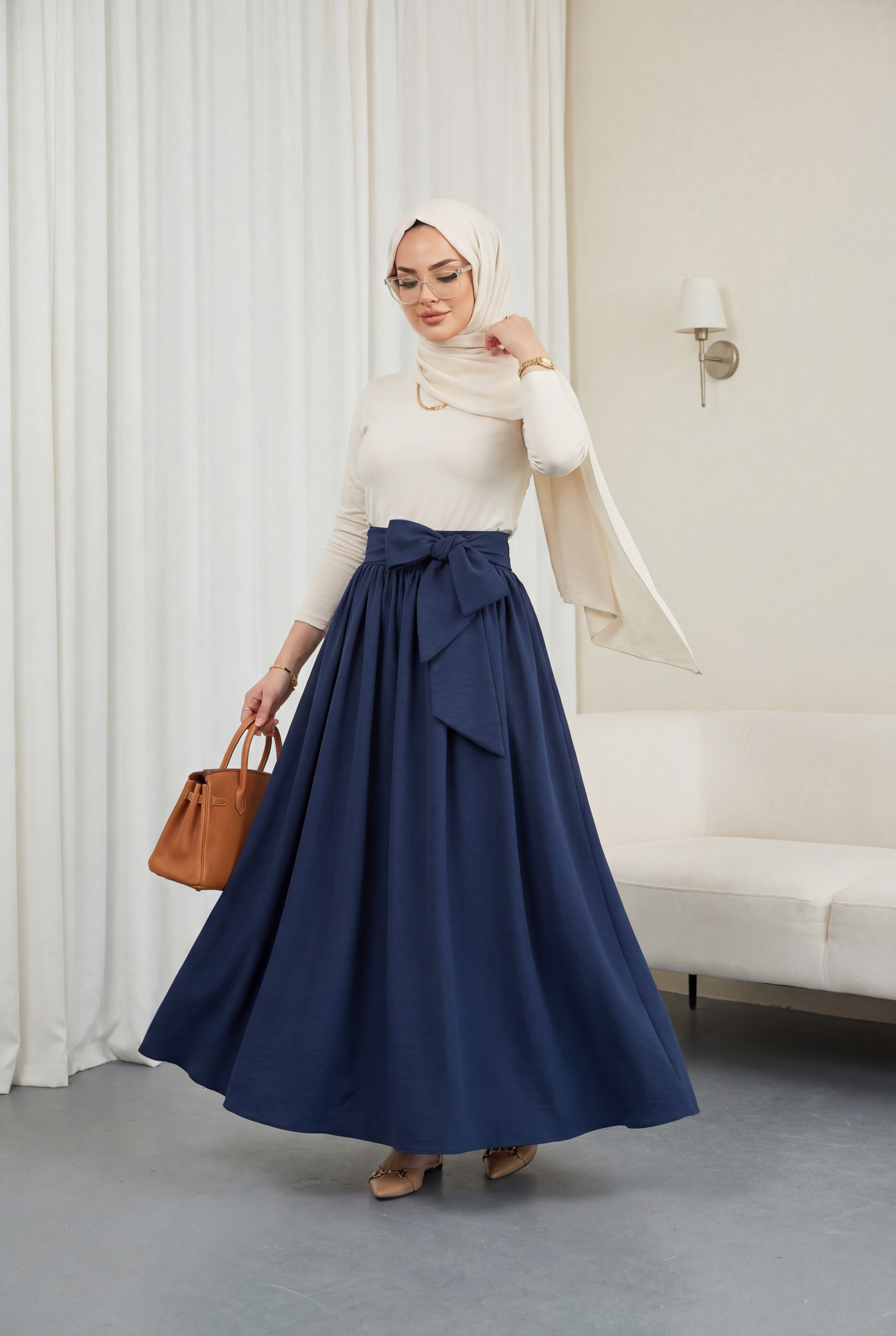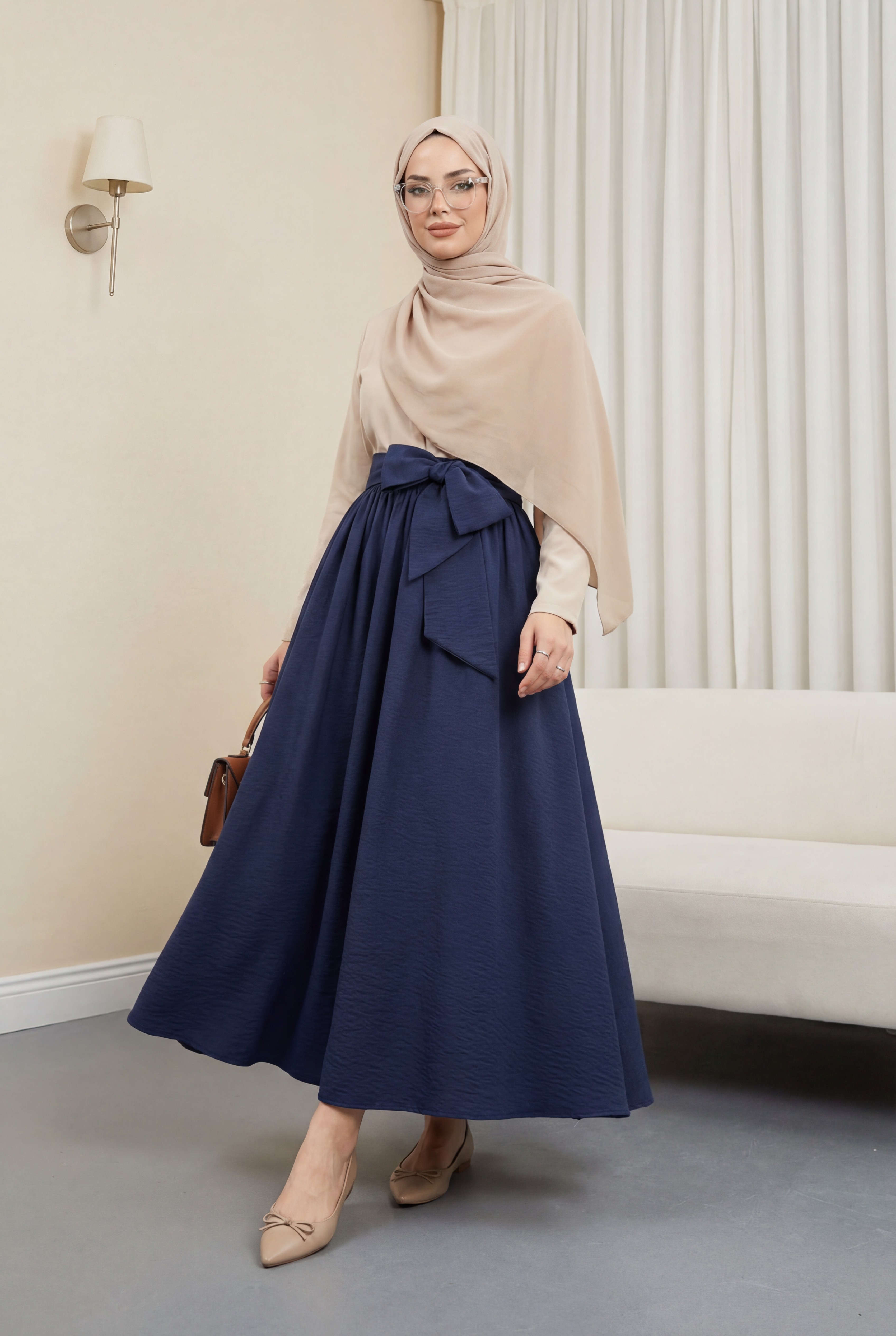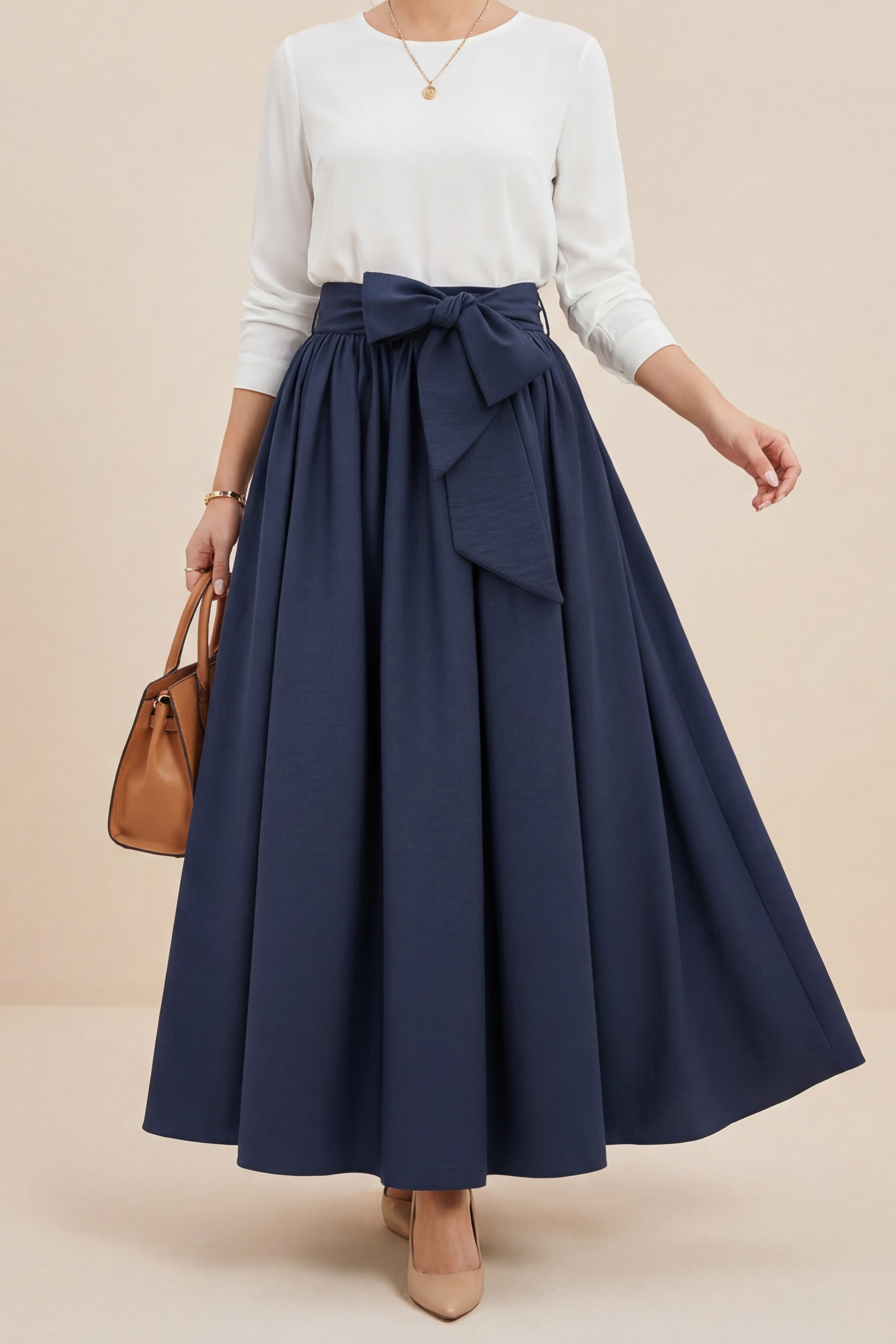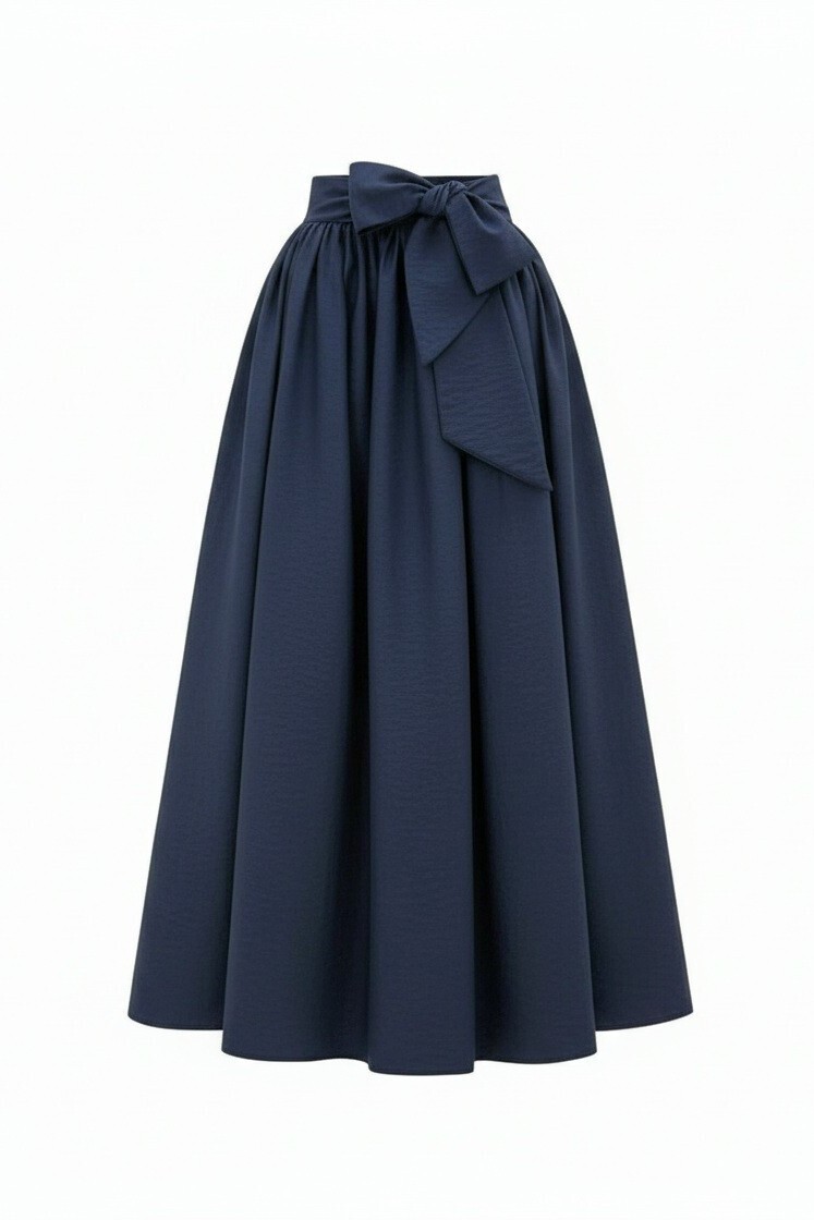 Pleated Belted Parachute Skirt -Navy blue