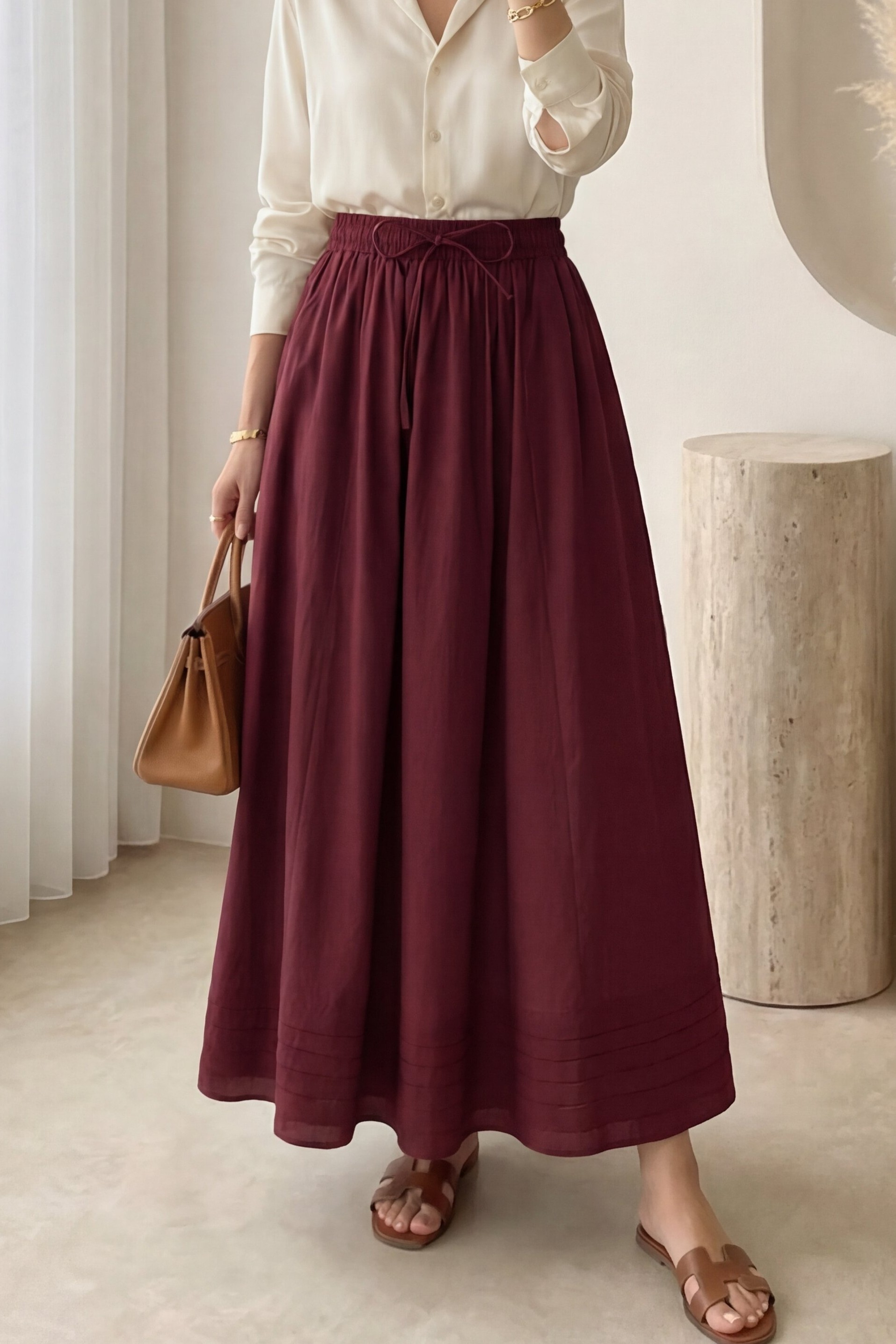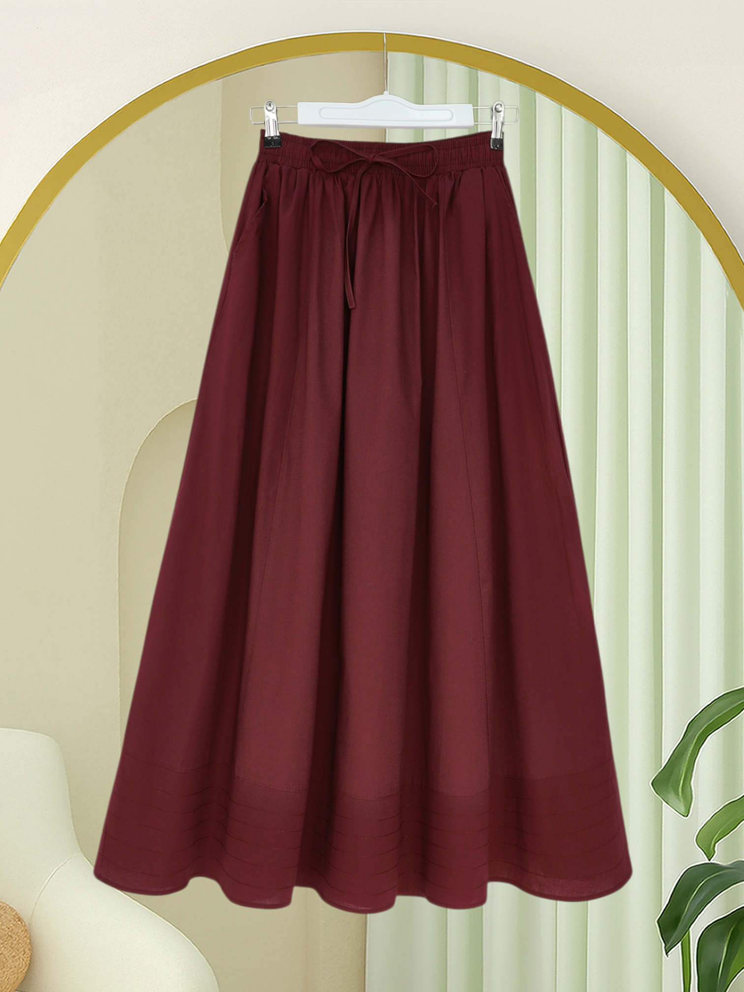 Skirt with Elastic Waist, Pockets and Stitching Details -Maroon