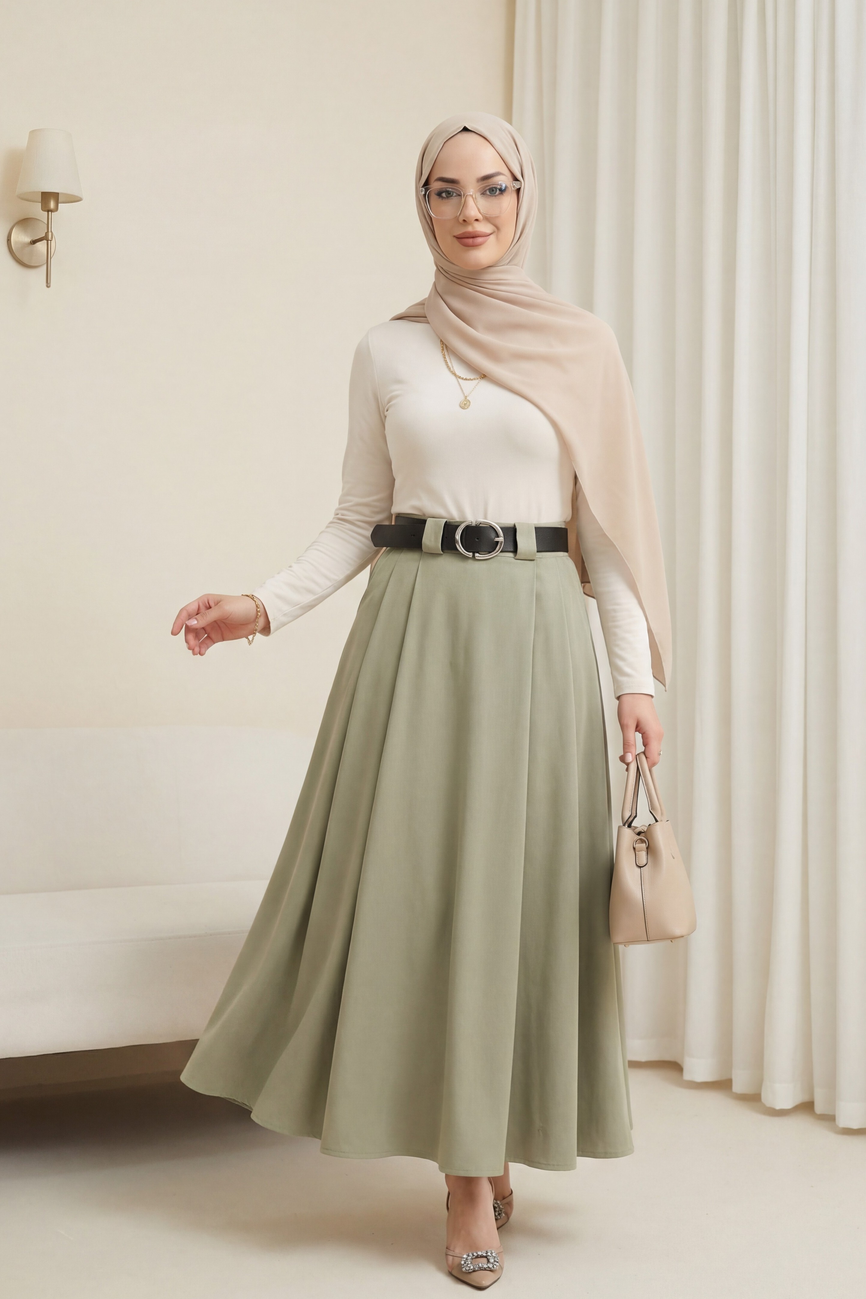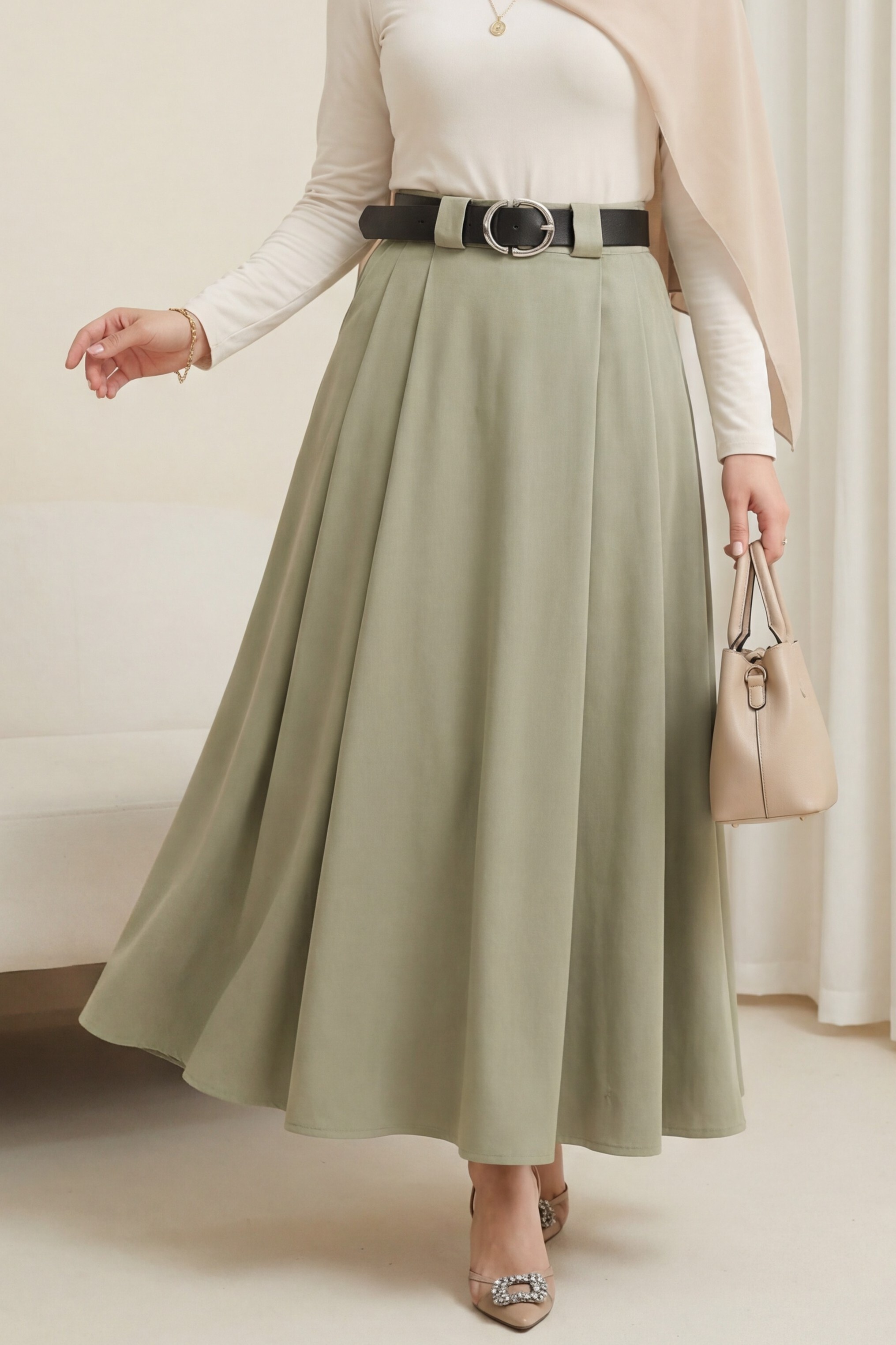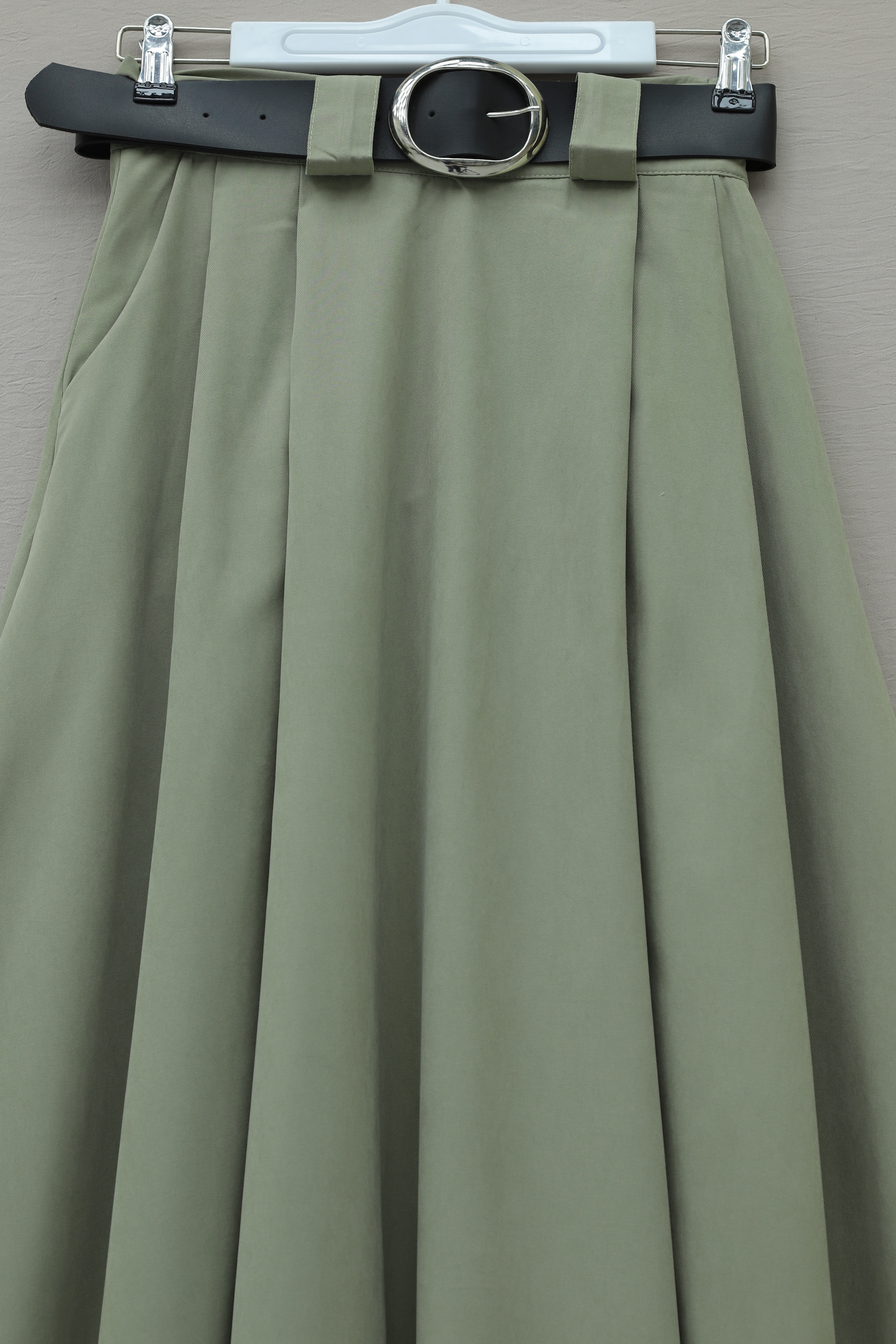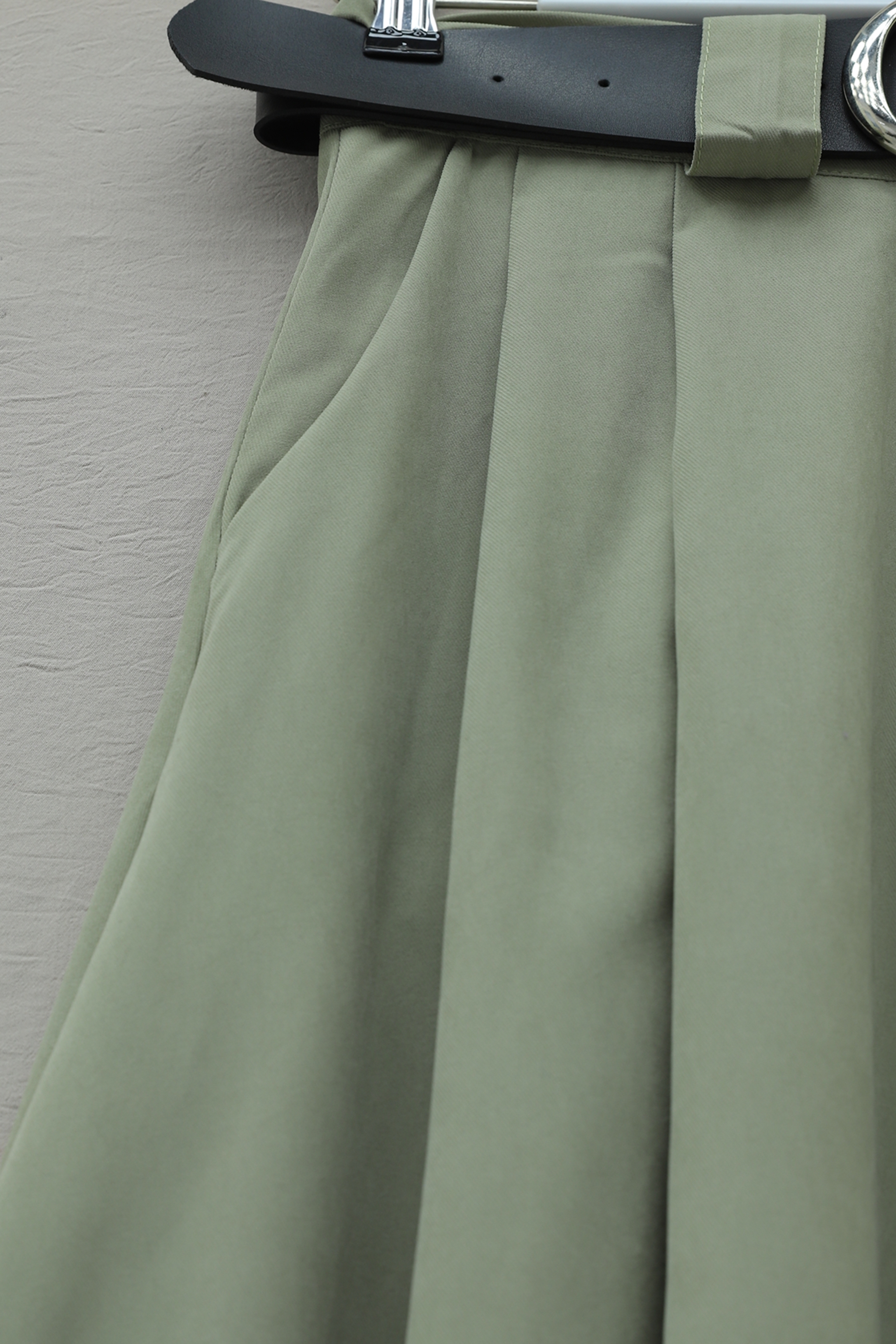 Thick Belted, Pleated Front, Side Pockets, Zippered Twill Skirt -Khaki