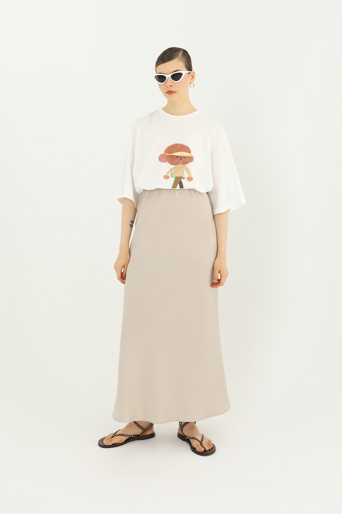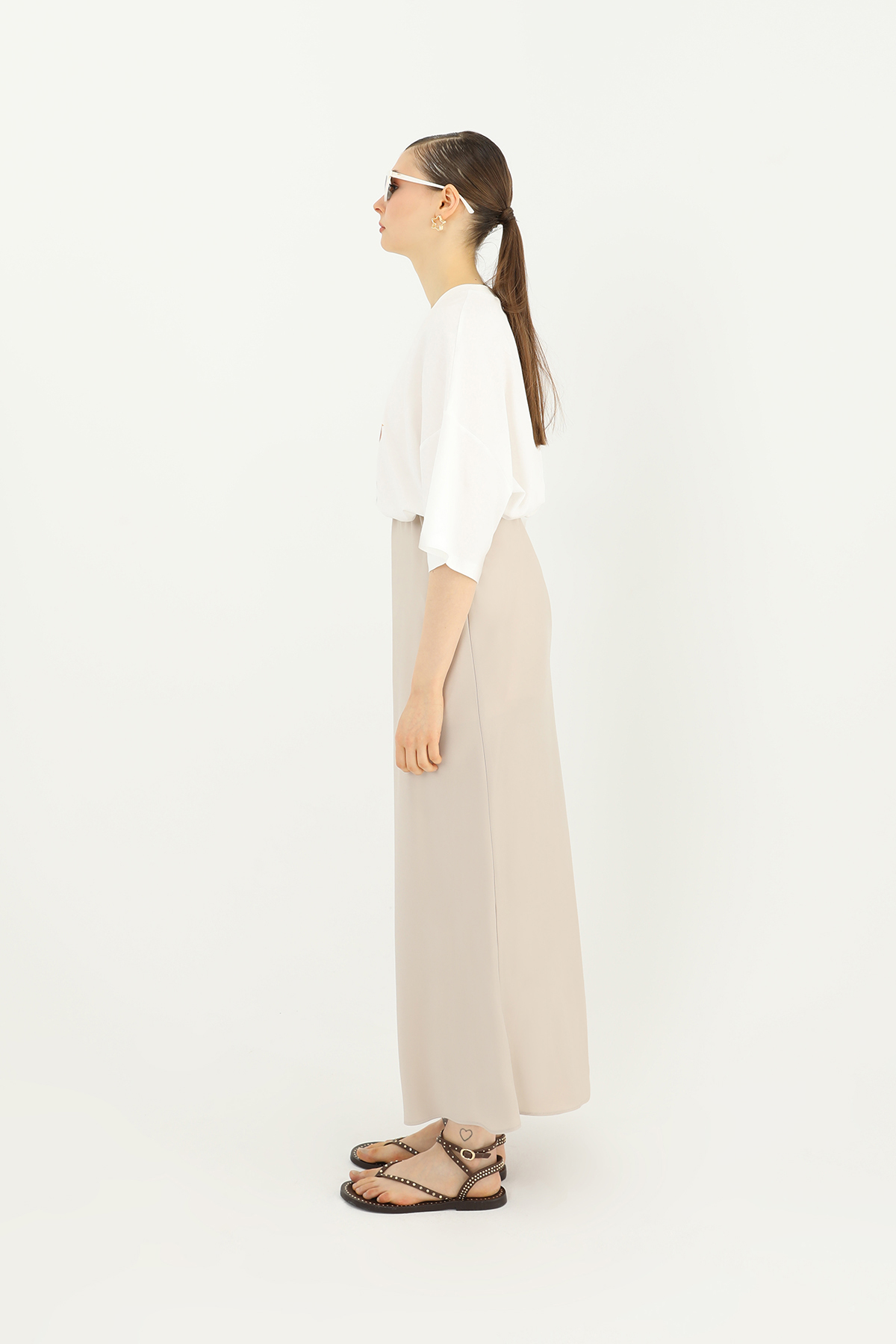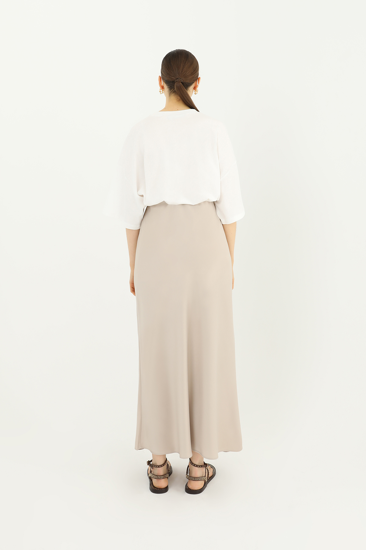 This elegant satin skirt, with its flowing texture and sophisticated look, is sure to be the star of your special occasions and evenings. Its long, straight cut offers both elegance and comfort.