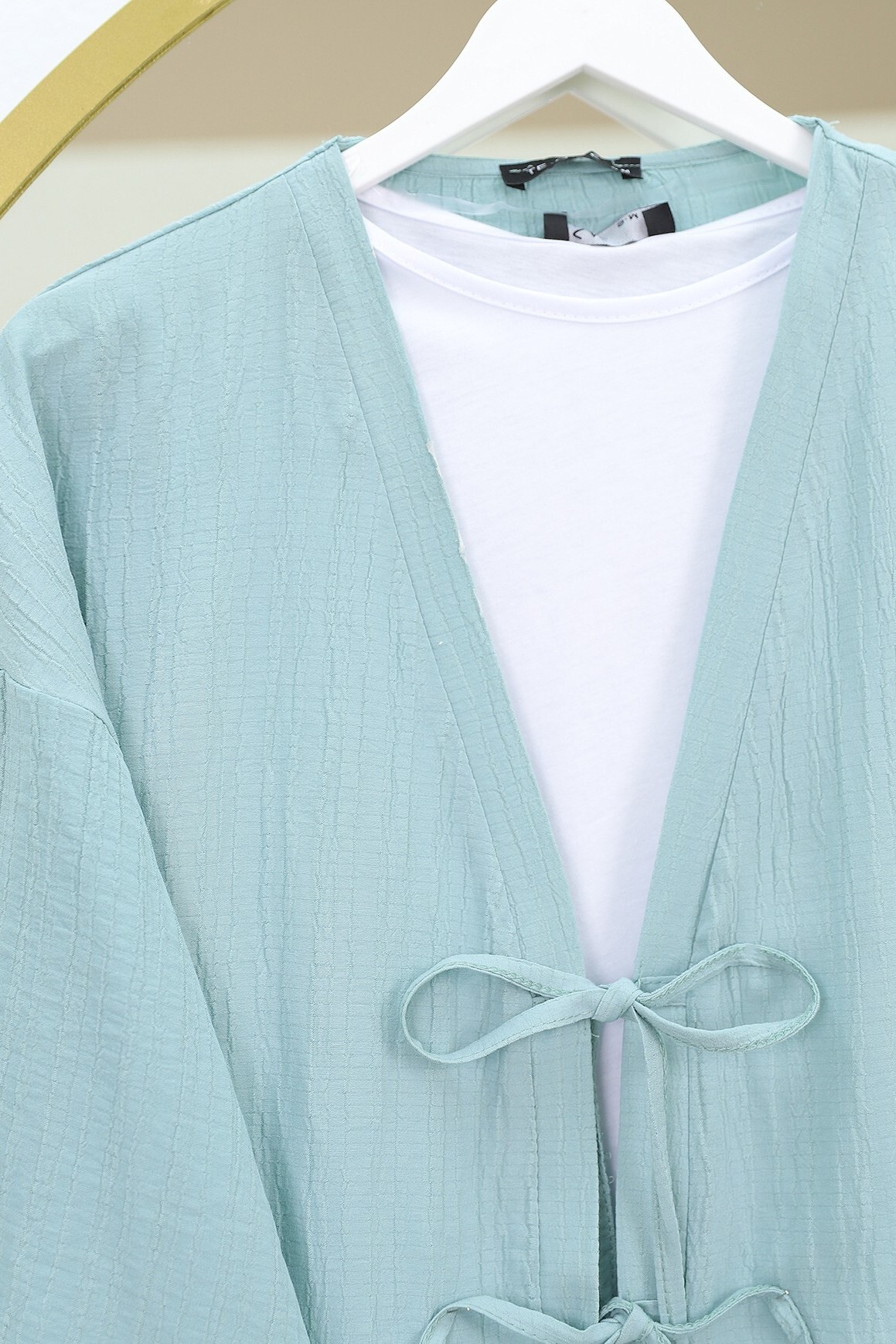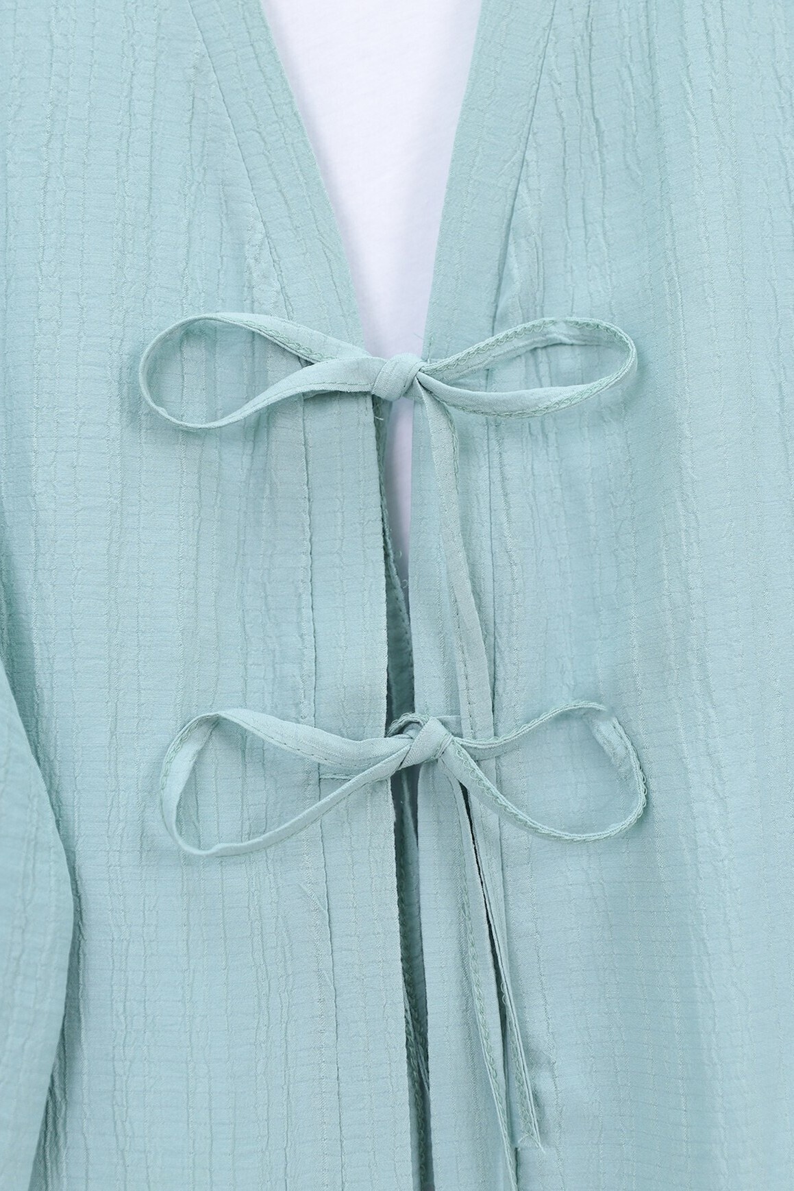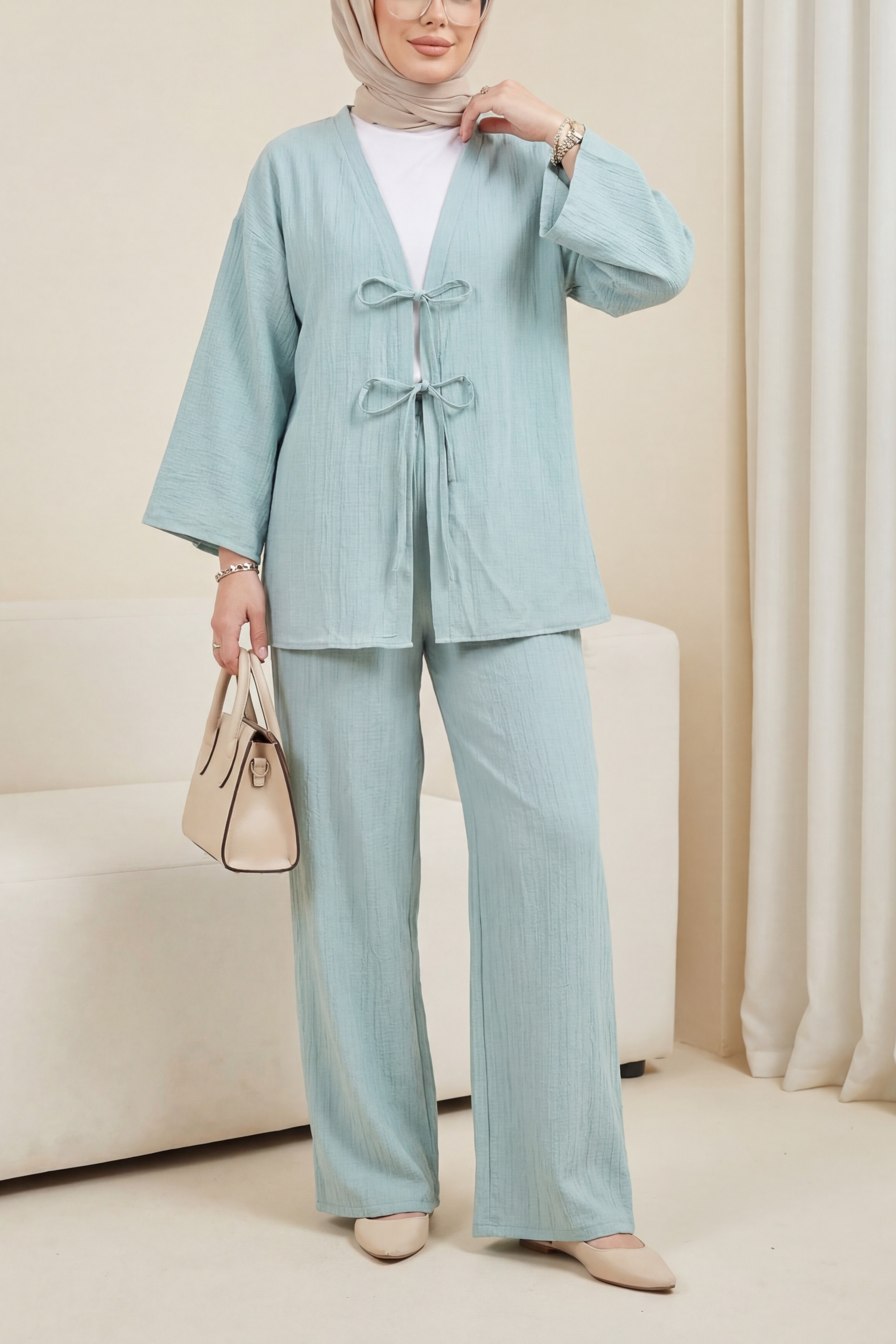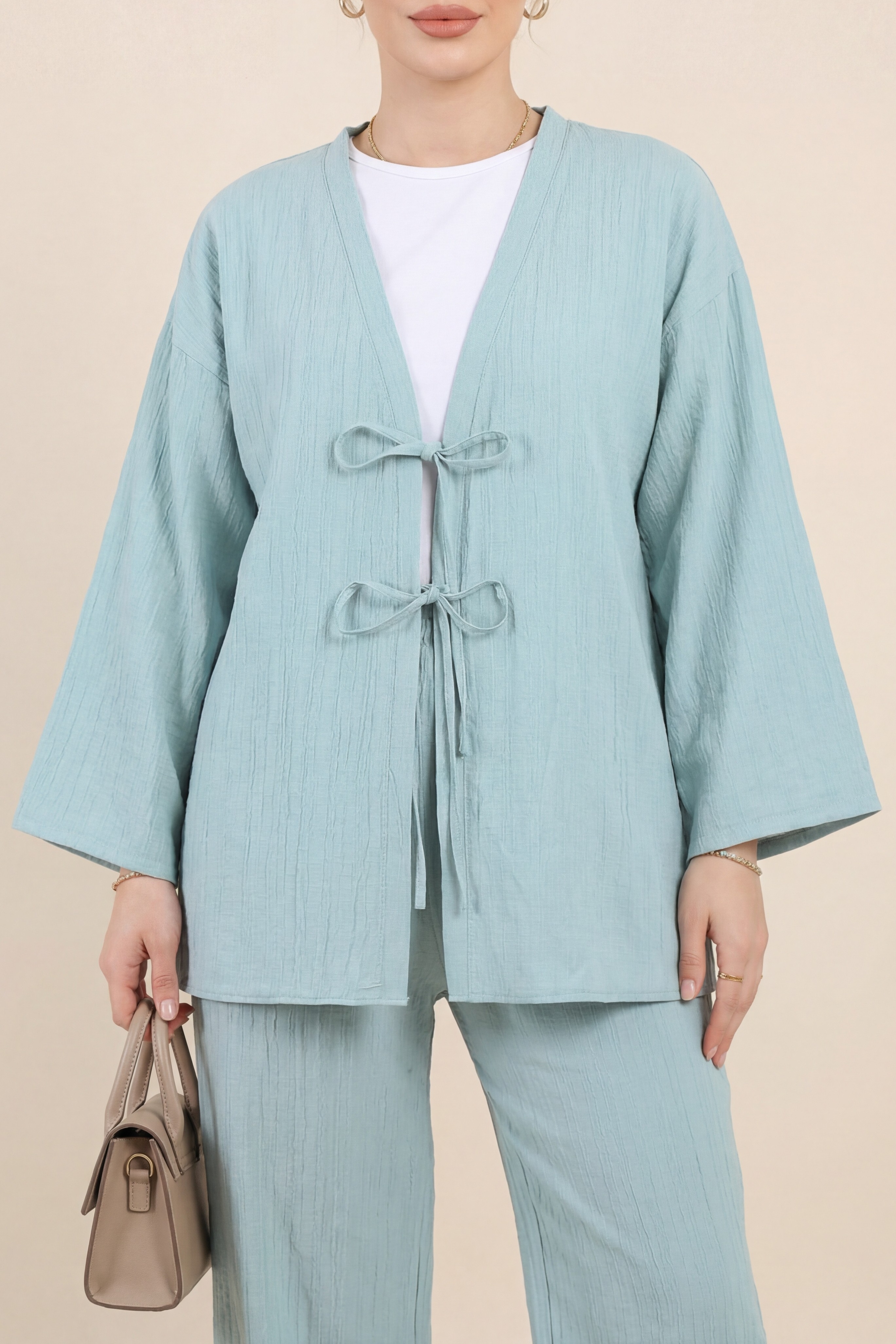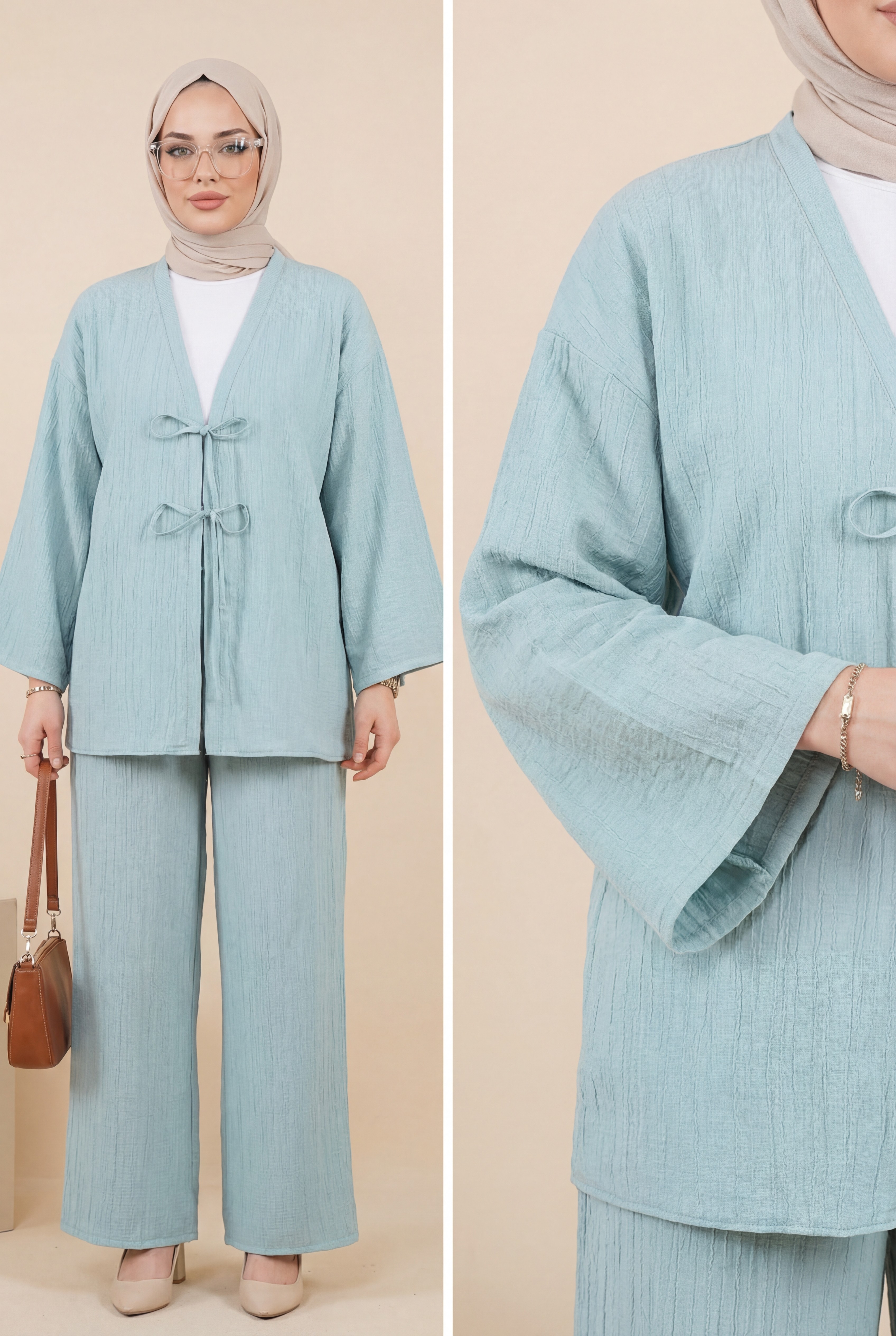 The double-tie front pants krinkle set offers a stylish and elegant look with its modern design. The double tie detail adds a sophisticated touch to both the pants and jacket. Made from krinkle fabric, it combines elegance and comfort, making it perfect for everyday wear. This set is ideal for both office and special occasions, adding a touch of class to your wardrobe.