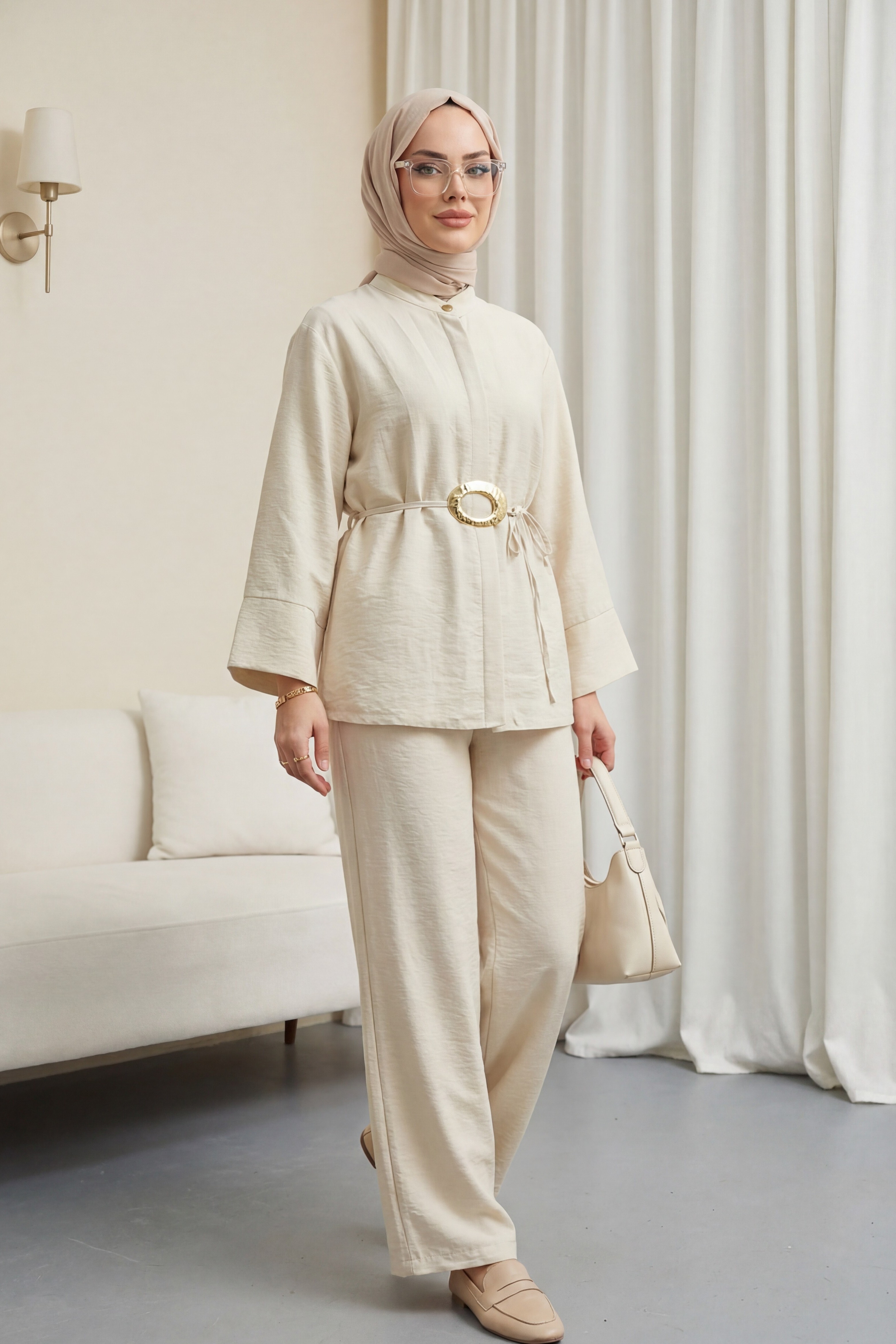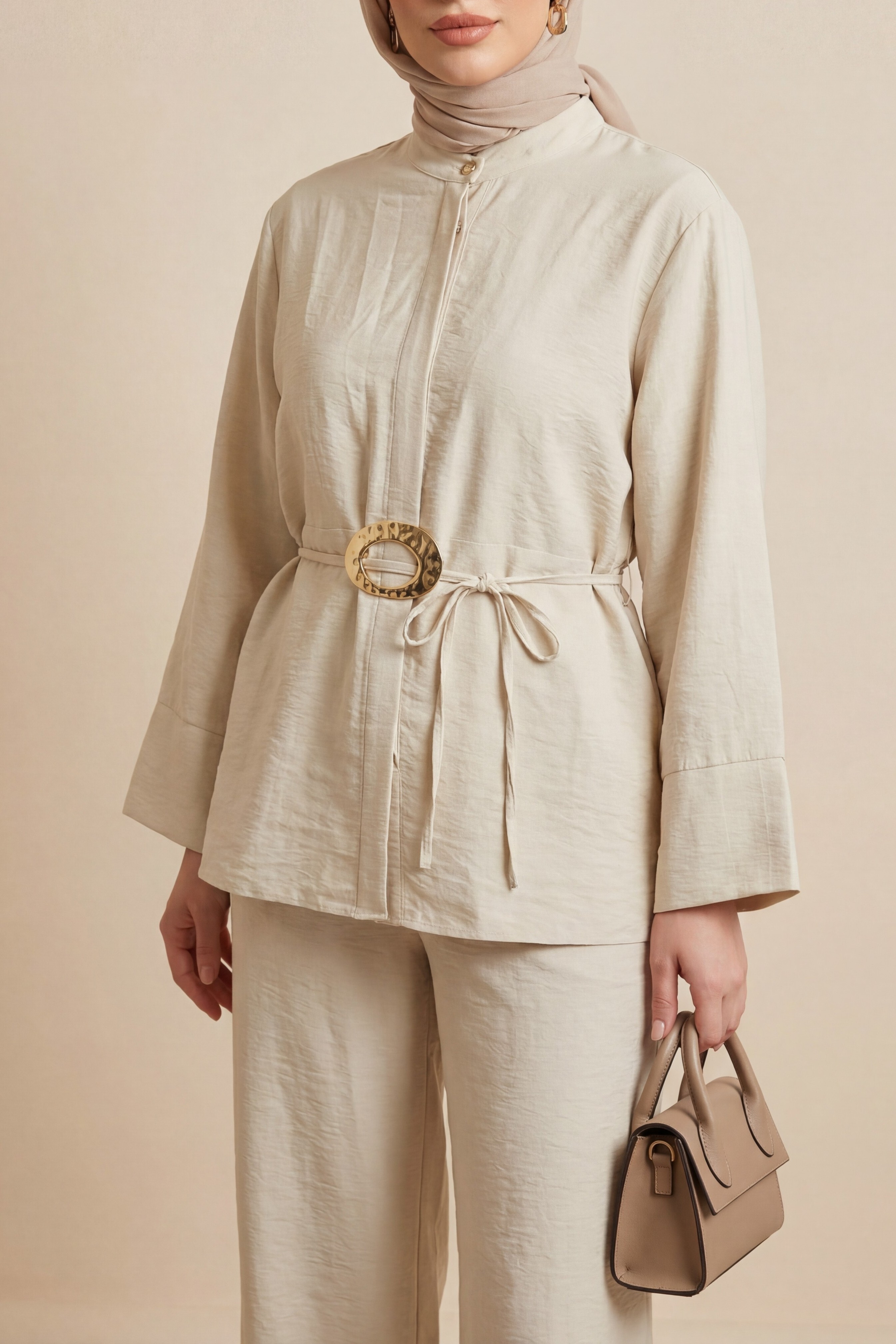 Cupra Suit with Belted Half-Button Trousers - Beige