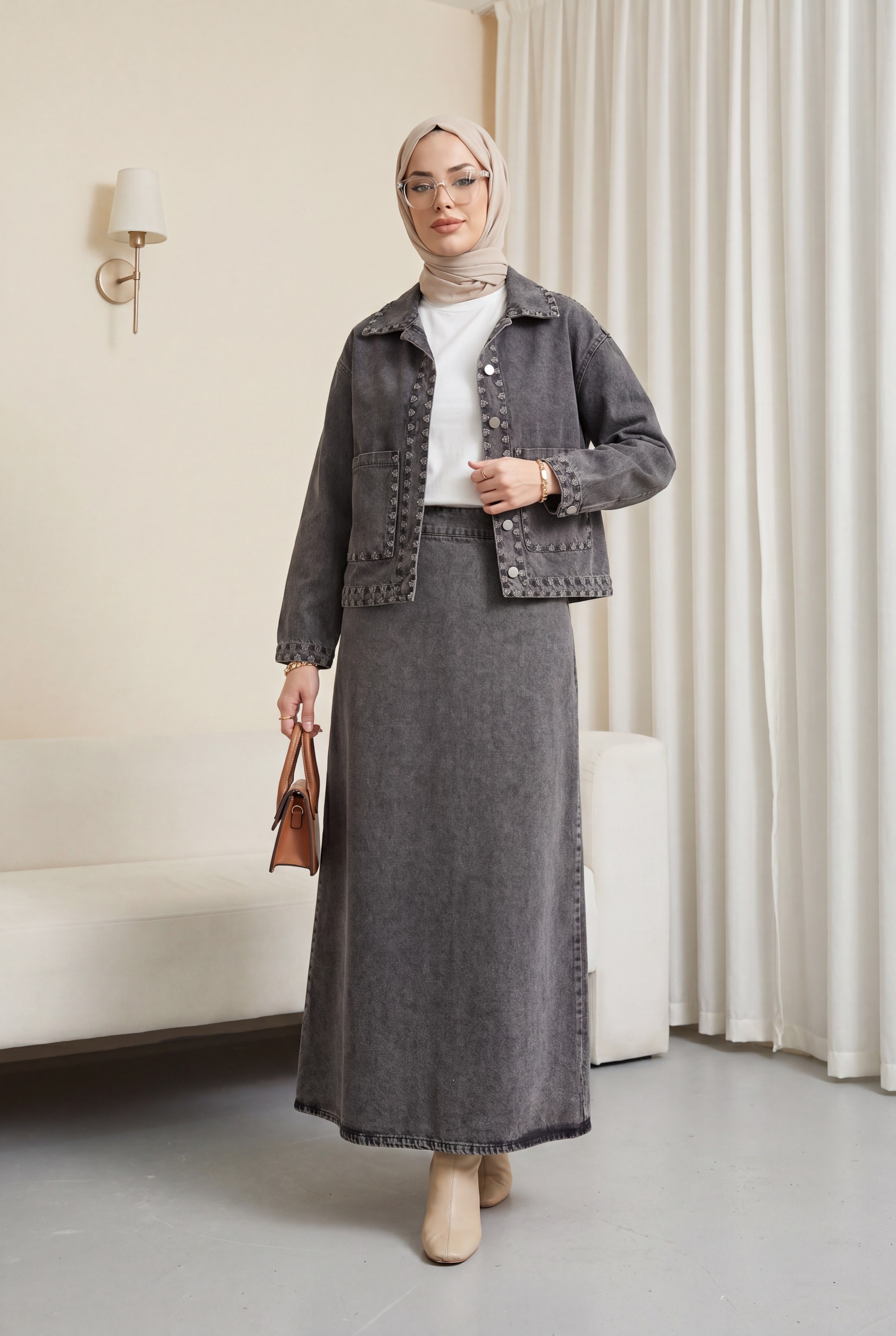 Denim Skirt Set with Embroidered Details, Double Pockets, and Button-Front Closure. -Smoked