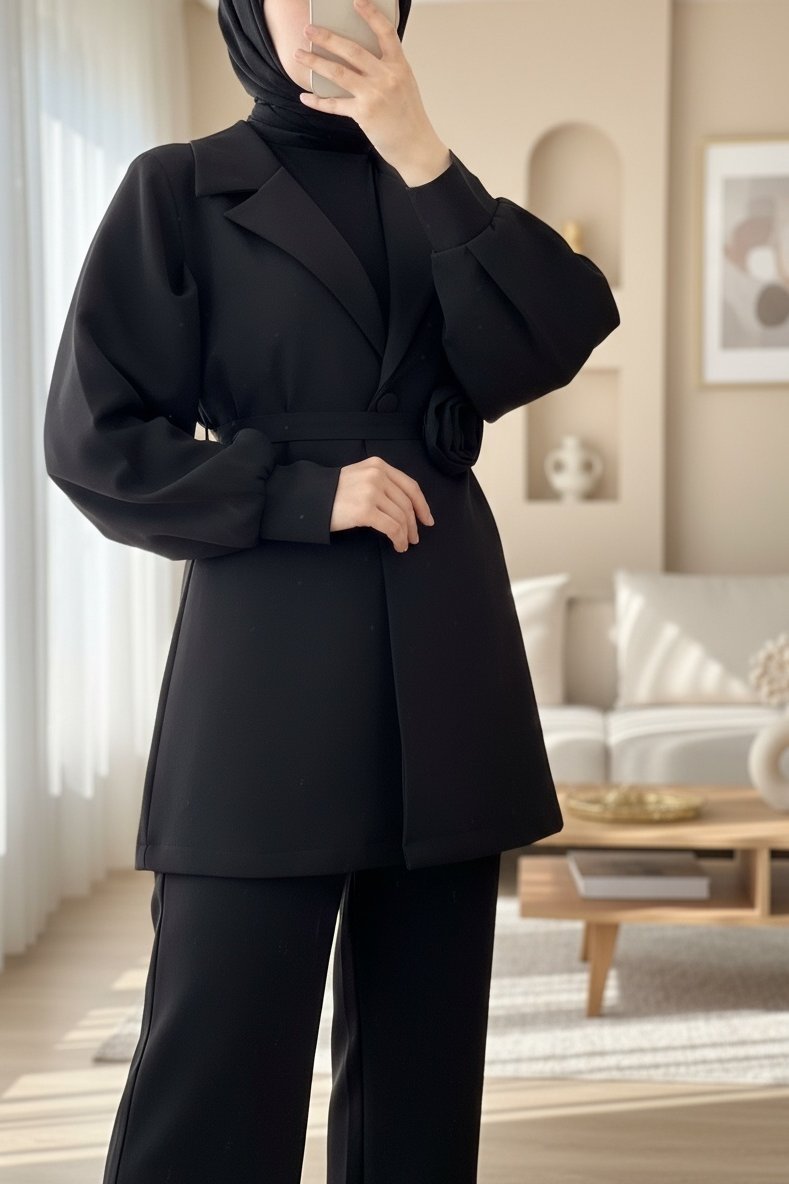 Double Breasted Jacket Trouser Set with Rose Belt Detail -Maroon